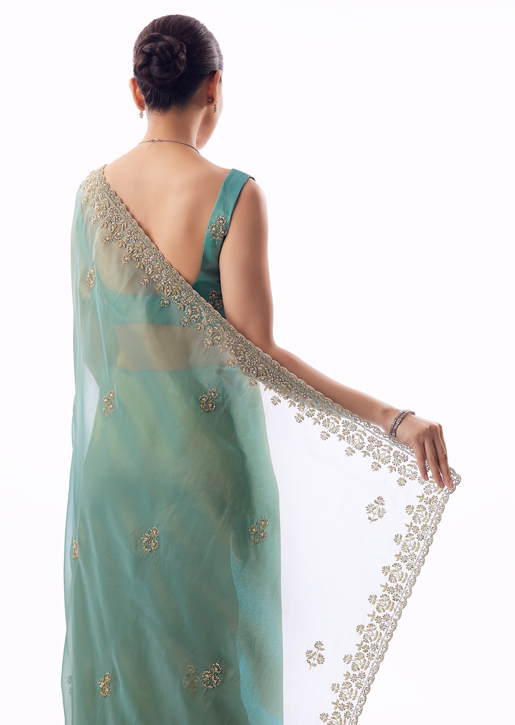 Fit Tips:Tissue sarees look best with structured pleats and a fitted underskirt to enhance the fall.