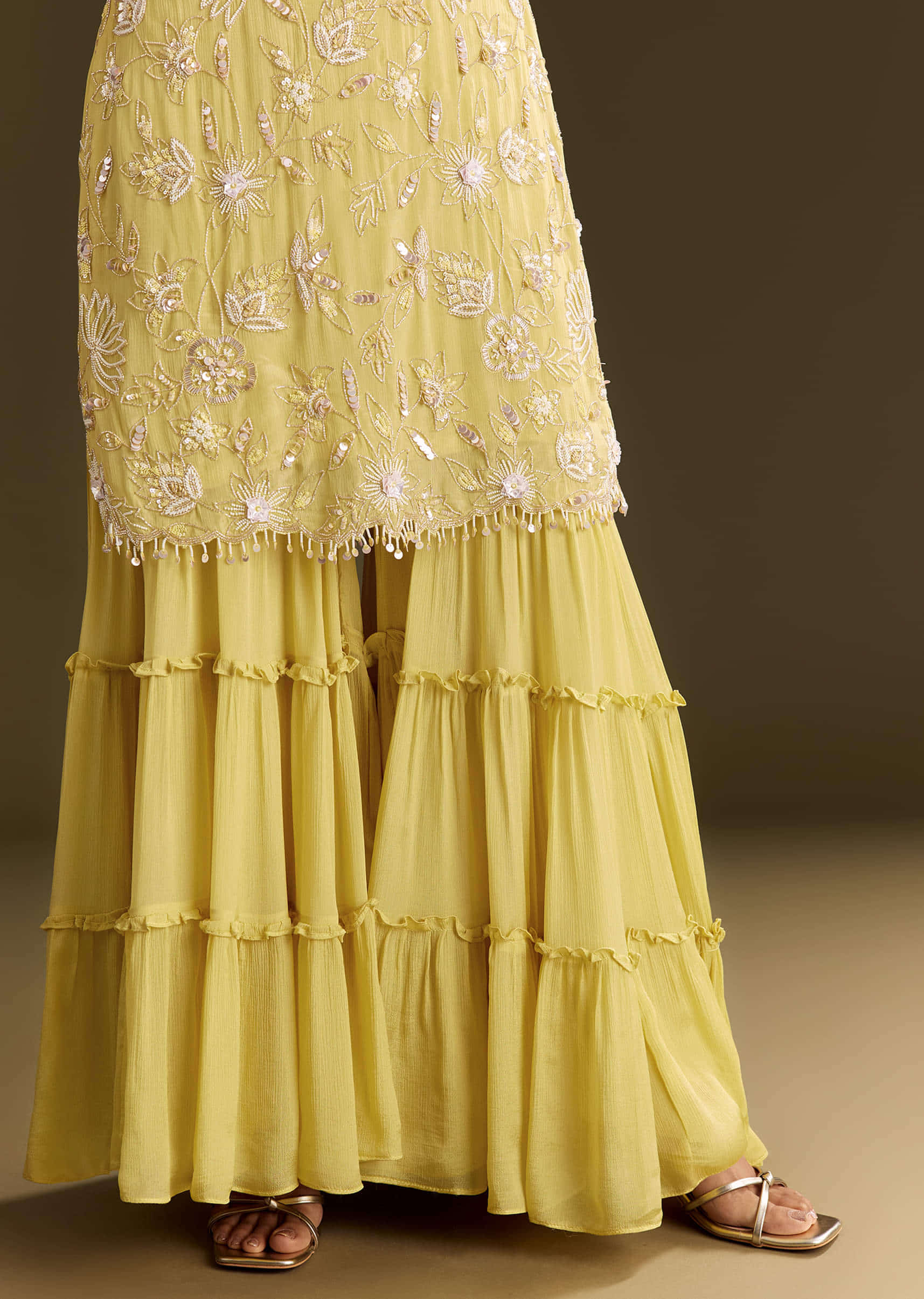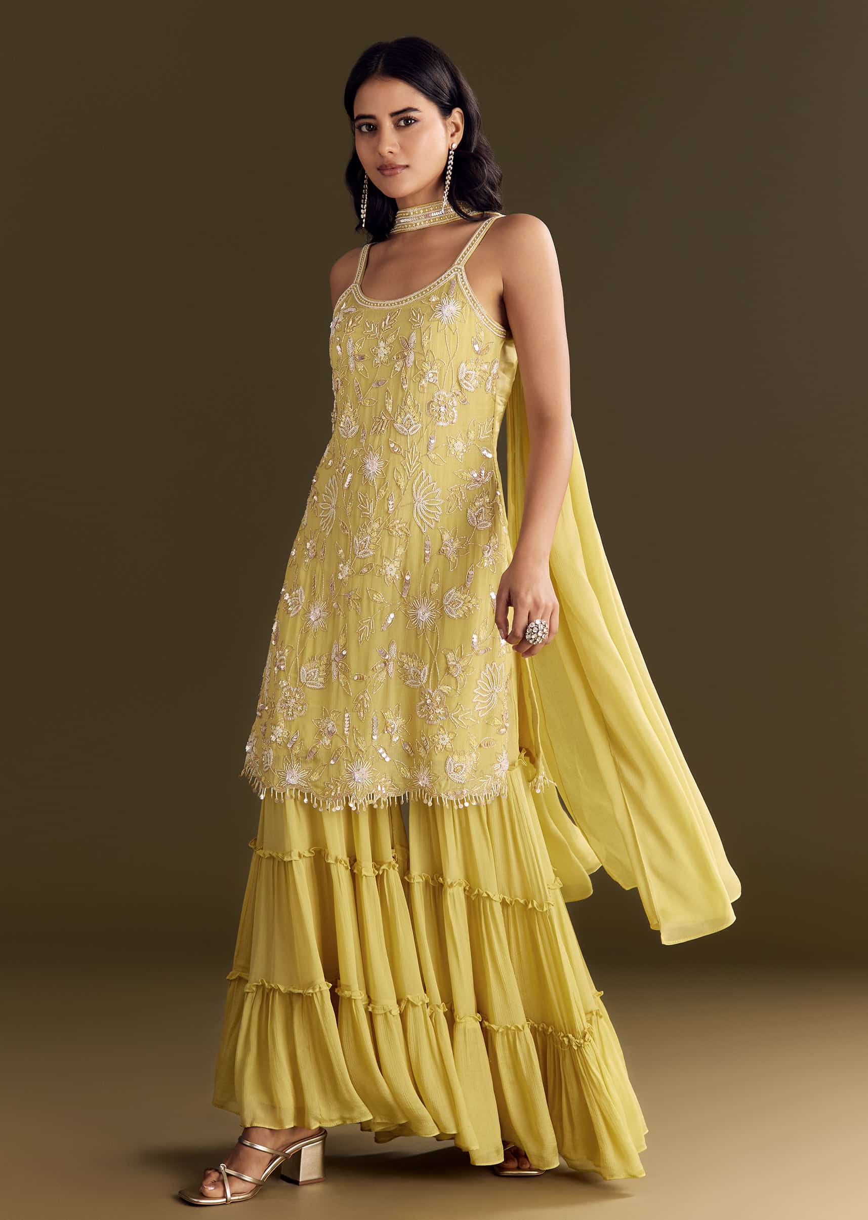 This light yellow kurta set brings sunshine to mehendi celebrations, styled with a choker dupatta embroidered with sequins and cut dana. Standard length of Sharara is 40" Awarded as the... More Product Details