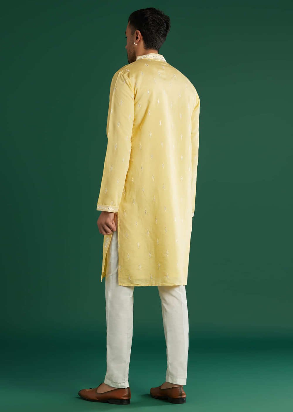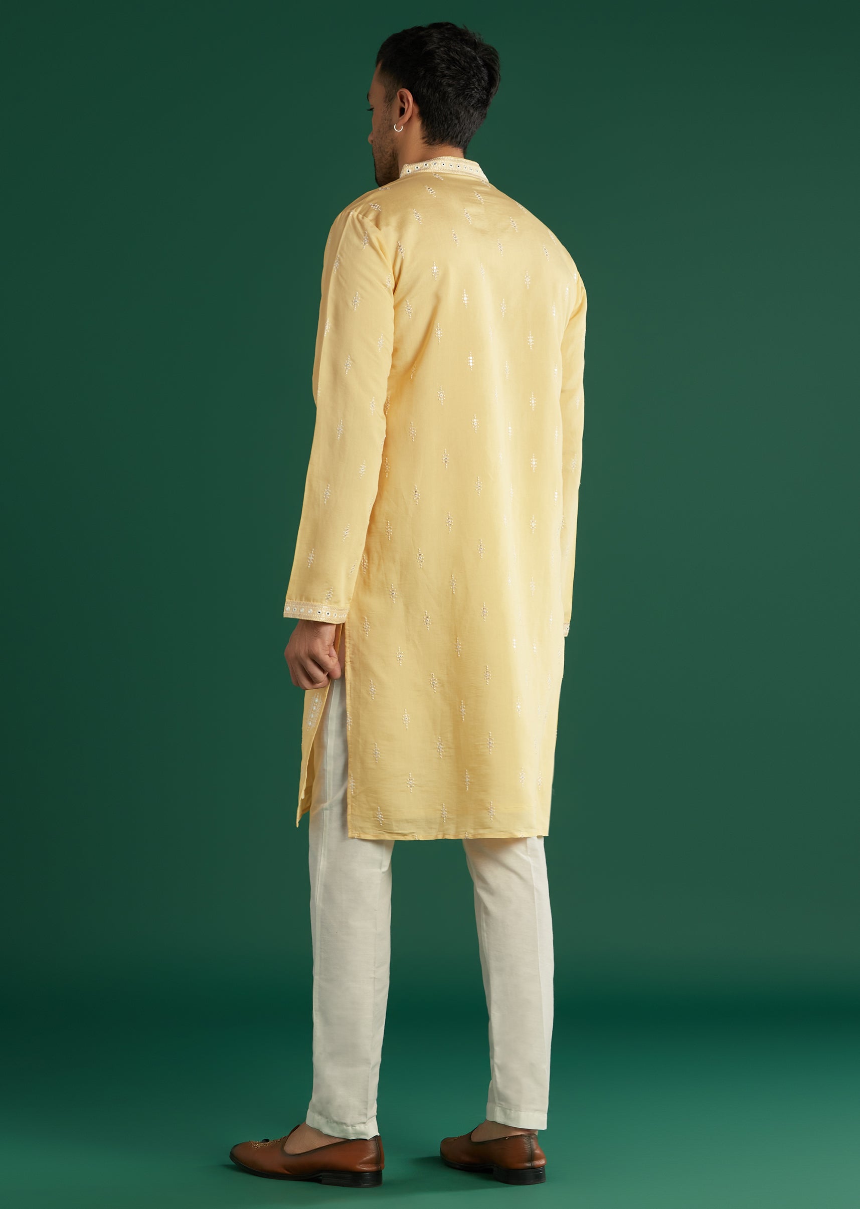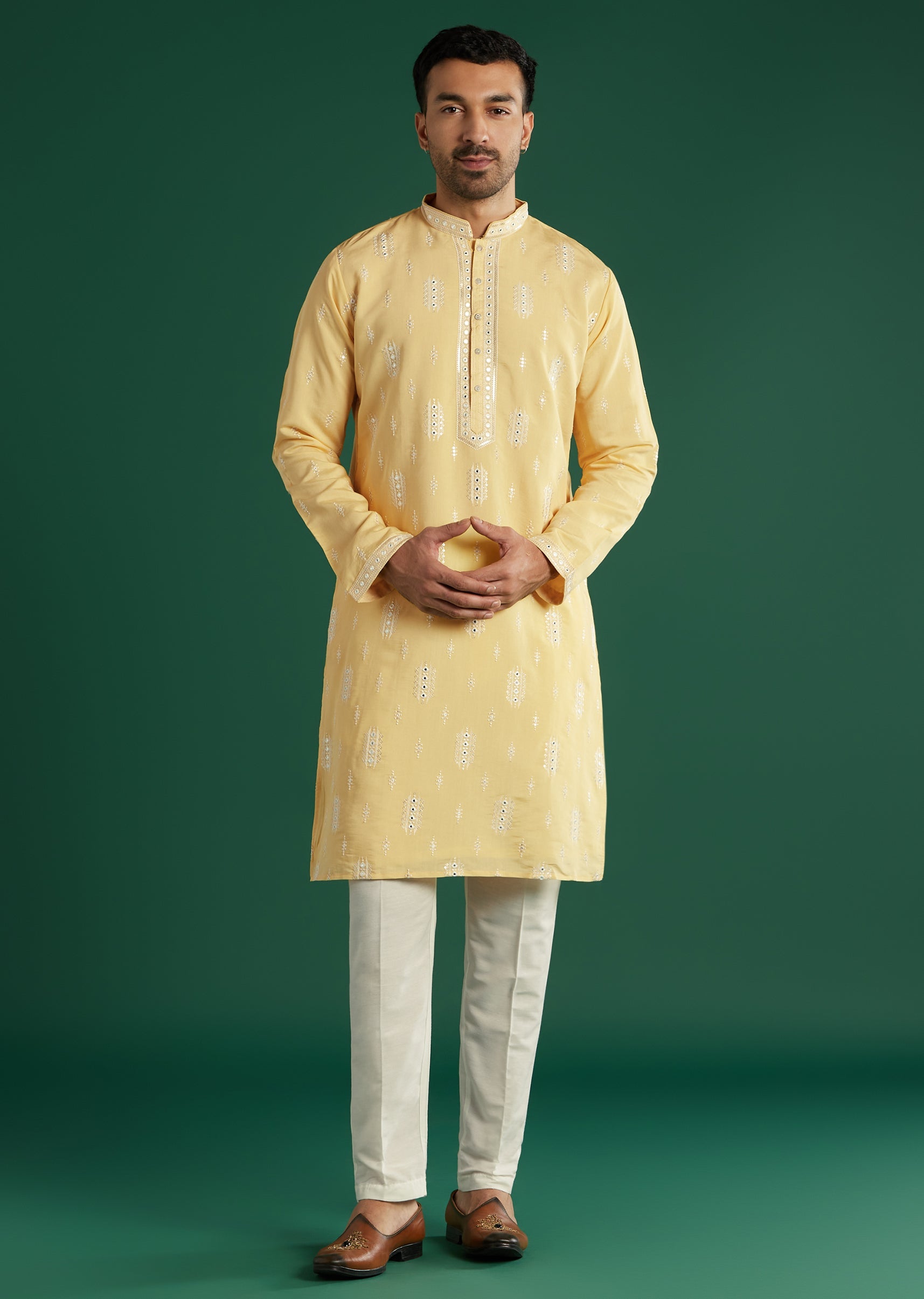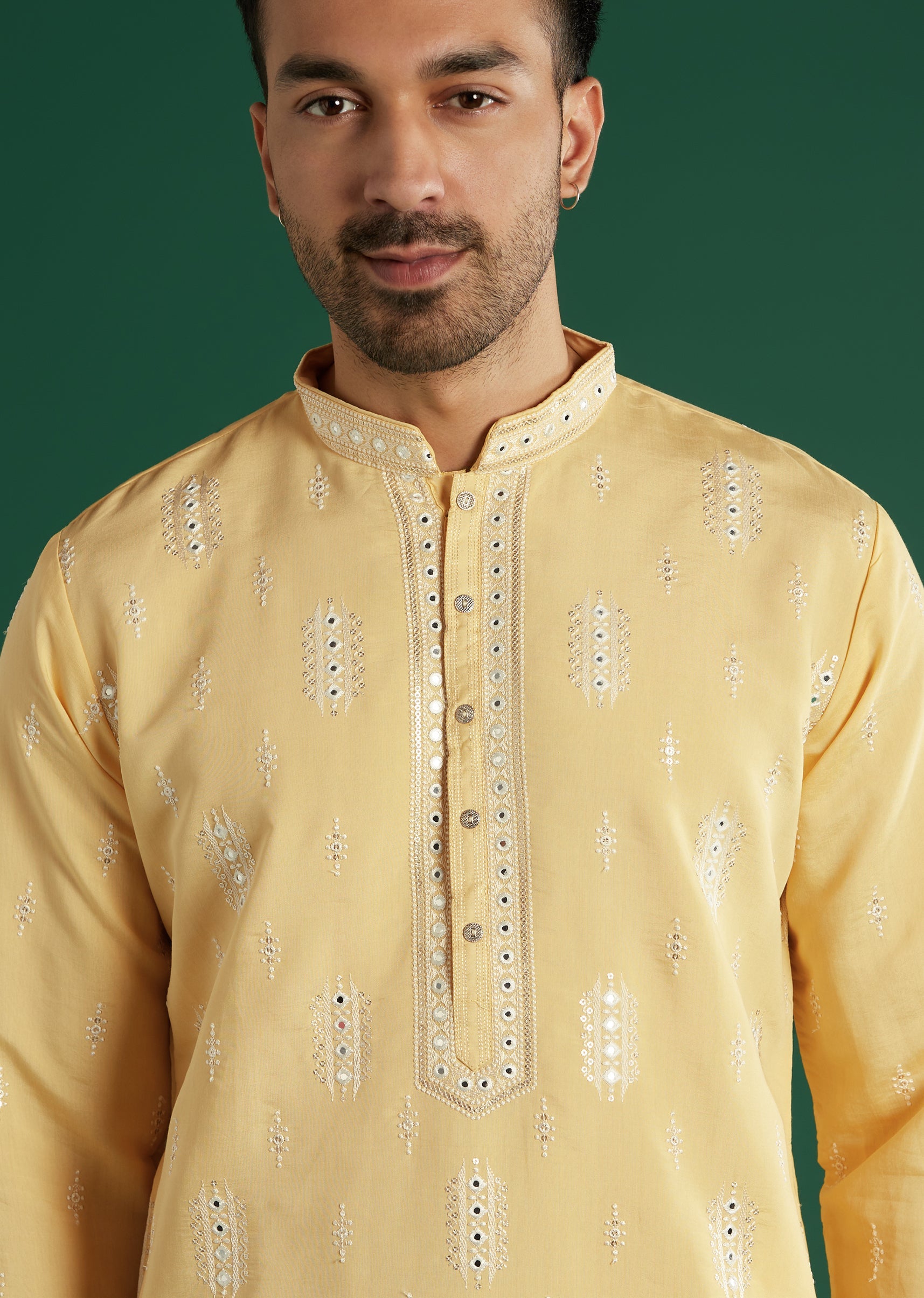 Light Yellow Silk Kurta Set For Men With Mirror And Resham Embroidery