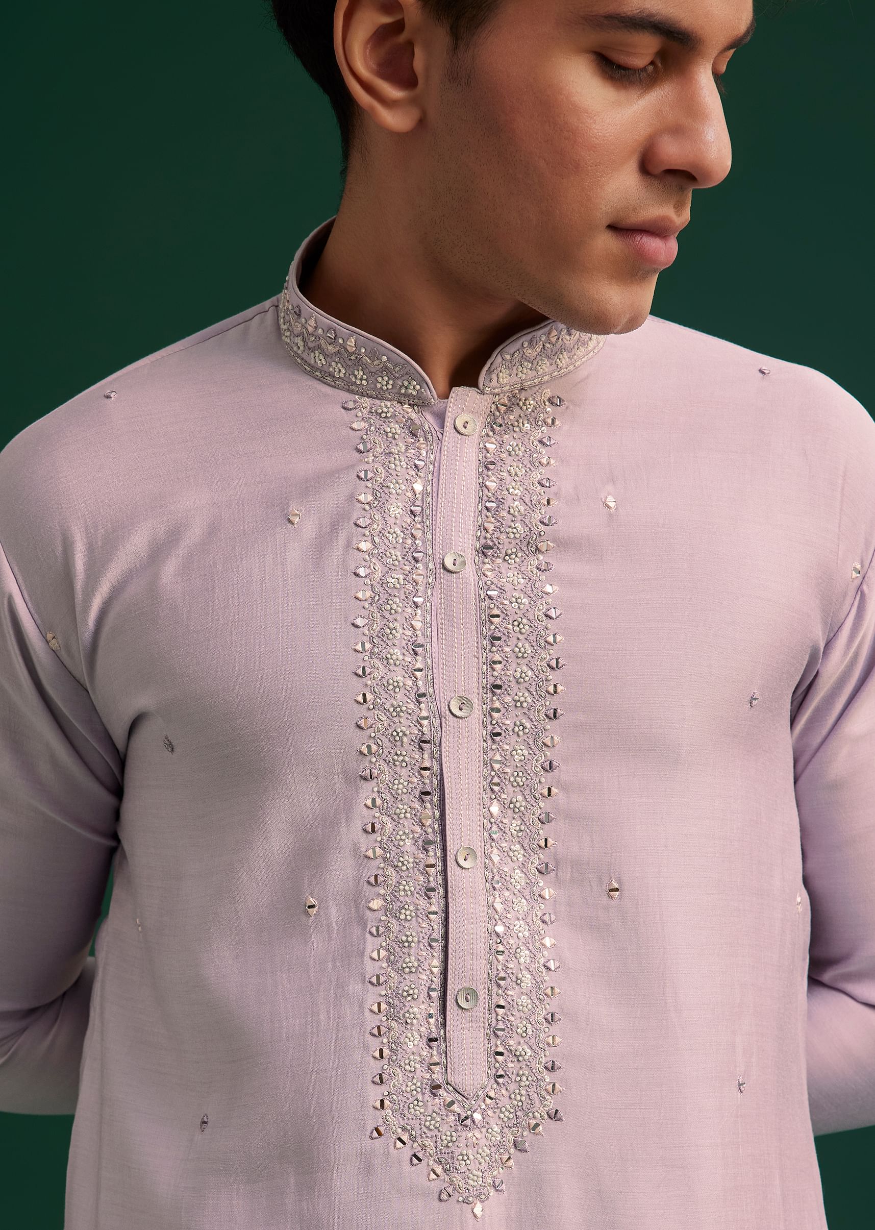 Elevate Your Festive Wardrobe With This Lilac Silk Kurta Set Featuring Exquisite Hand Embroidery On The Yoke That Exudes Refined Elegance. The Intricate Detailing Showcases Delicate Pearl Sequin And Resham... More Product Details