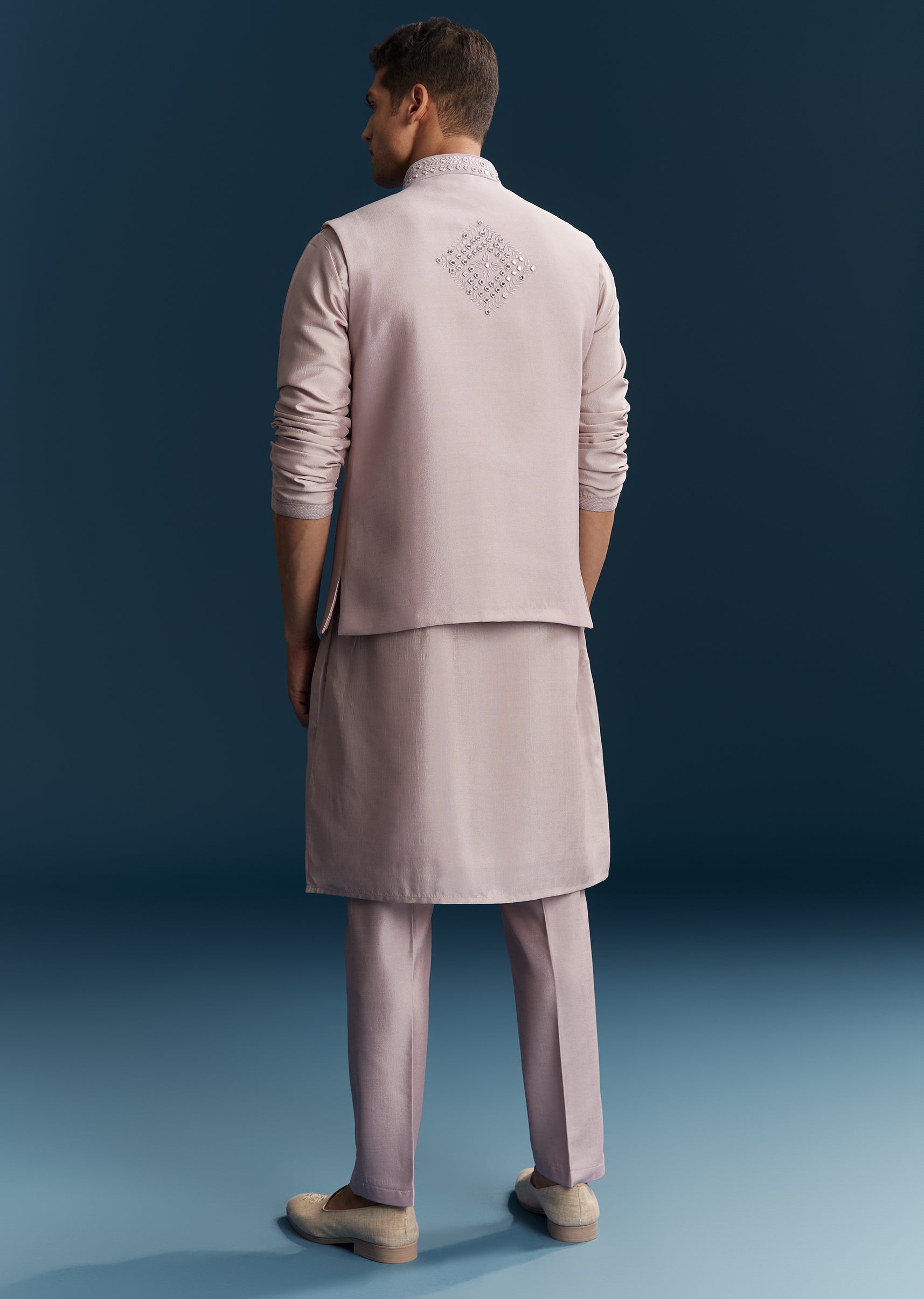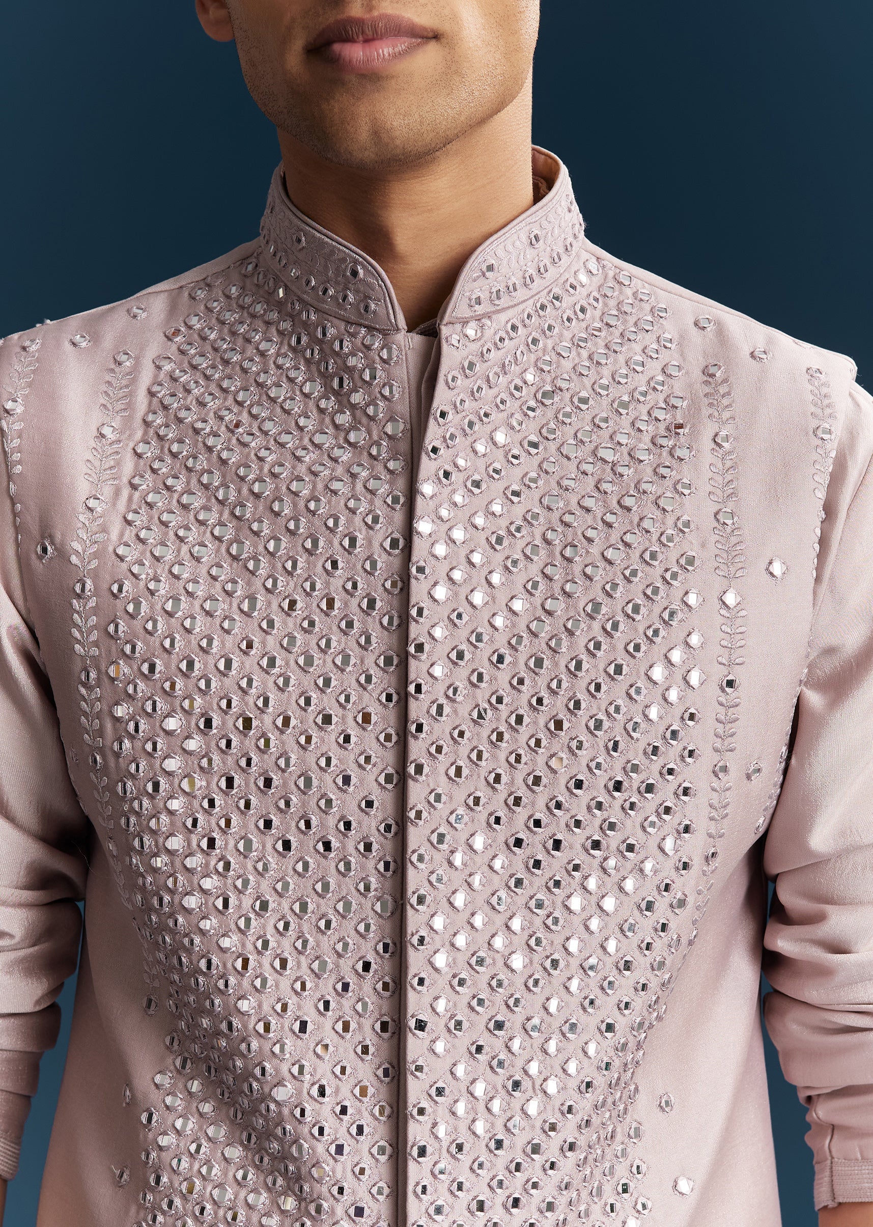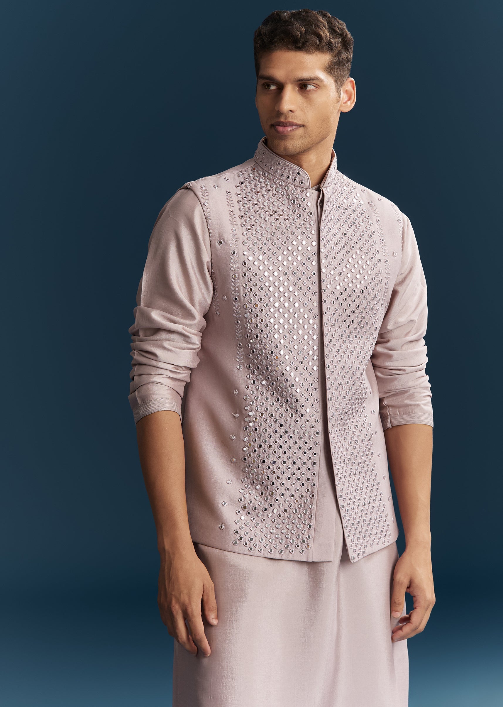 Delicate and festive, this lilac kurta jacket set in soft pastels is perfect for mehendi, reception, and other celebratory occasions. Crafted in smooth silk fabric, it features intricate thread work paired with mirror detailing that adds sparkle and elegance. The mandarin collar and full sleeves create a structured and polished silhouette, making it ideal for a groomsman or the groom’s brother. Designed to combine style and comfort, this outfit ensures a standout presence during wedding festivities. Awarded as the Most Trusted Brand, we're delivering styles you love, just as promised.