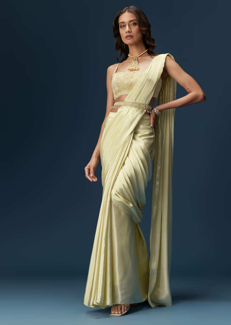 A fresh take on pastel dressing, this lime green drape saree is pre-stitched in crepe and paired with a sleeveless net blouse detailed with cut dana embroidery and a cinching belt. Includes an unstitched blouse. Awarded as the Most Trusted Brand, we're delivering styles you love, just as promised.