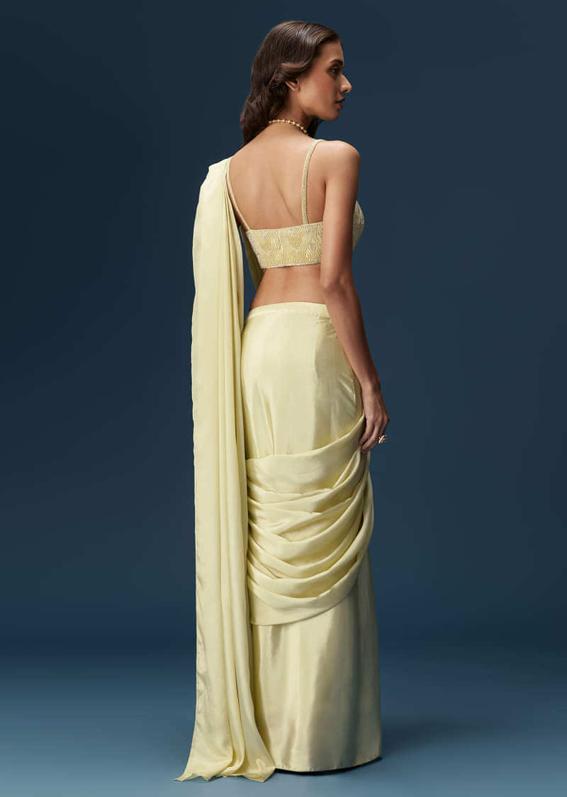 A fresh take on pastel dressing, this lime green drape saree is pre-stitched in crepe and paired with a sleeveless net blouse detailed with cut dana embroidery and a cinching... More Product Details