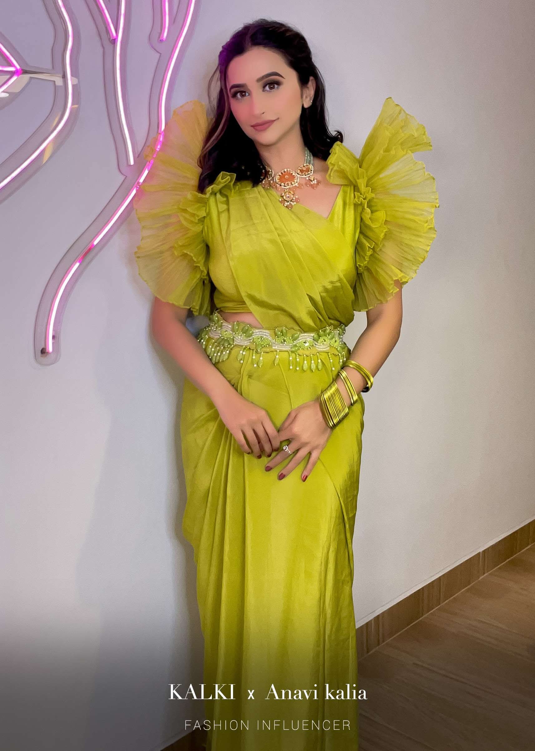 Lime Green Saree In Crepe With Elaborate Ruffle Sleeved Crop Top And Heavy Stone Embroidered Belt