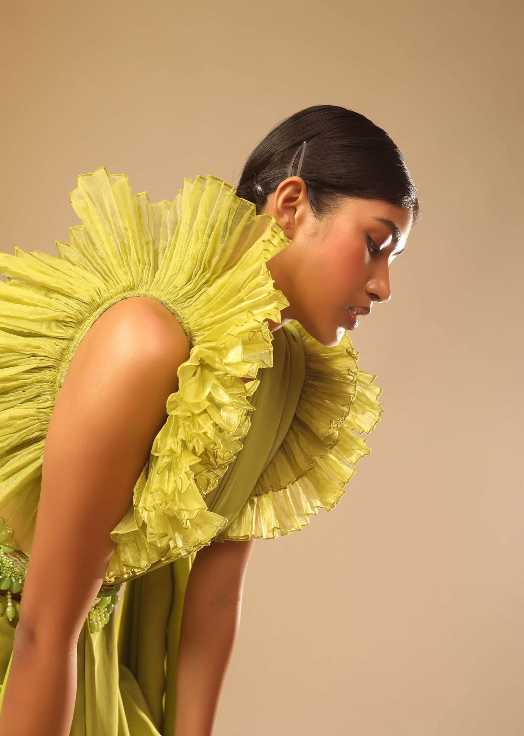 - Lime green saree in georgette crepe with an organza ruffle frill on the pallu.