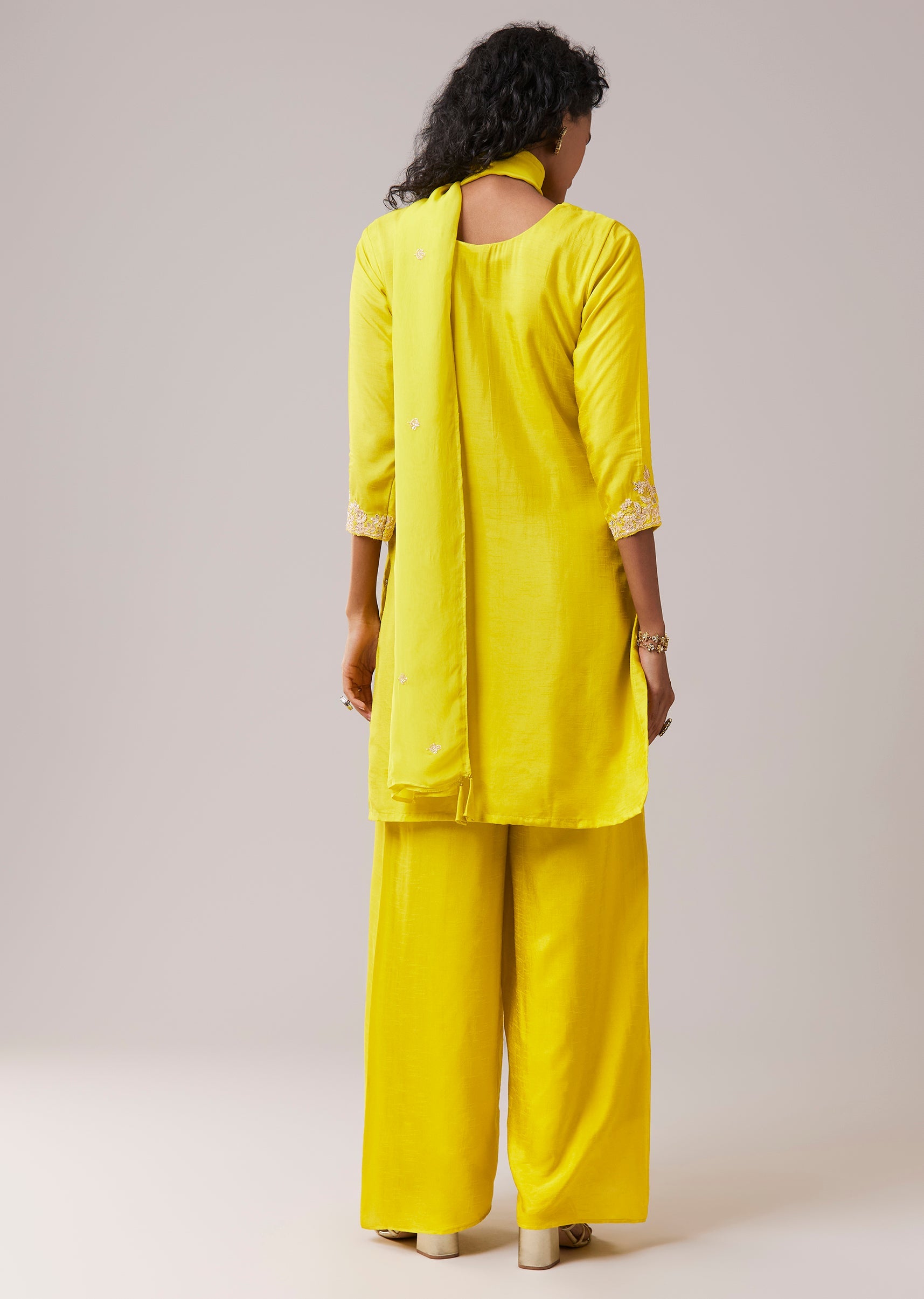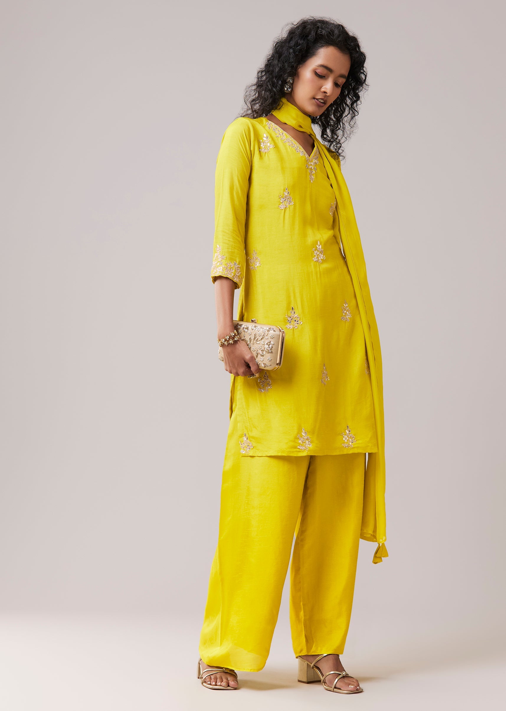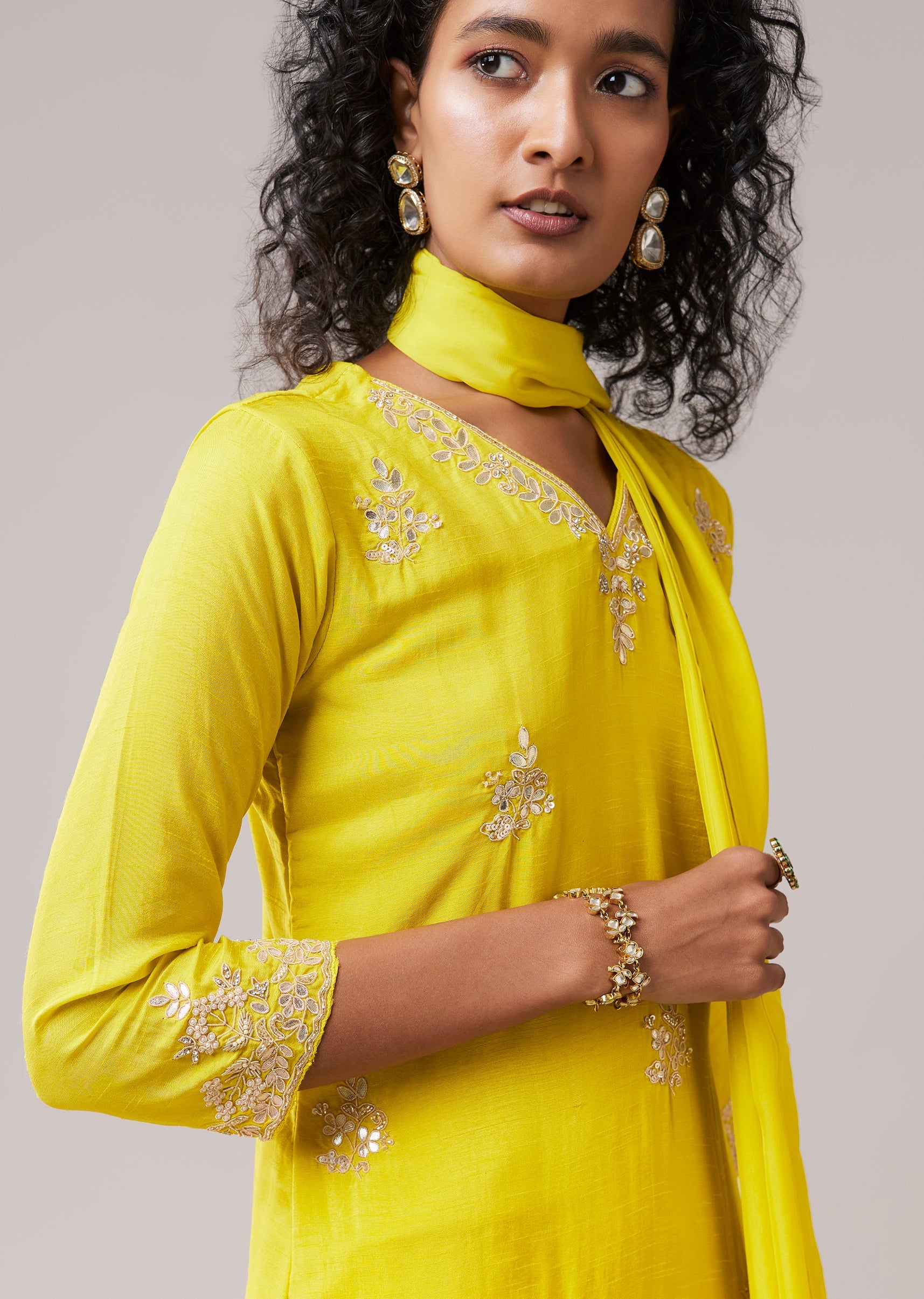 Lime Green Silk Kurta Pant Set with Gota Work