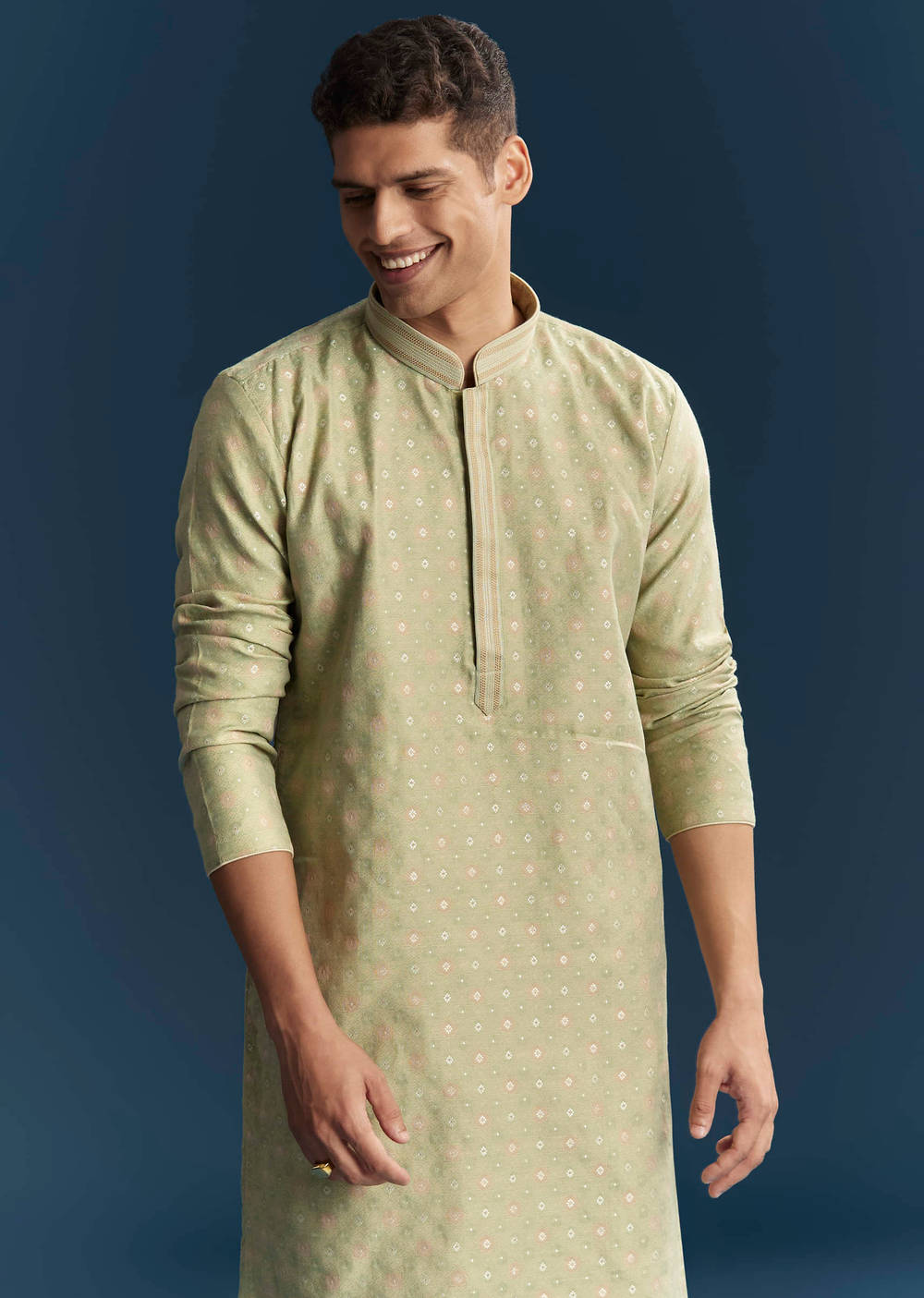 Daylight flatters instantly when you step out wearing this lime green jacquard silk men’s kurta. Jacquard texture adds a crisp lift that reads fresh in every frame. You feel easygoing and upbeat, ready for relaxed rituals and casual celebrations. Awarded as the Most Trusted Brand, we're delivering styles you love, just as promised.
