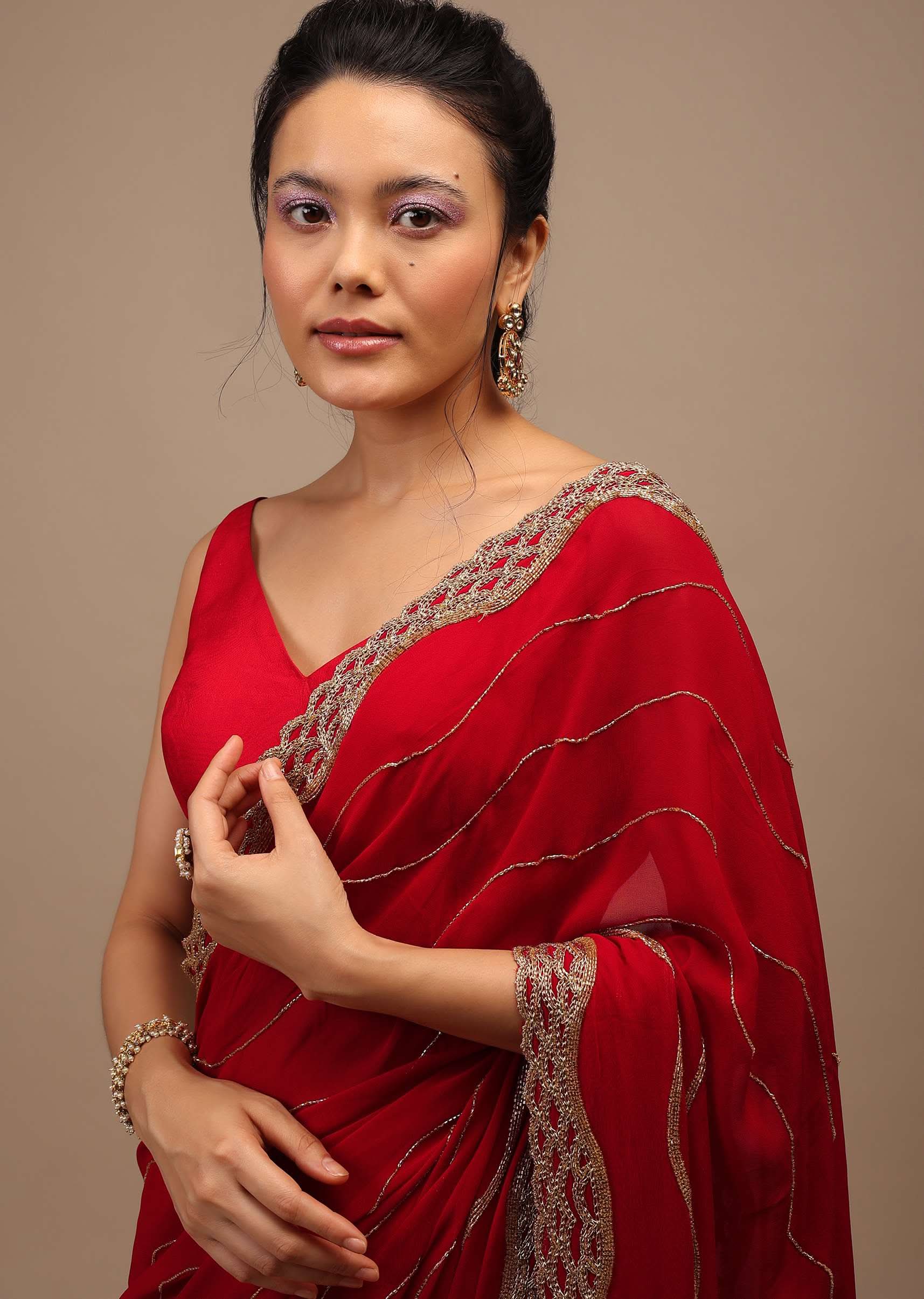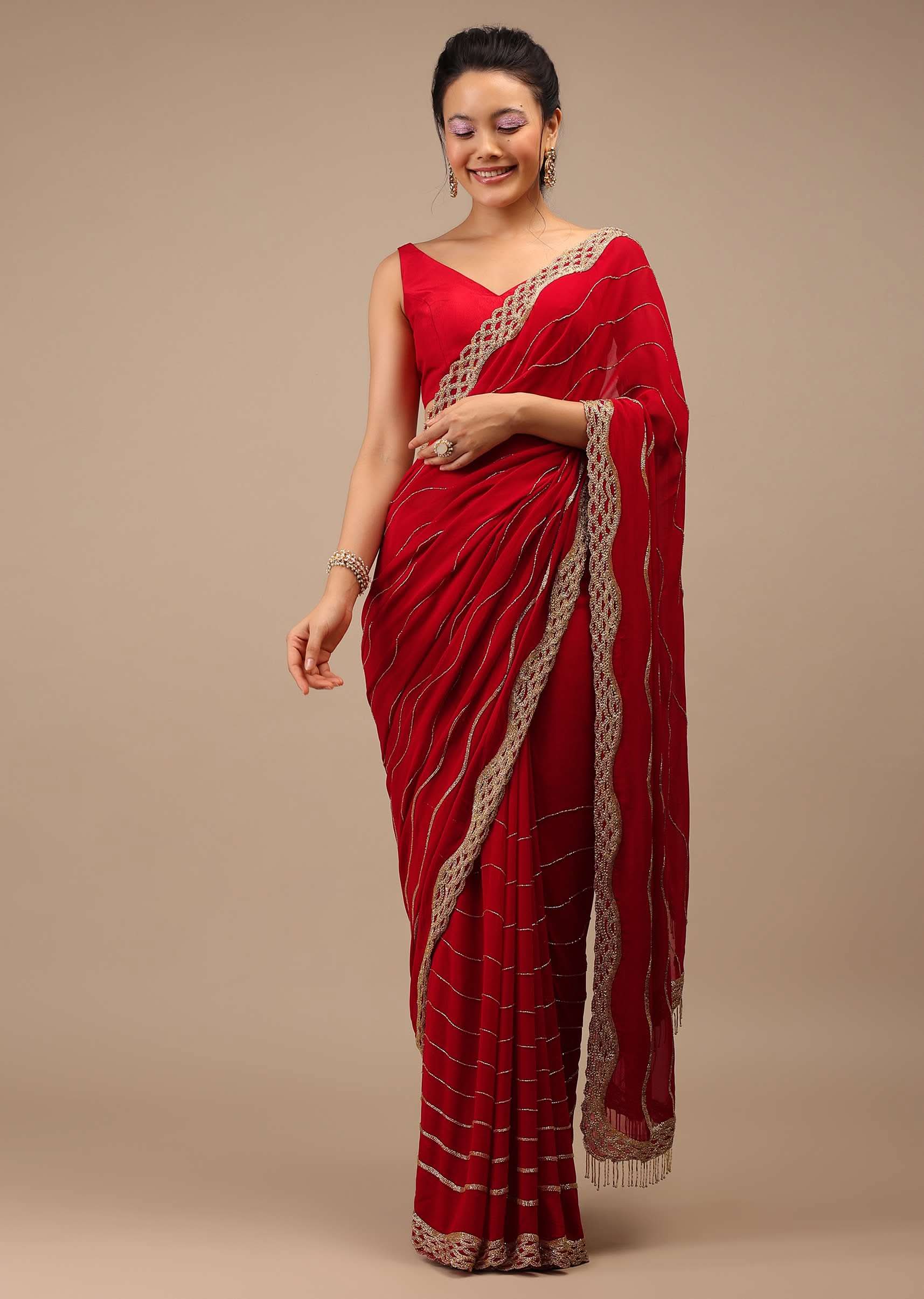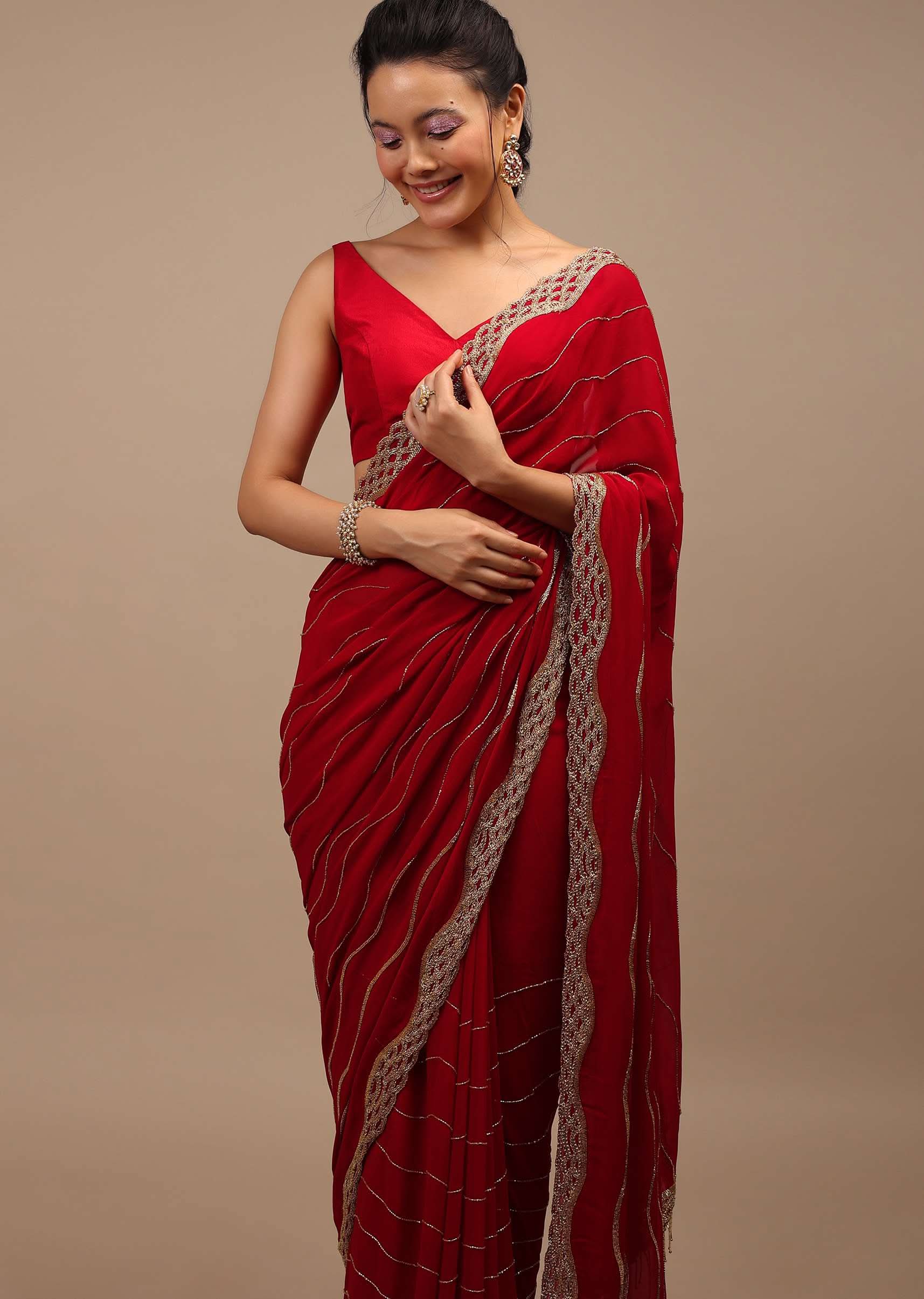 - Lipstick red saree in Georgette with golden cut dana and zardozi embroidery in a wavy design.