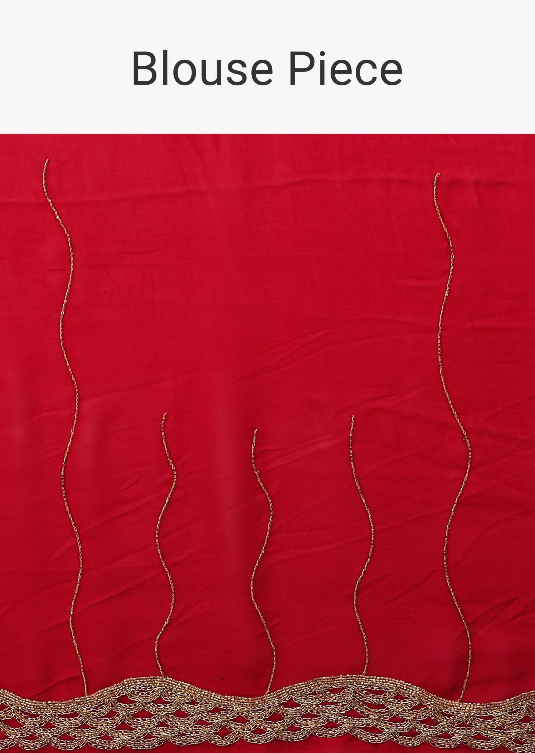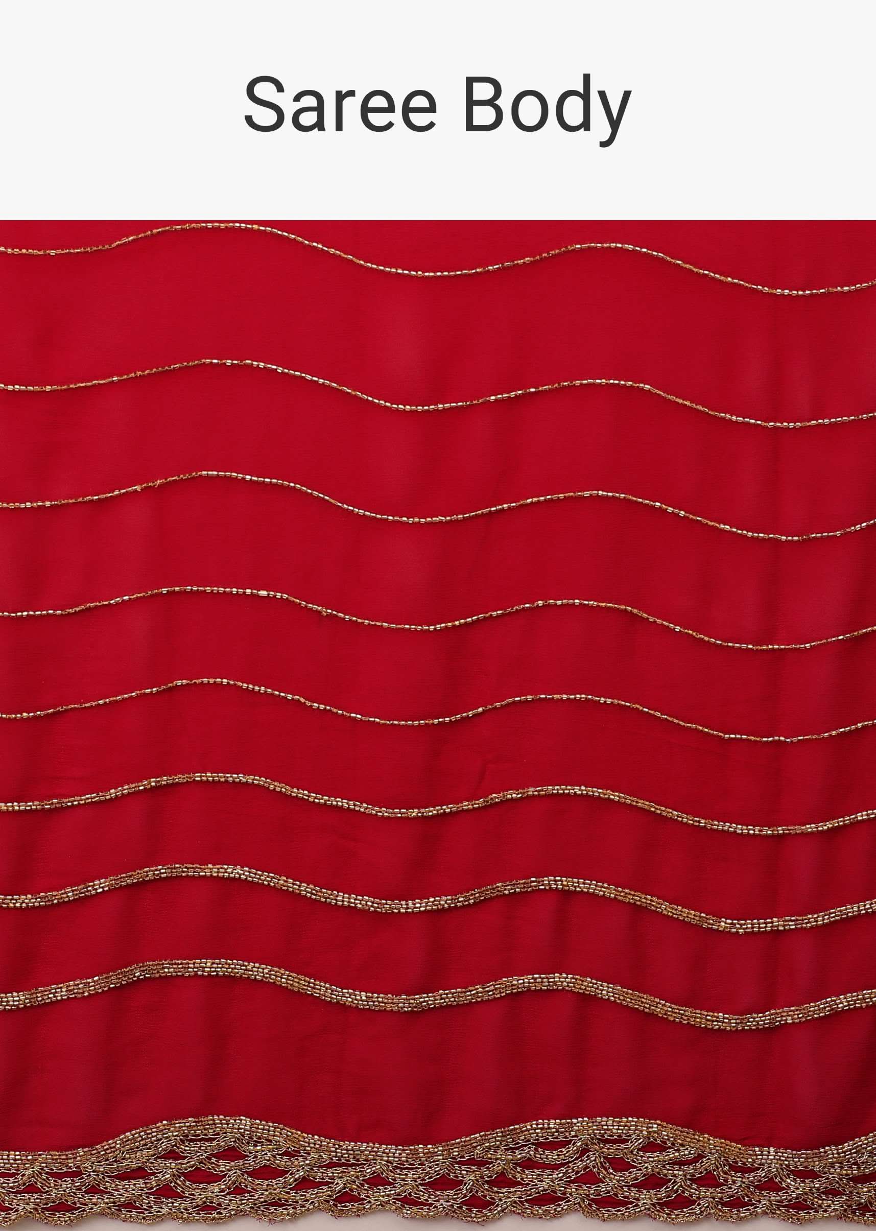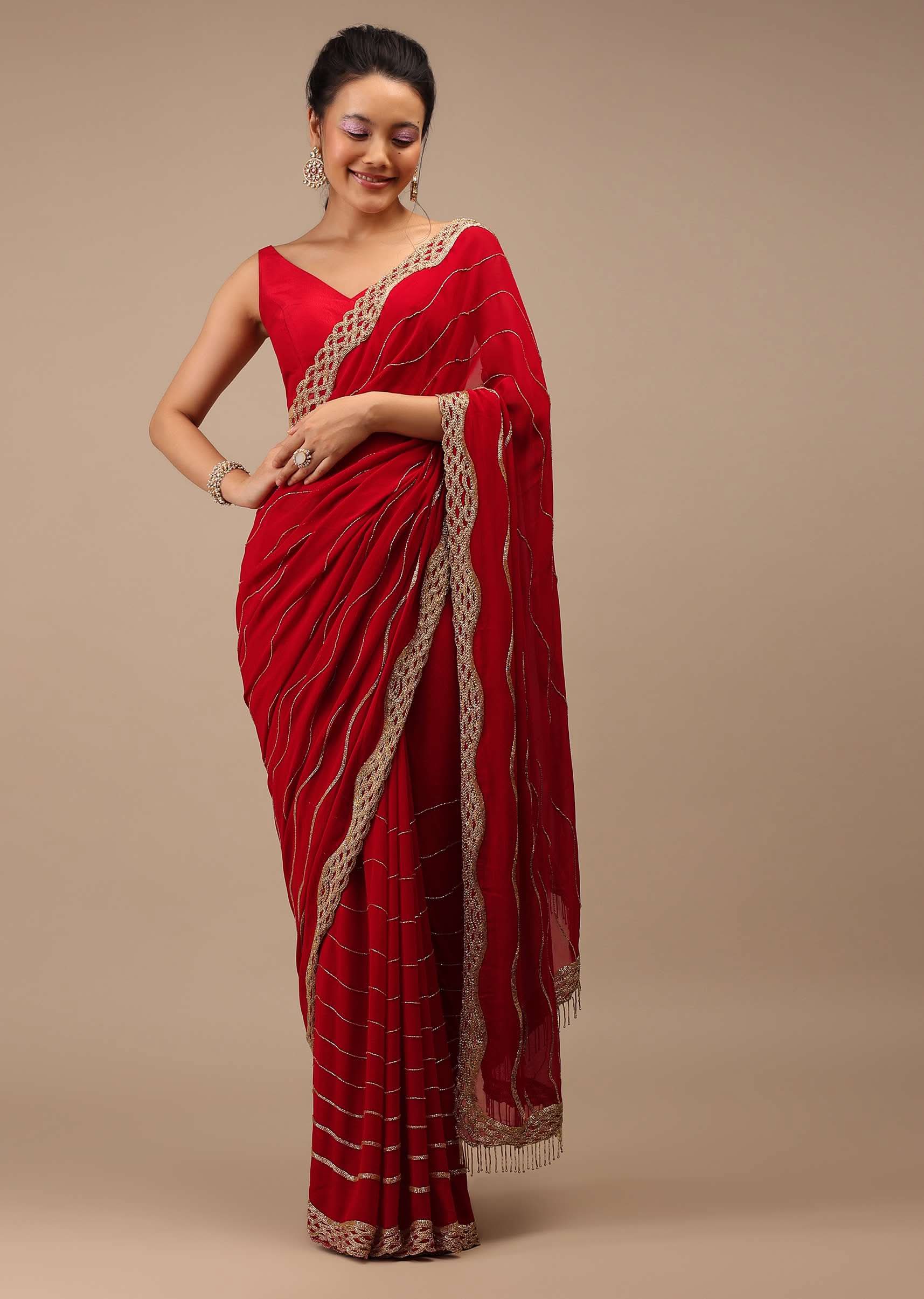 - Lipstick red saree in Georgette with golden cut dana and zardozi embroidery in a wavy design.