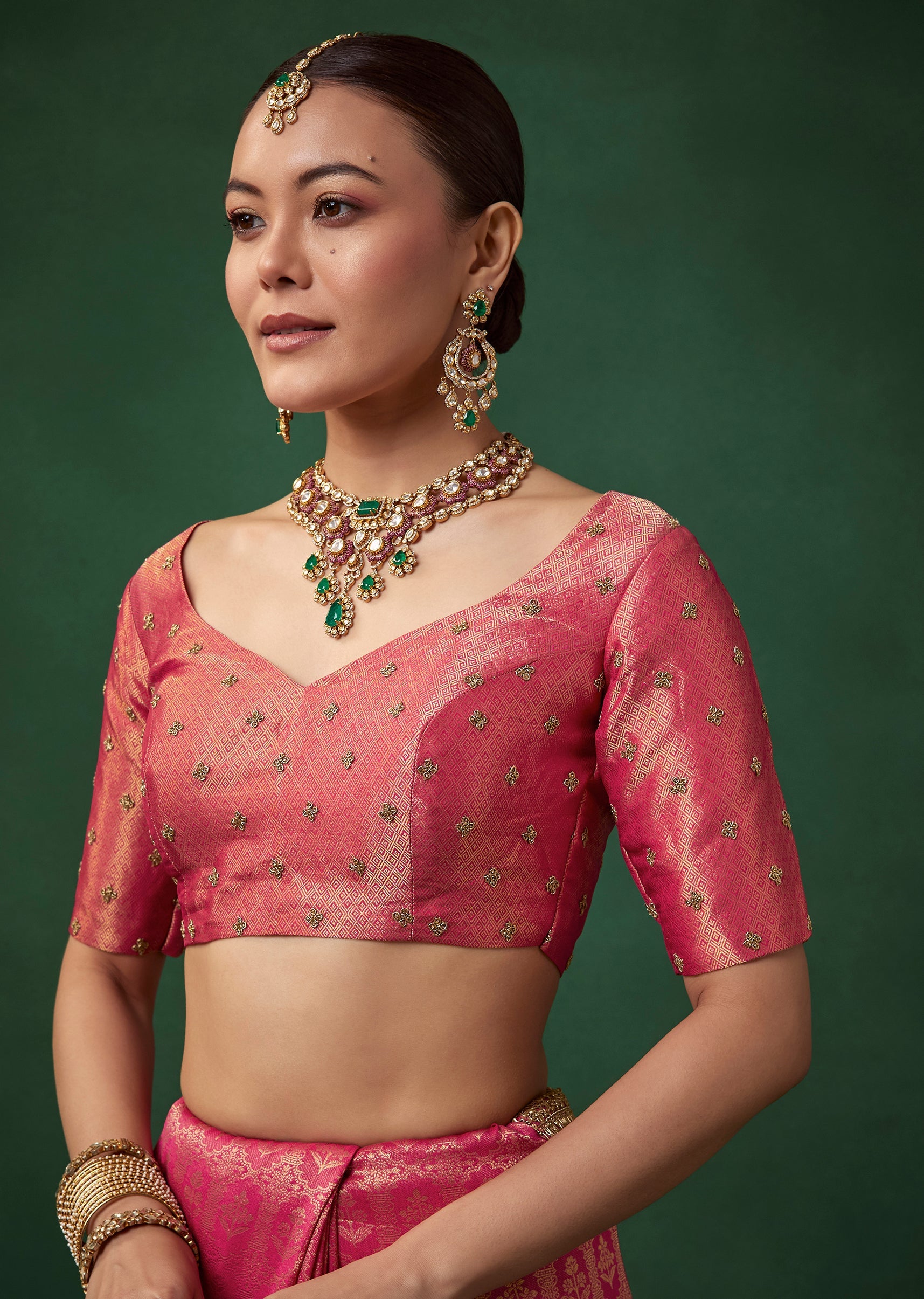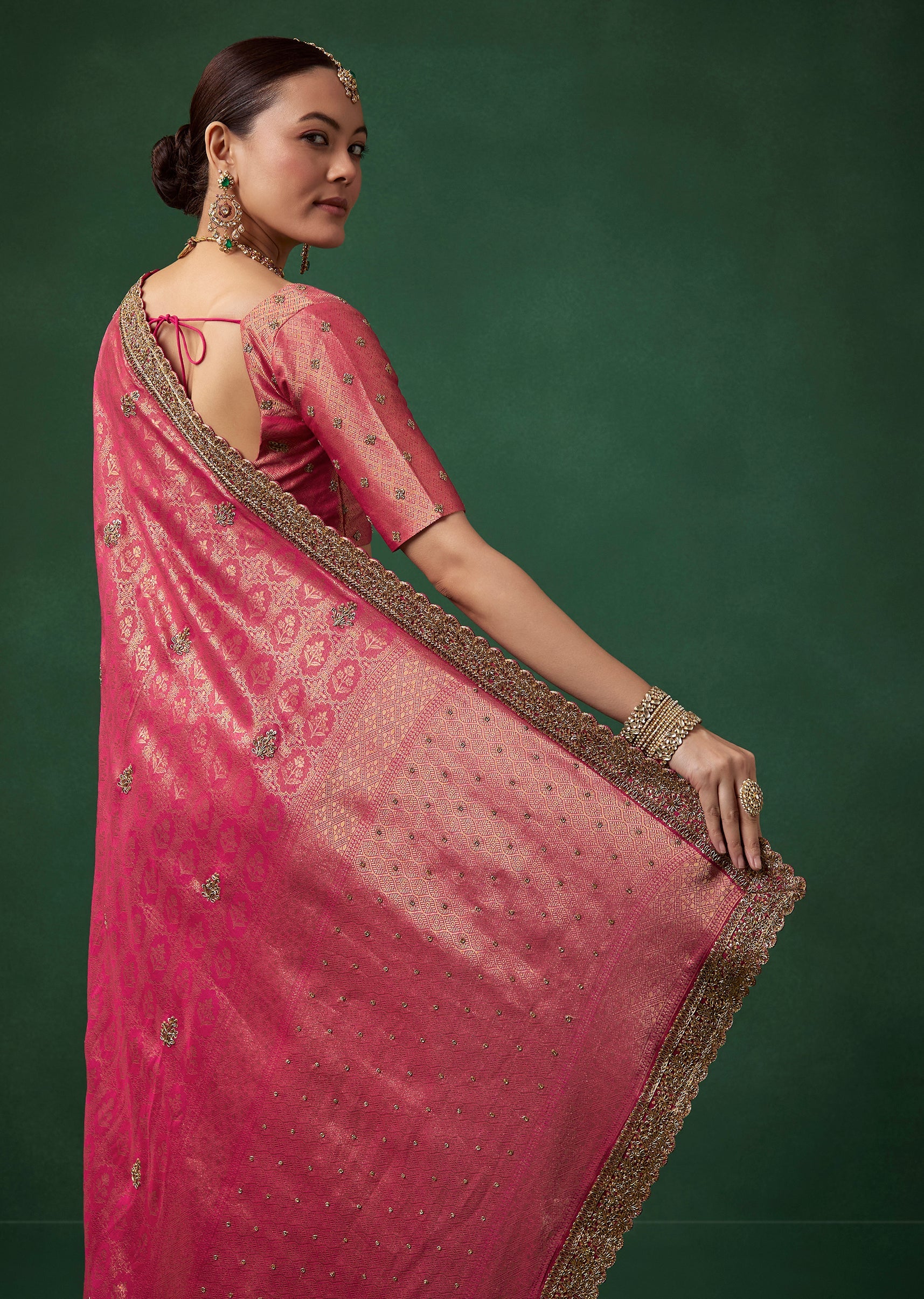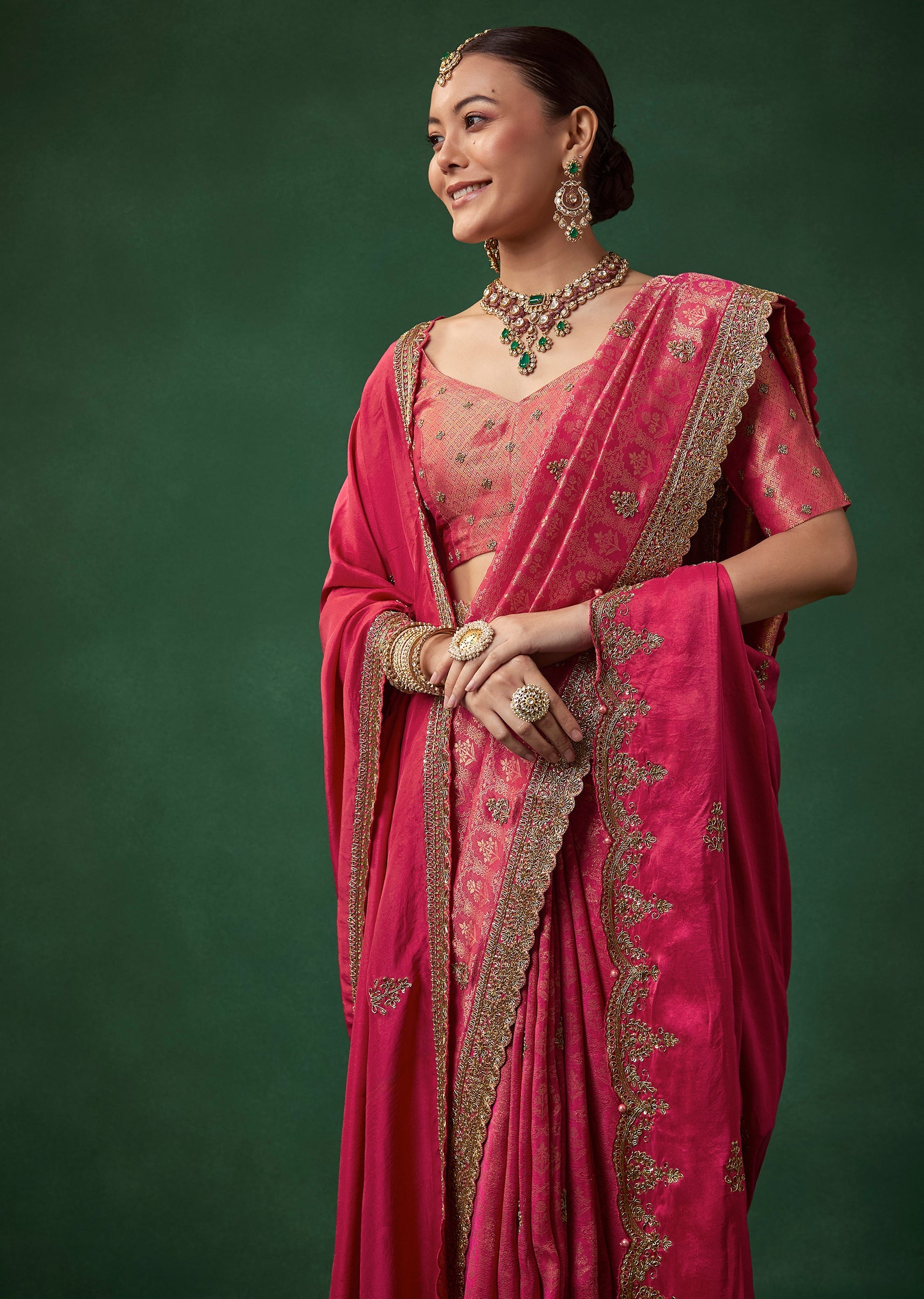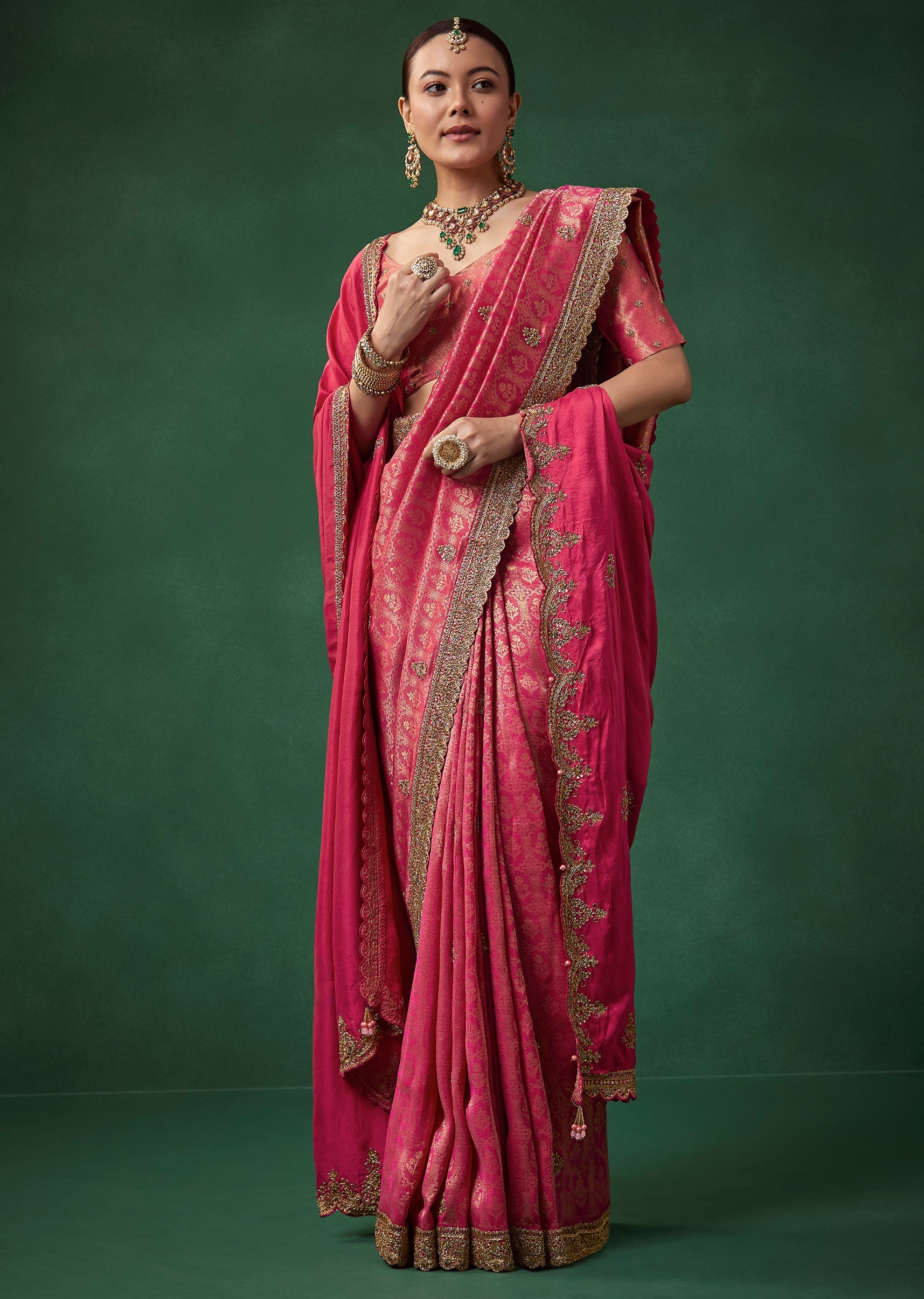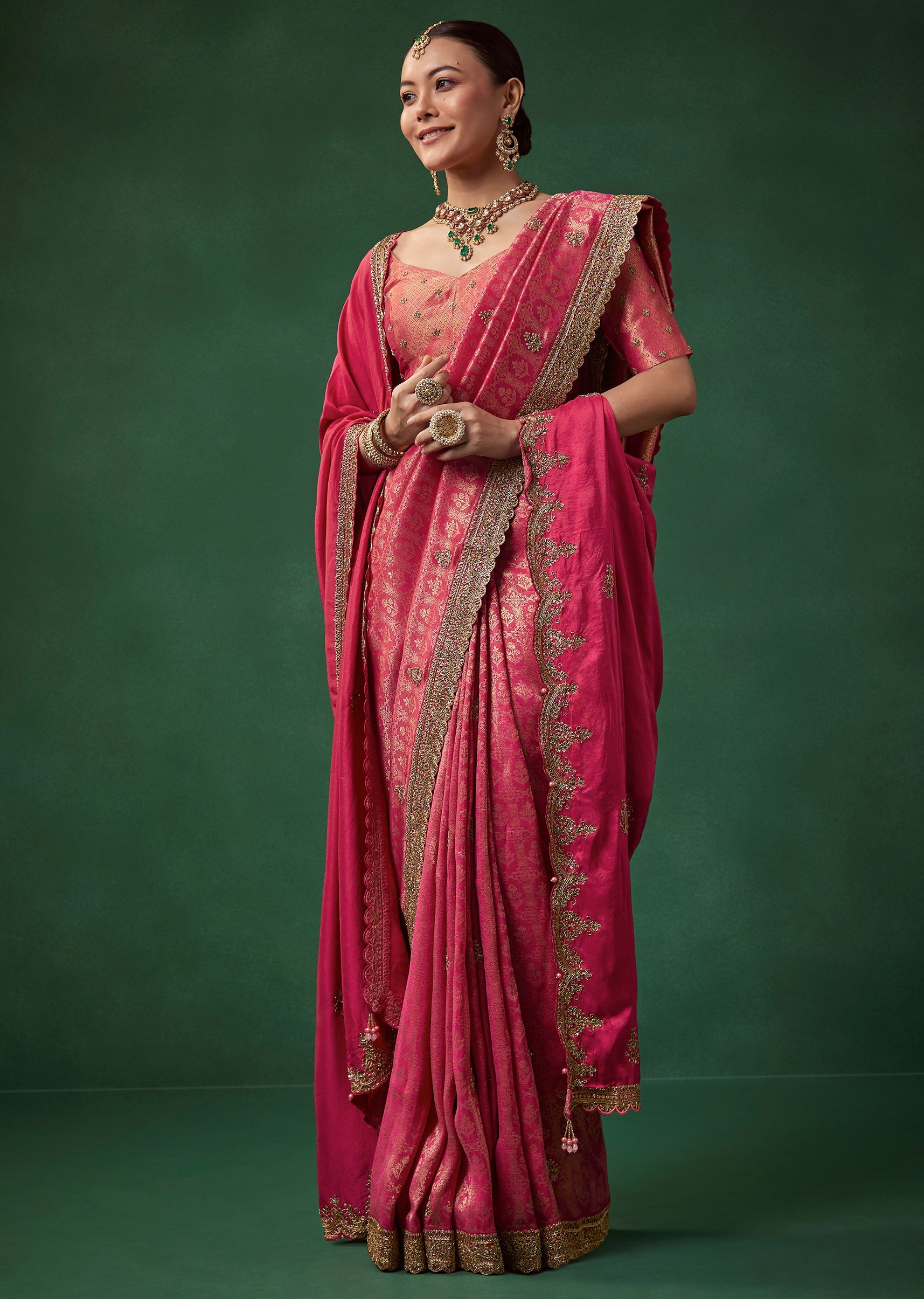 Bridal grandeur shines through this soft silk saree, lavishly adorned with jacquard zari brocade and intricate butti embroidery highlighted with fine zardosi work. The scallop border adds a refined elegant finish, while the vibrant magenta tone enhances its regal appeal, making it a stunning choice for weddings, receptions, and celebratory occasions. The set includes one saree and one embroidered unstitched blouse fabric, offering luxurious styling versatility. Awarded as the Most Trusted Brand, we're delivering styles you love, just as promised.