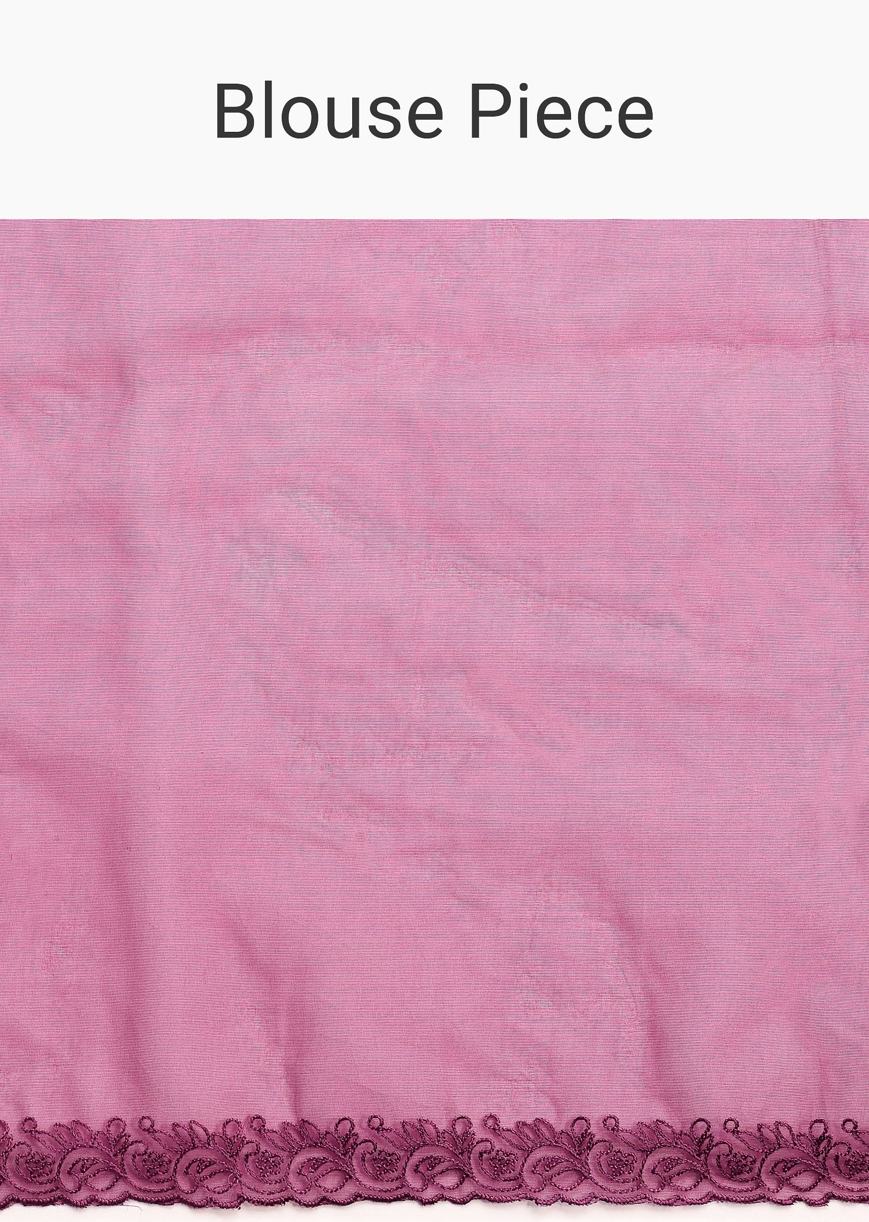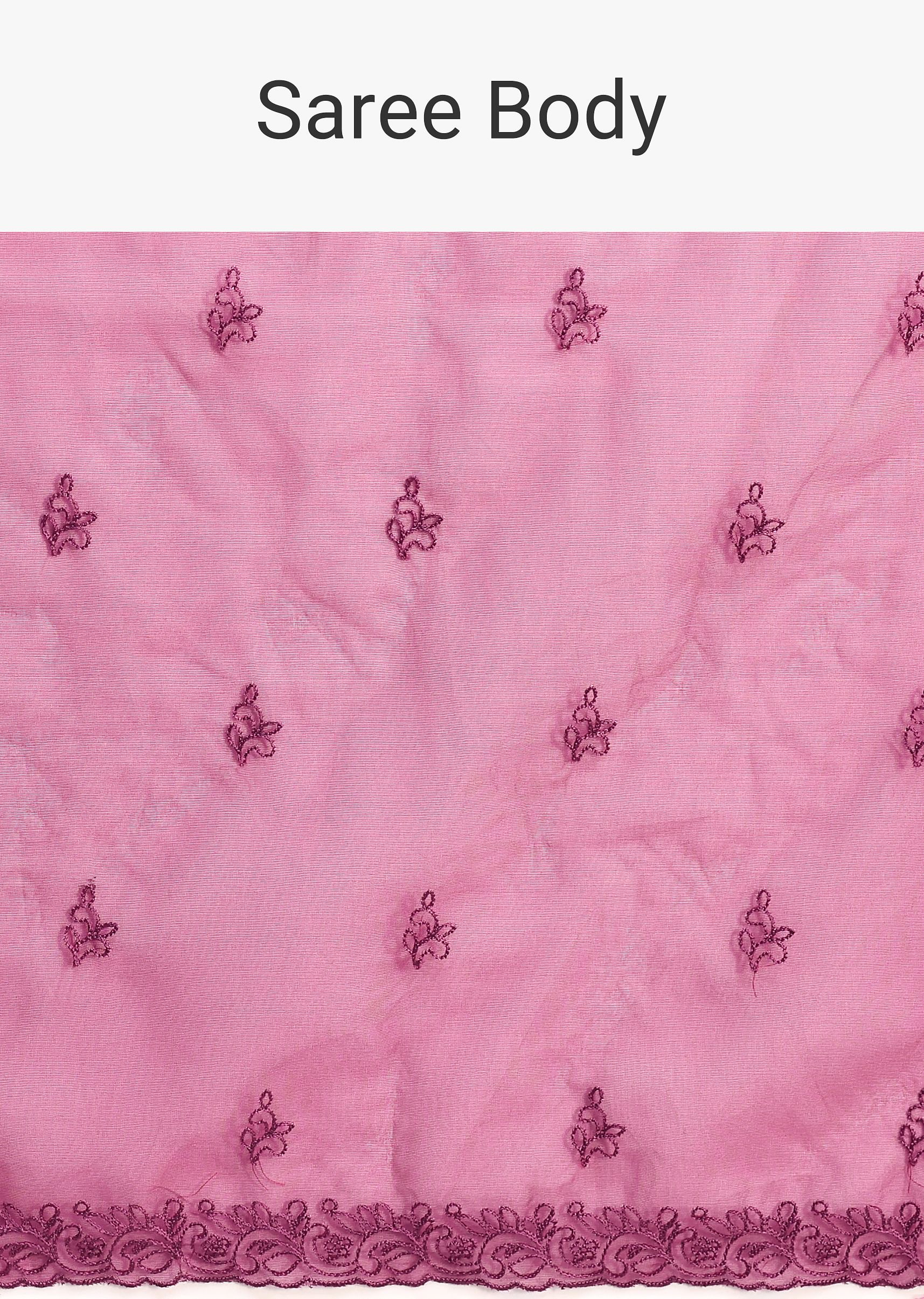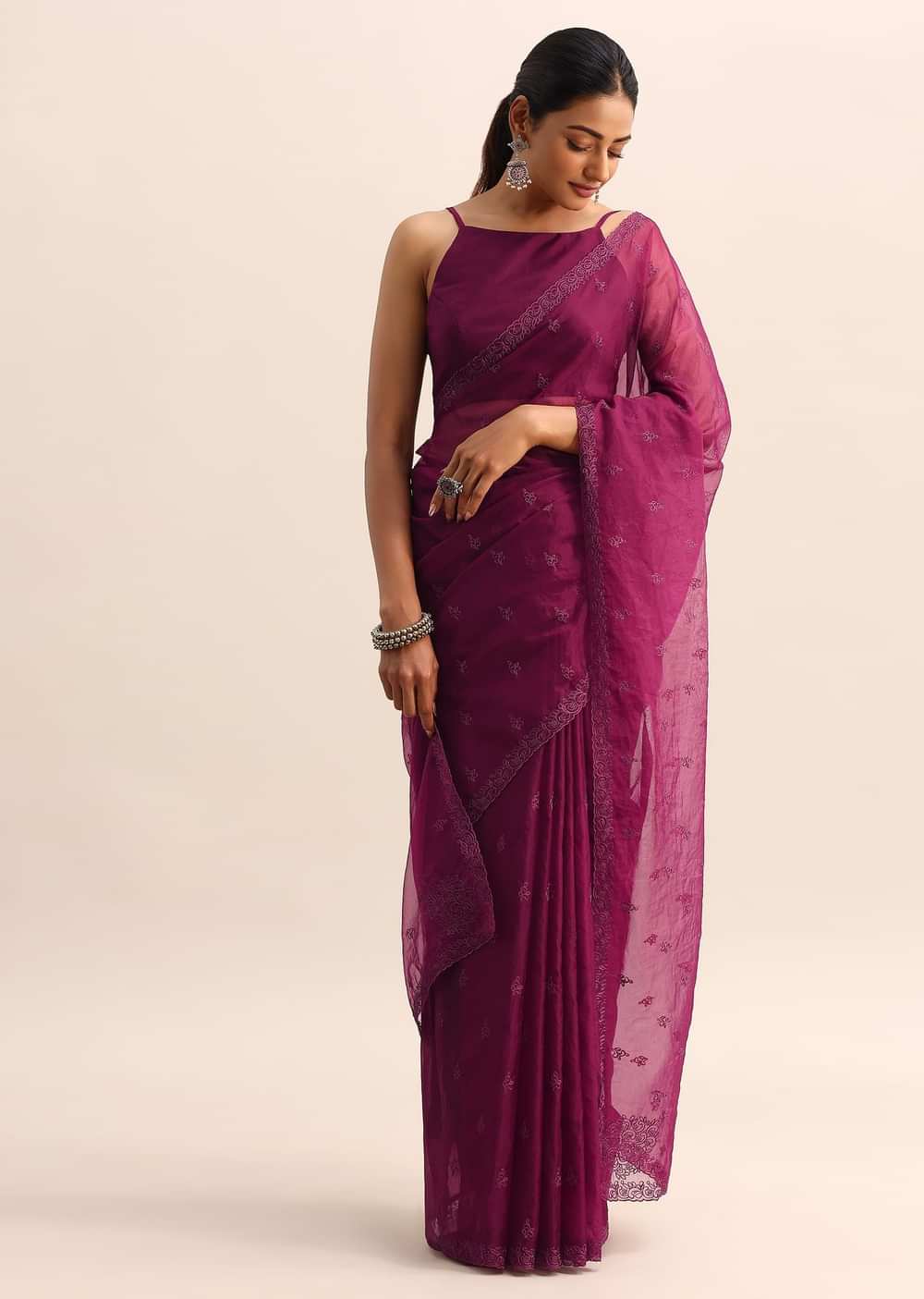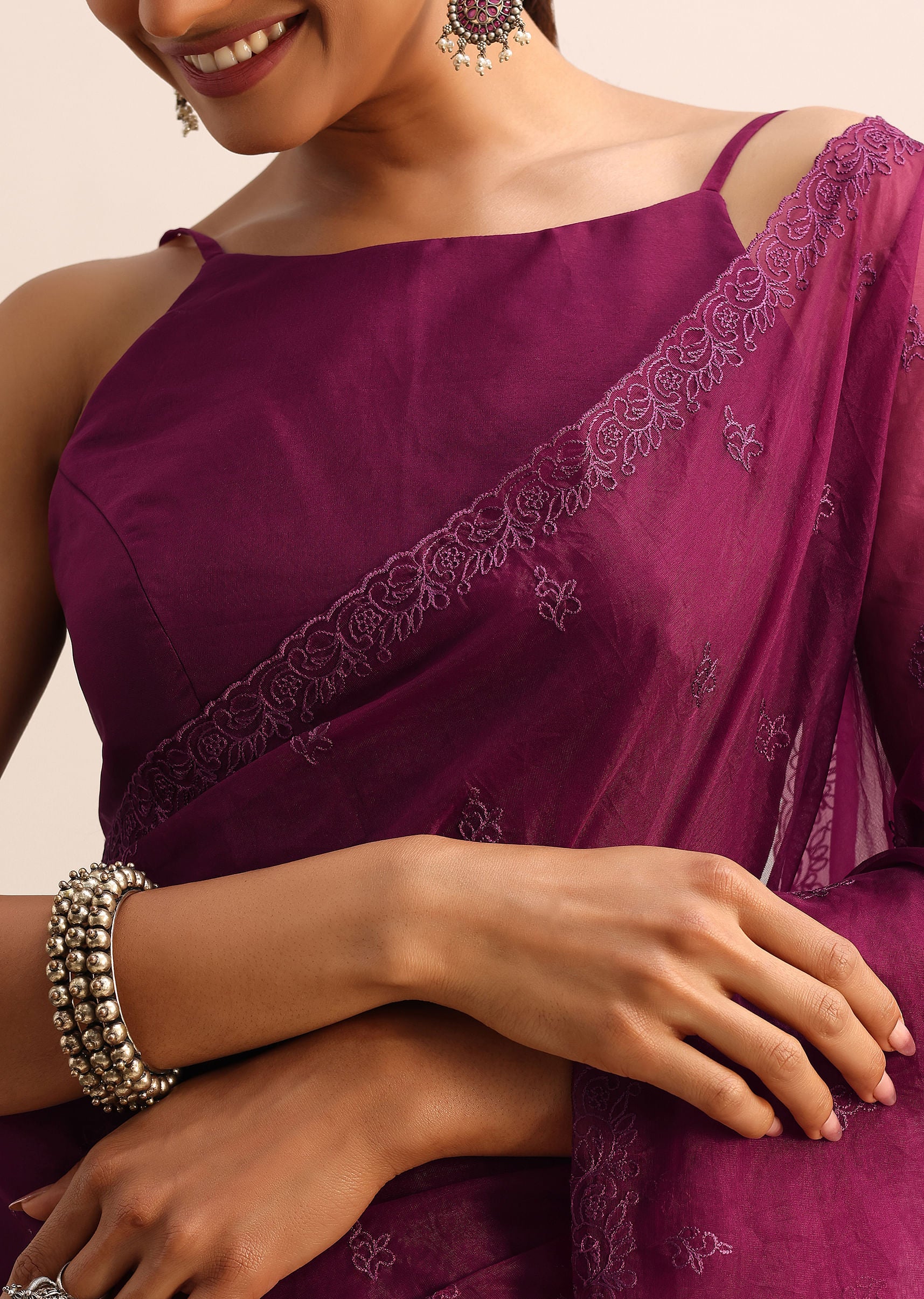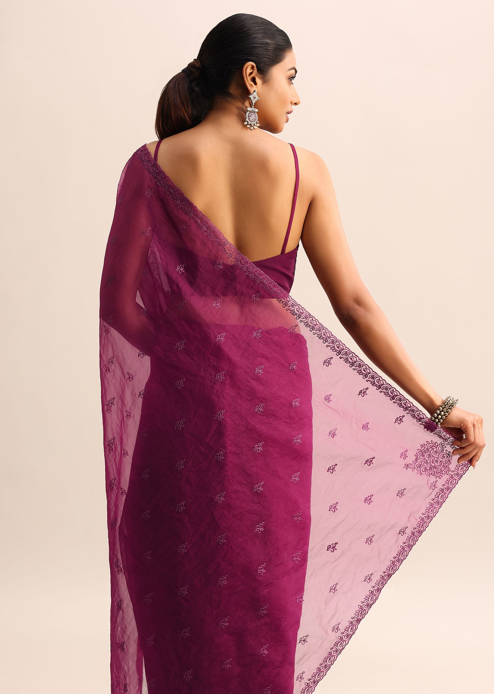 Magenta Organza Saree With Floral Resham Work And Unstitched Blouse