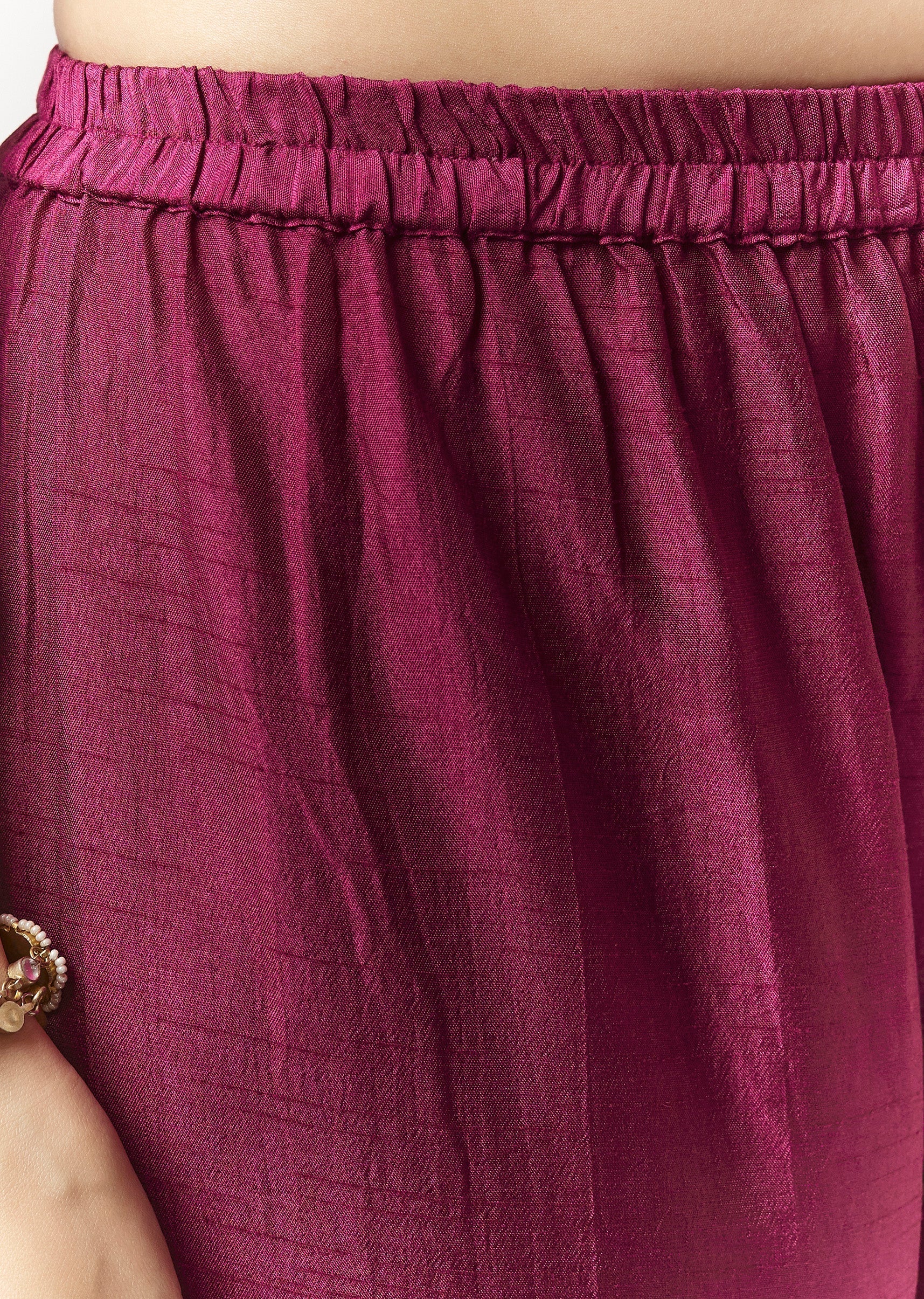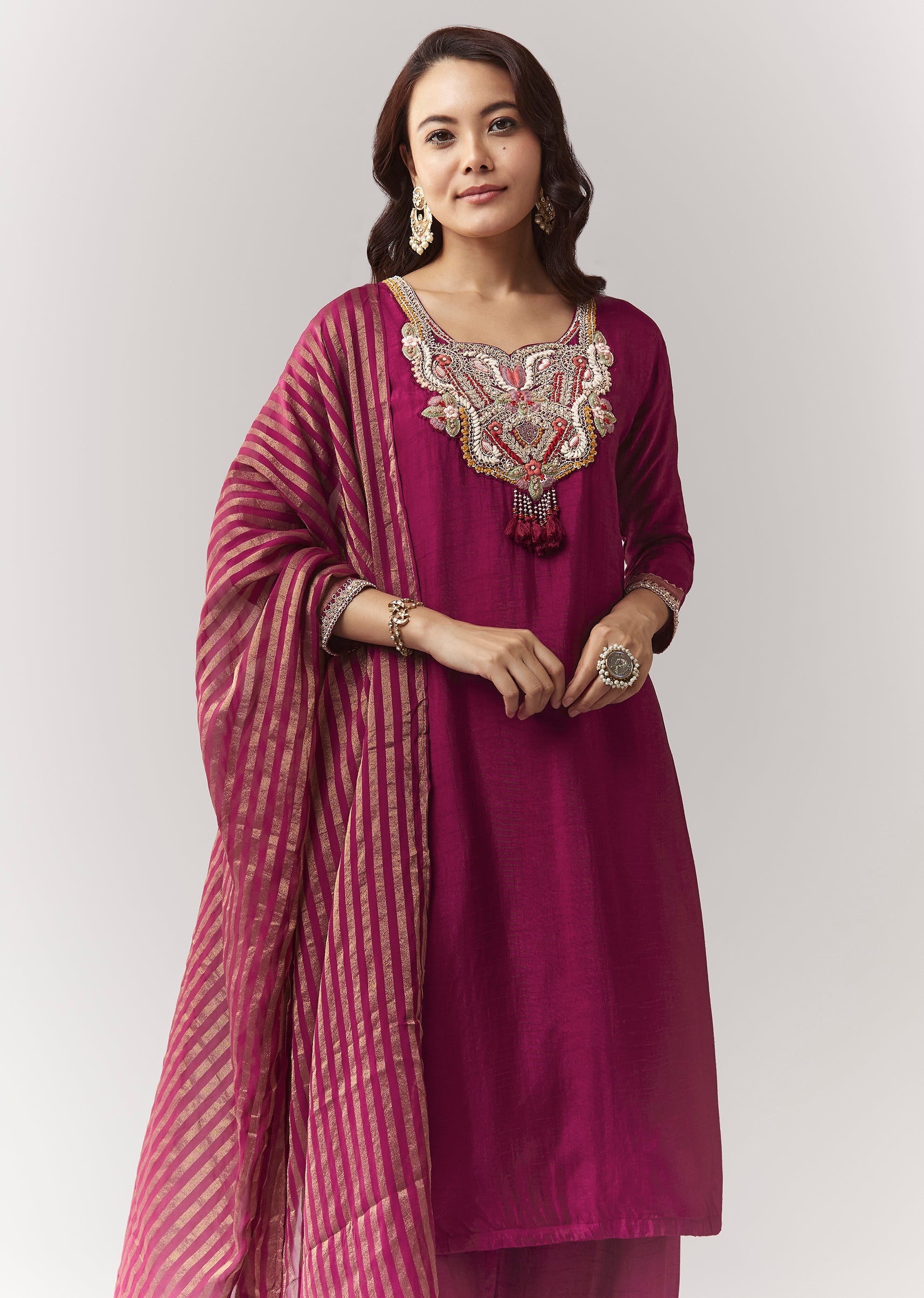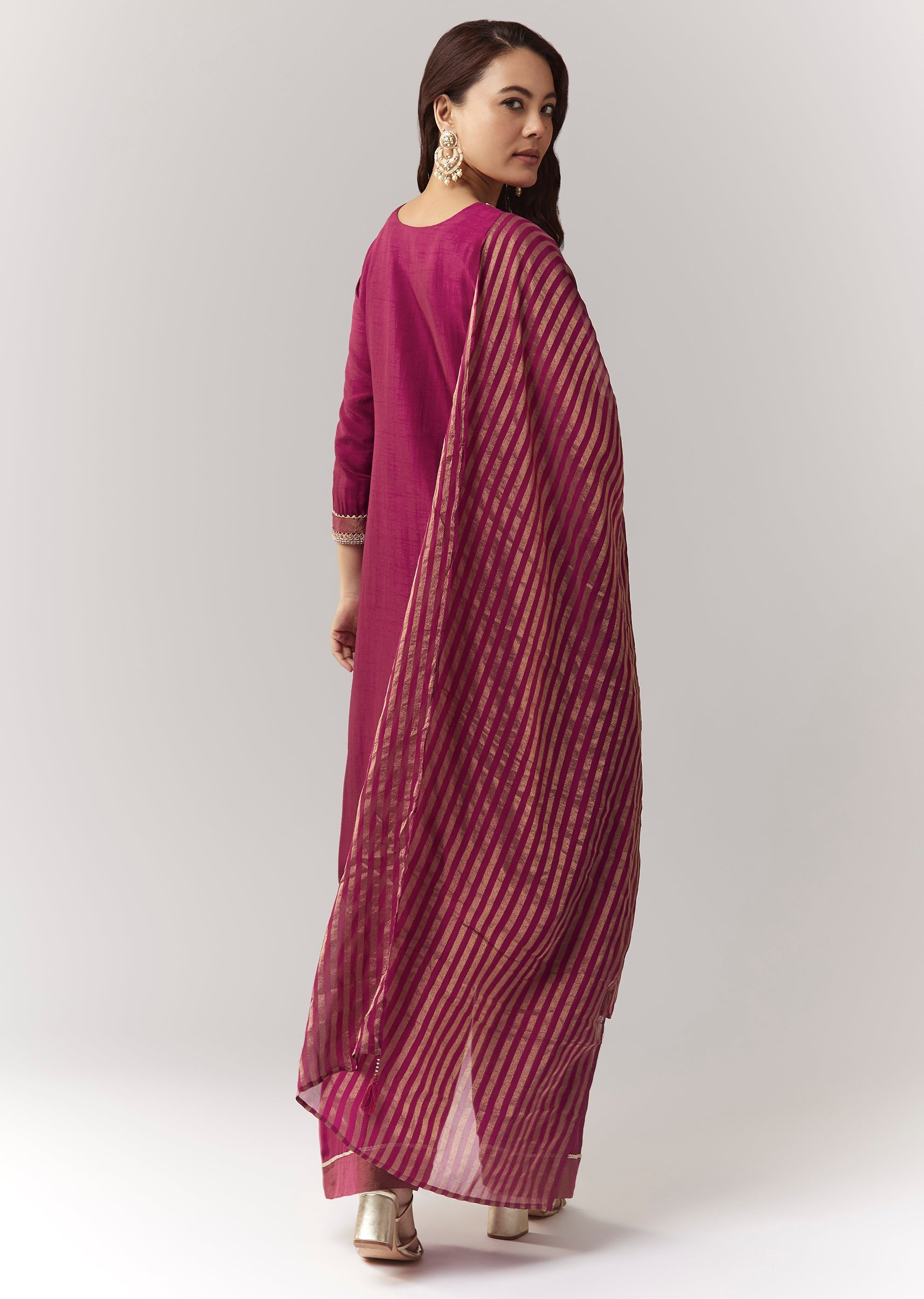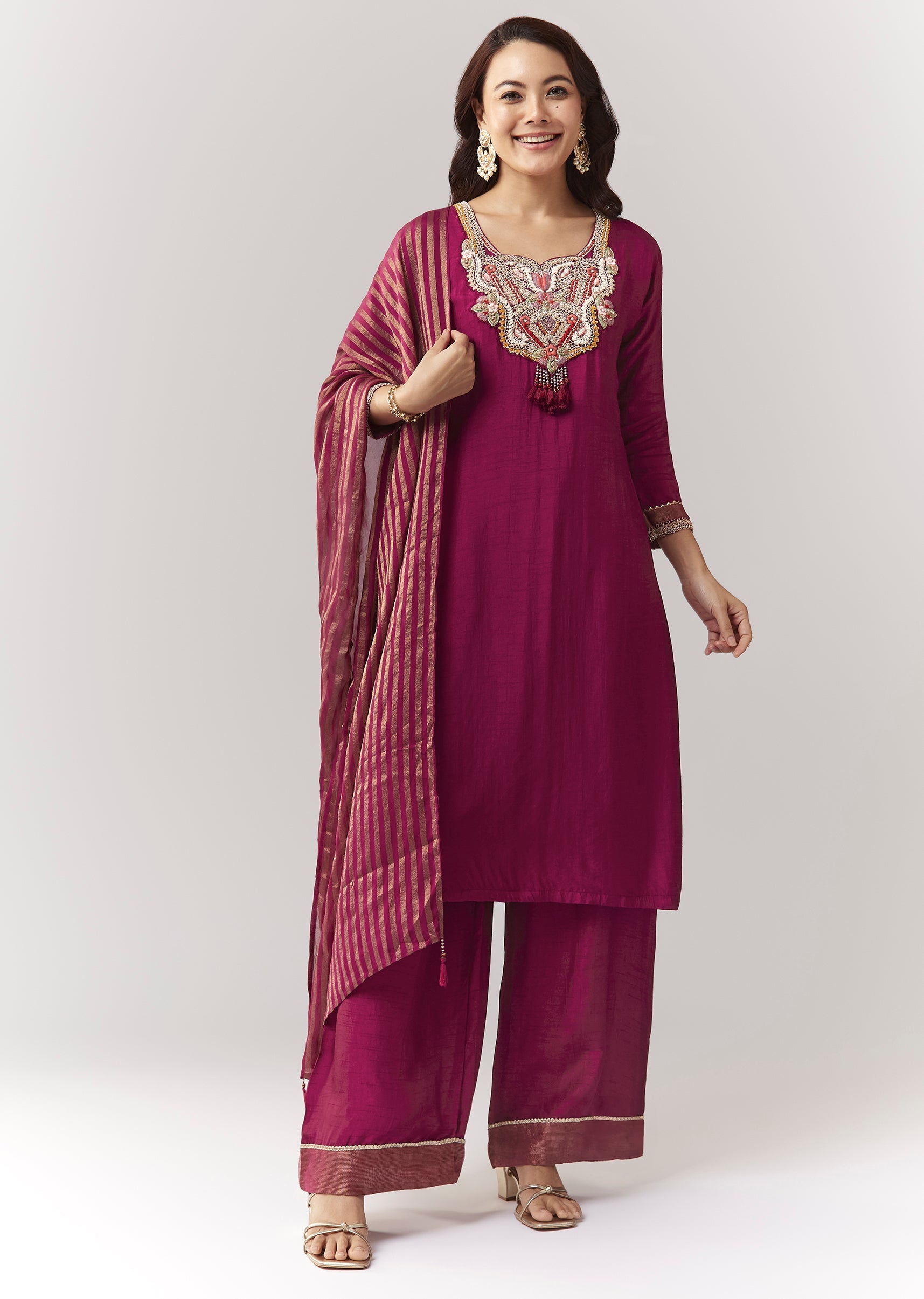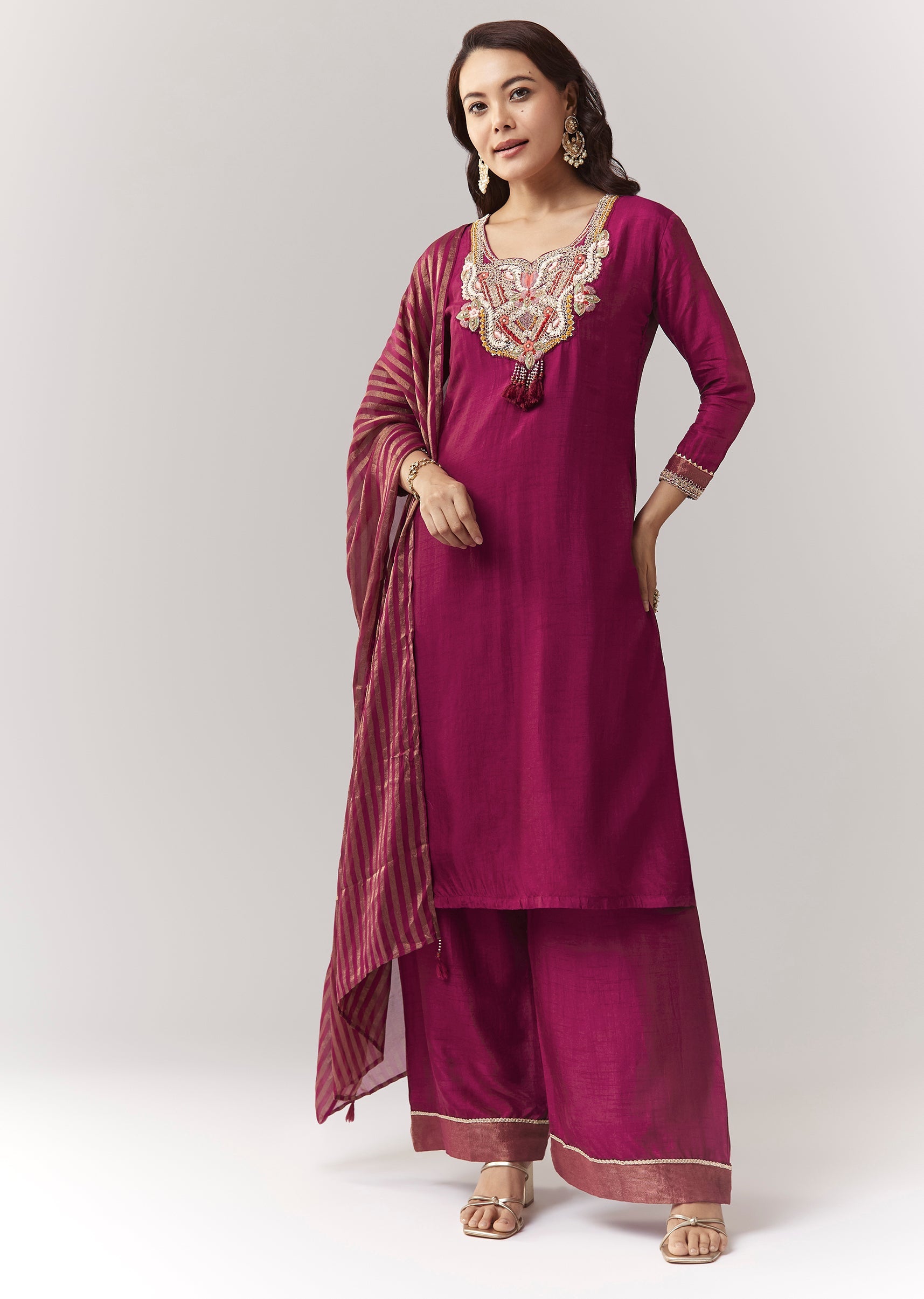 Magenta Zardosi Threadwork Kurta Palazzo Set With Dupatta