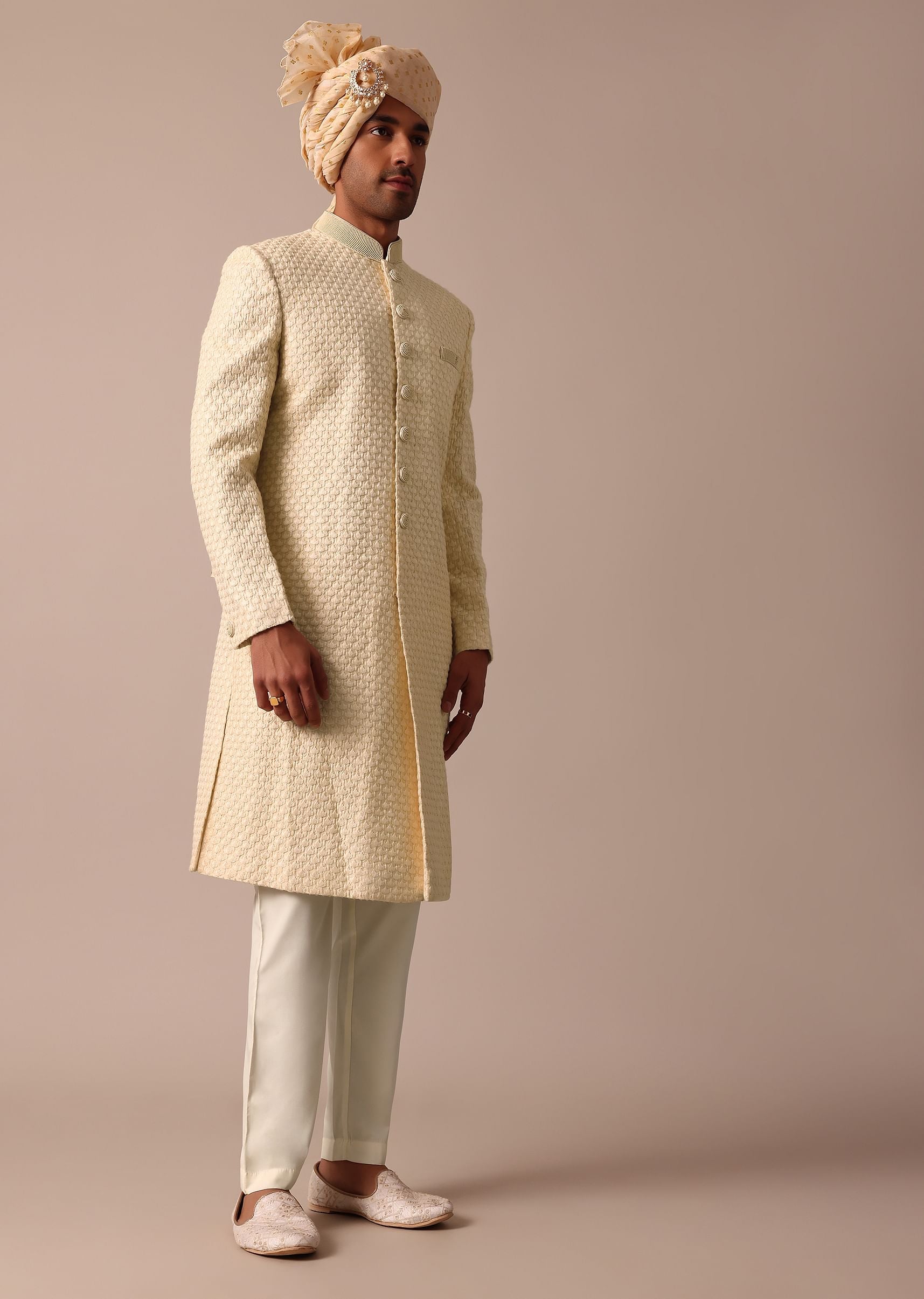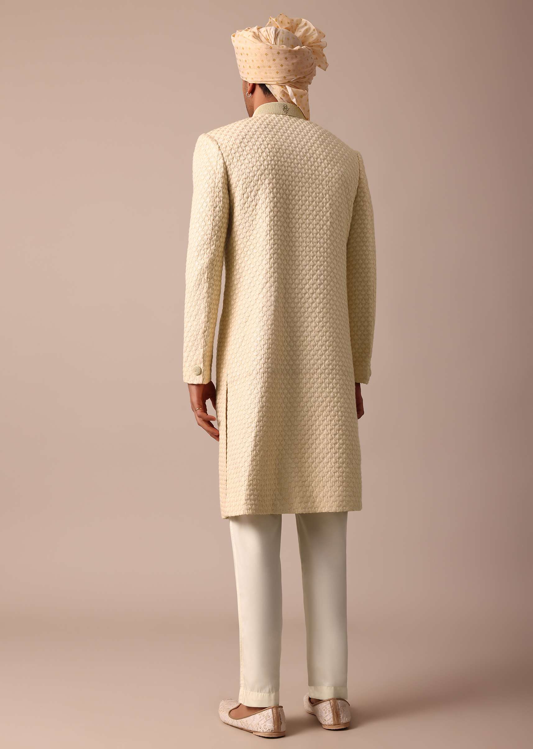 - This ensemble complete with full sleeves and a mandarin collar includes one Sherwani and bottom.