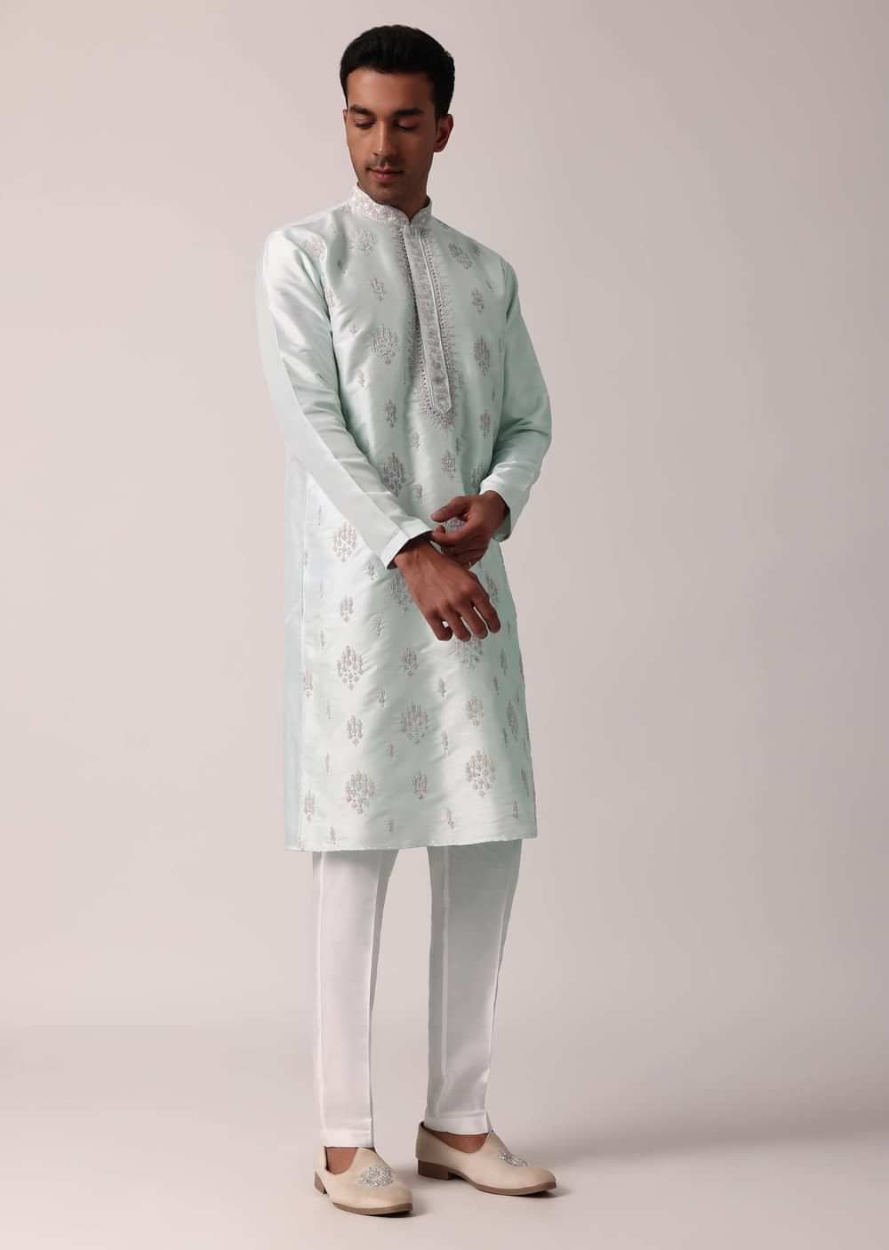 - TThis ensemble includes a full-sleeves kurta with a mandarin collar and coordinating bottom.