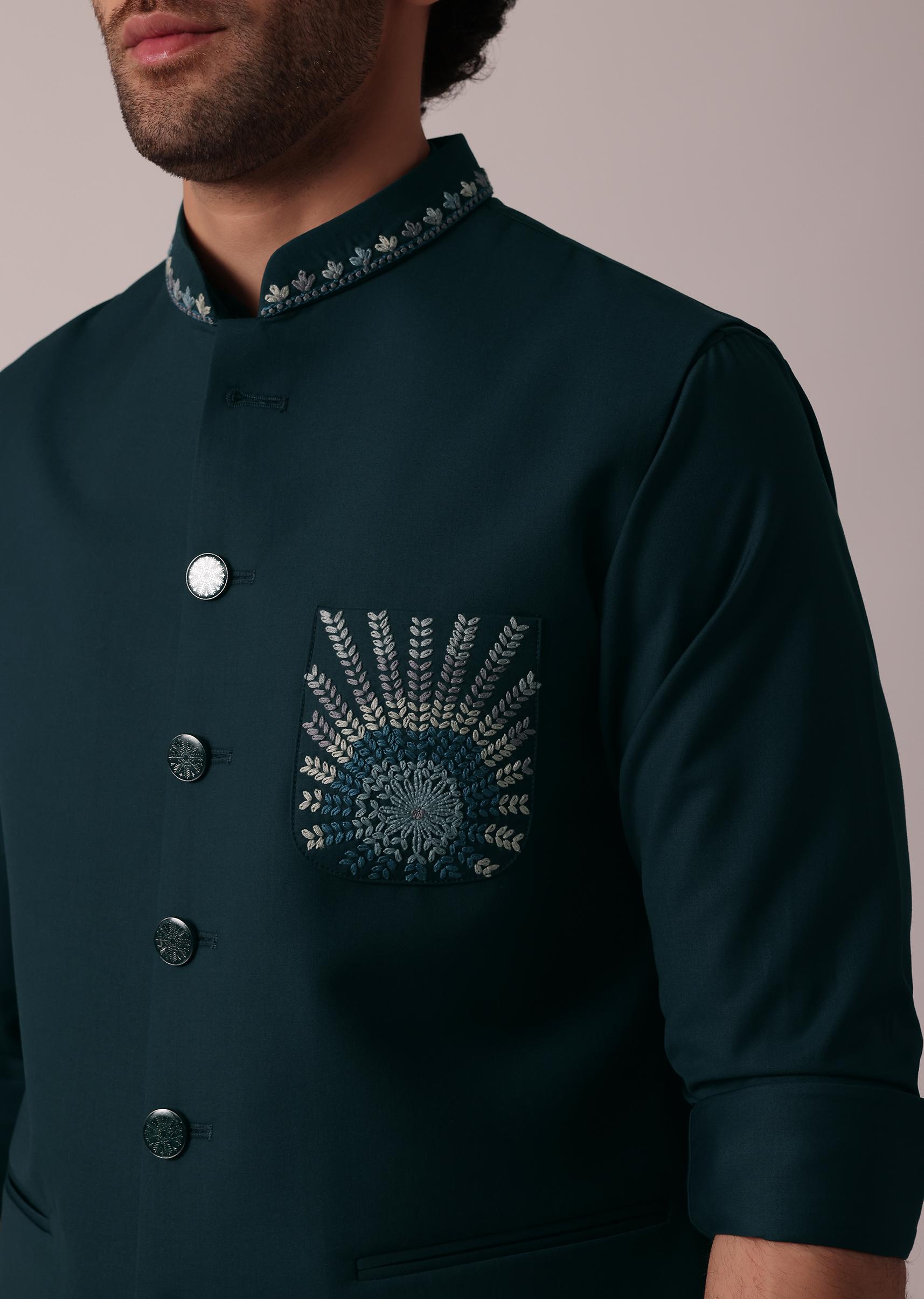 - It features exquisite embroidery on the neckline and pocket square.