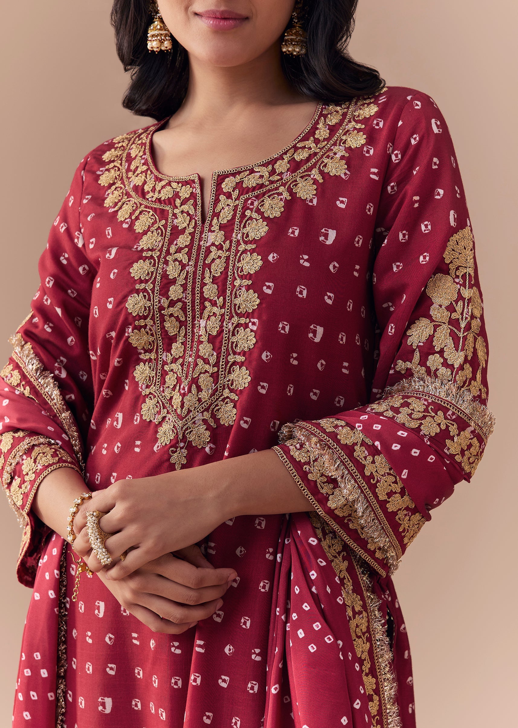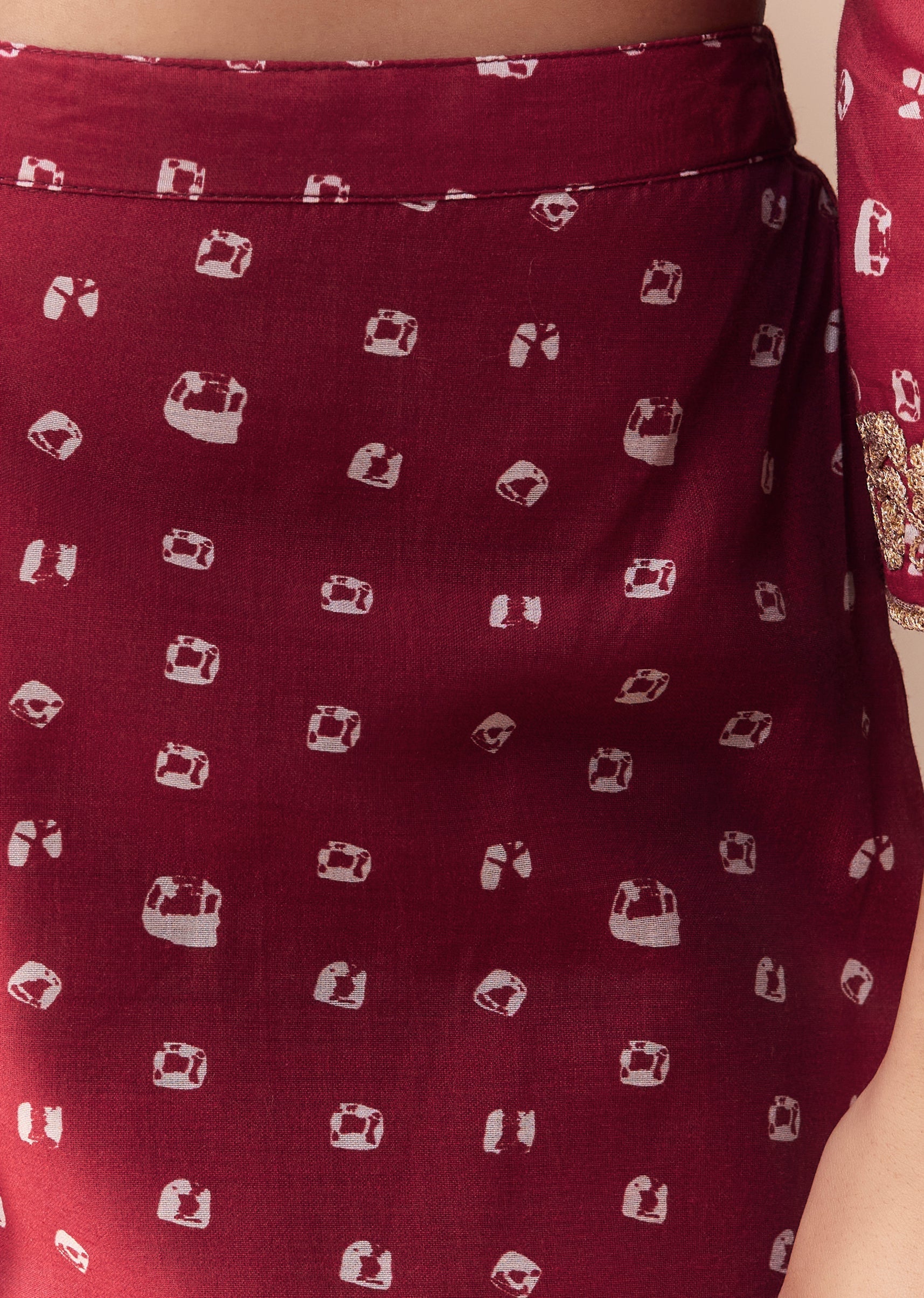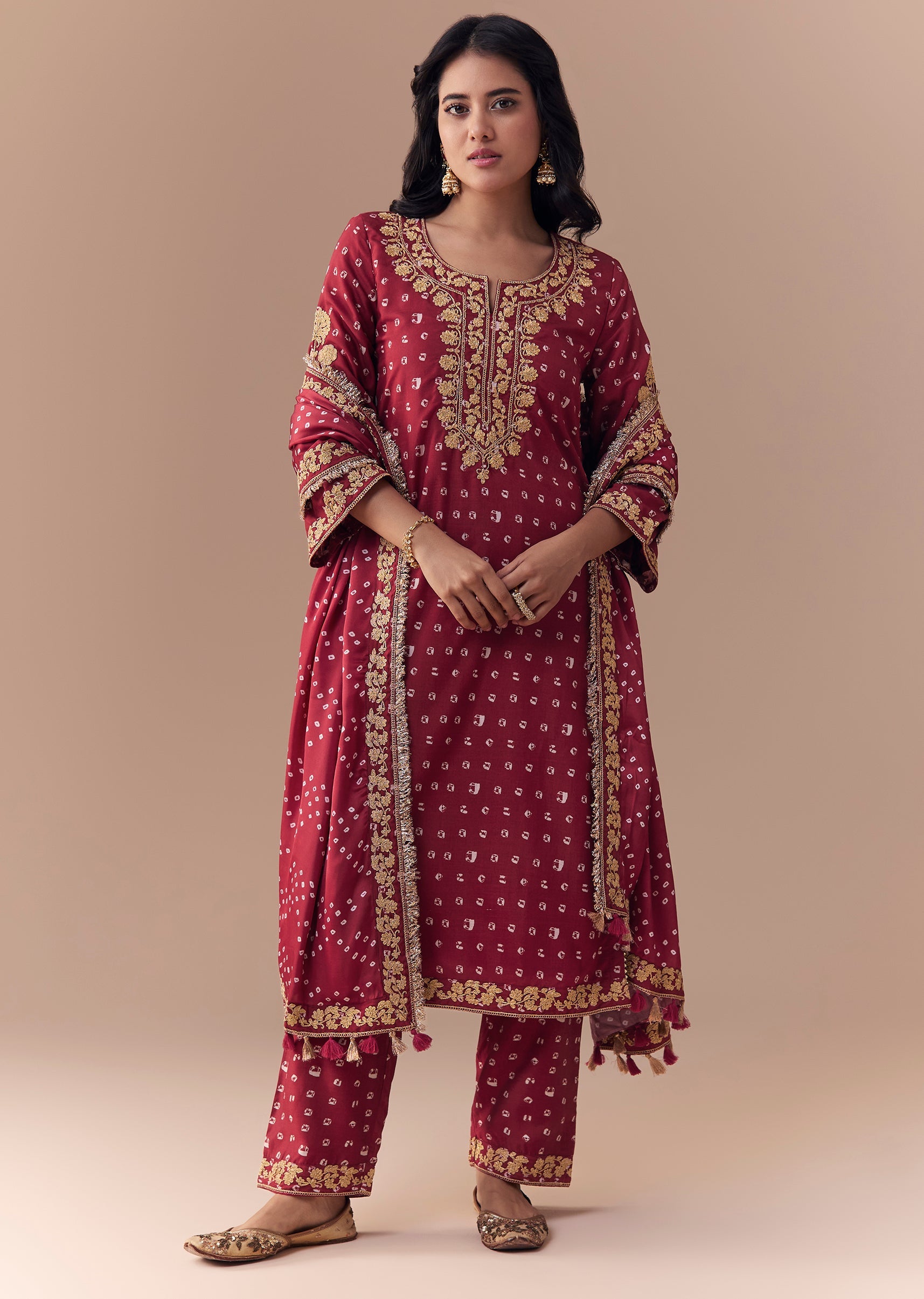 Vibrant bandhani prints and zari thread work bring festive sparkle to this elegant kurta set. The rich maroon silk pant and dupatta add a luxurious sheen, balancing tradition with refined... More Product Details