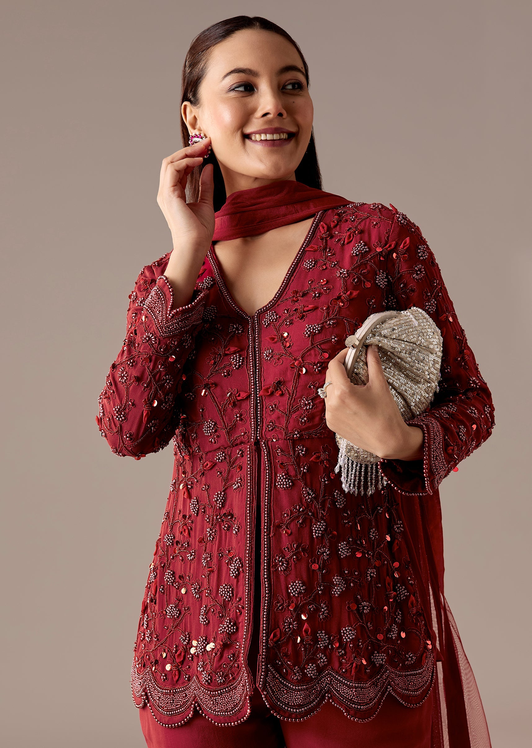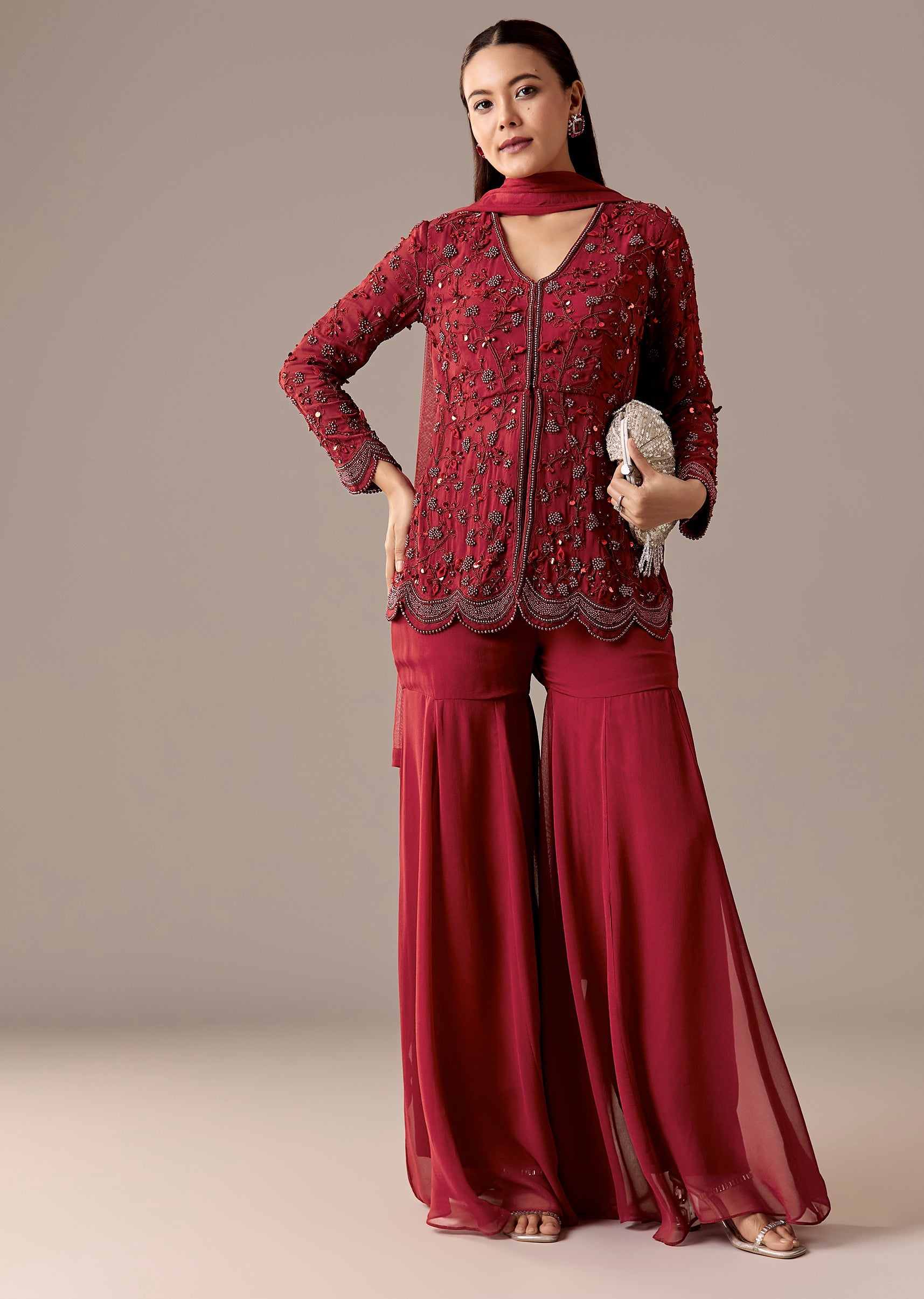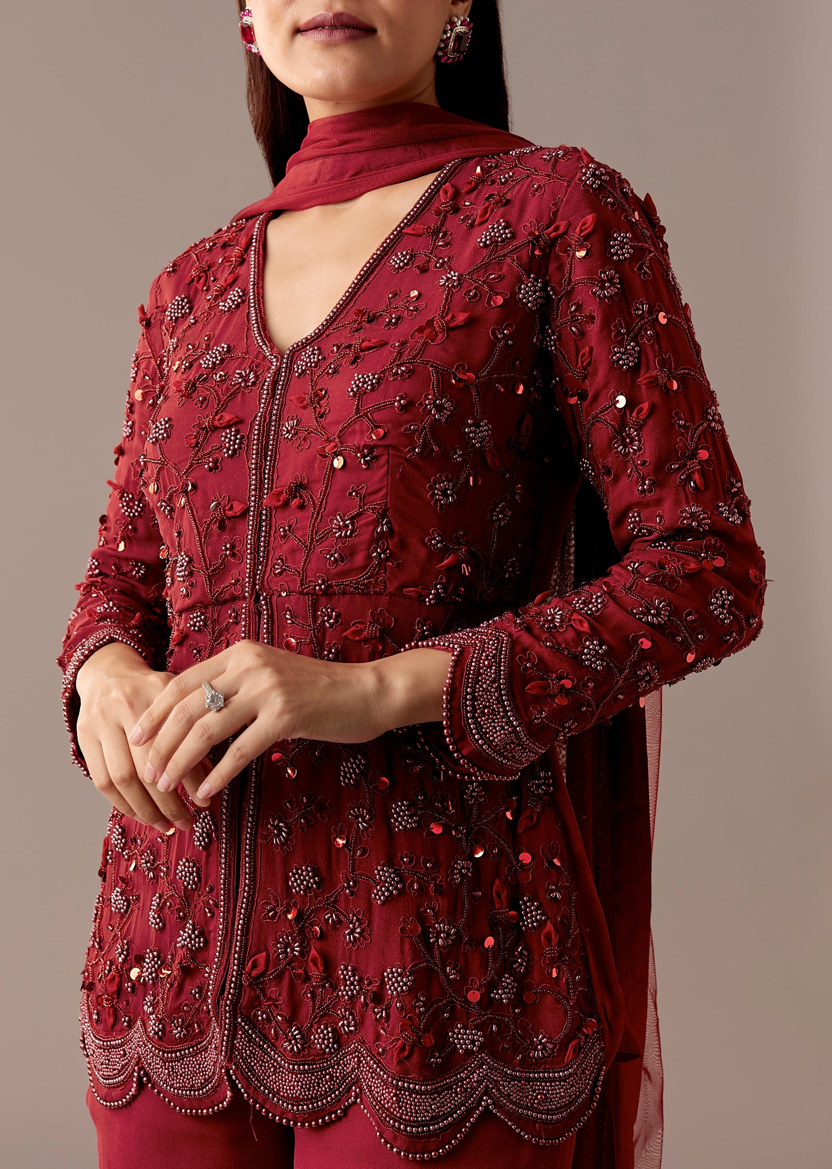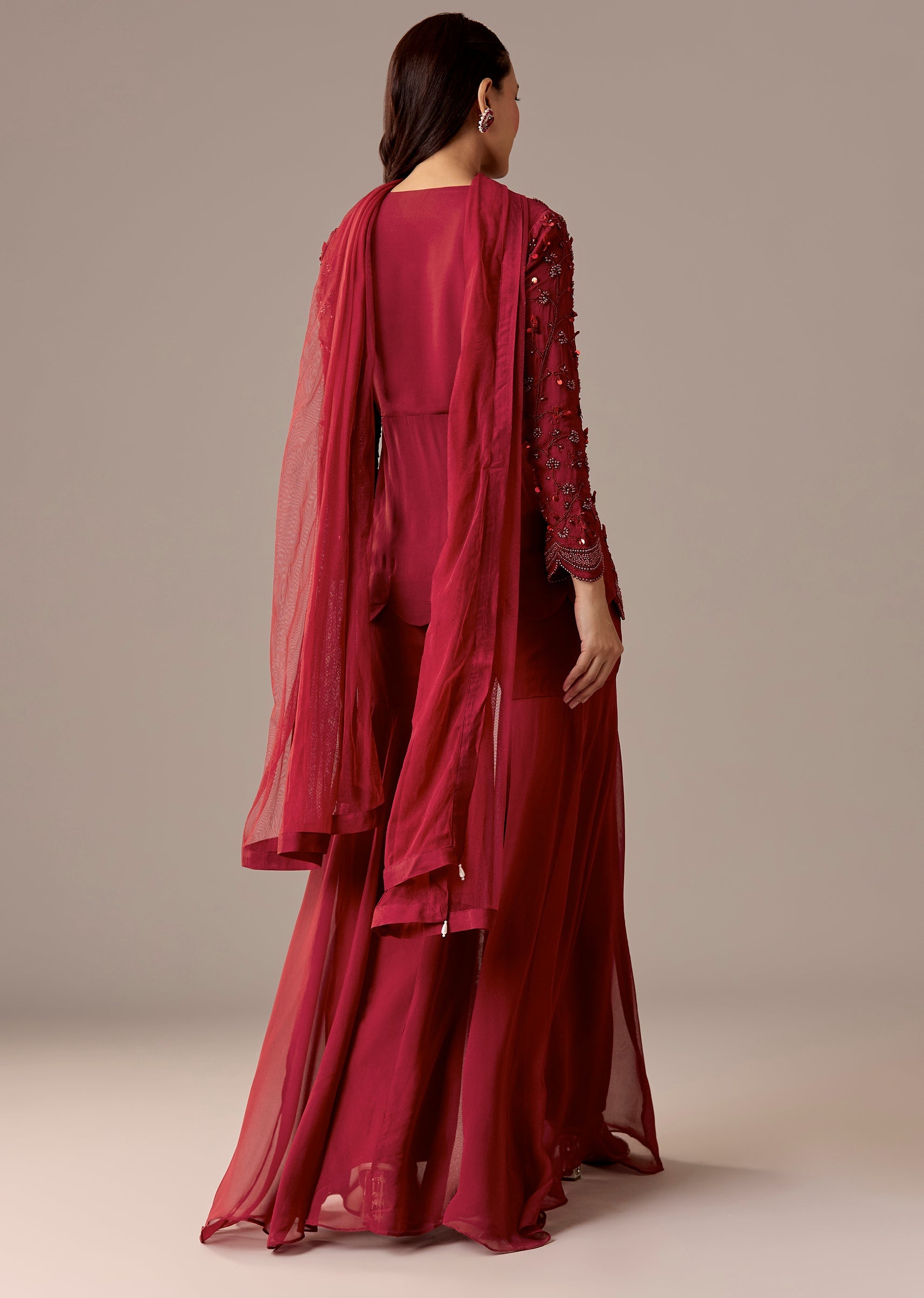A rich maroon peplum kurta set with beadwork, styled with a flared sharara and matching dupatta. V-neckline and 3/4th sleeves make it a strong engagement and reception pick.Awarded as the... More Product Details