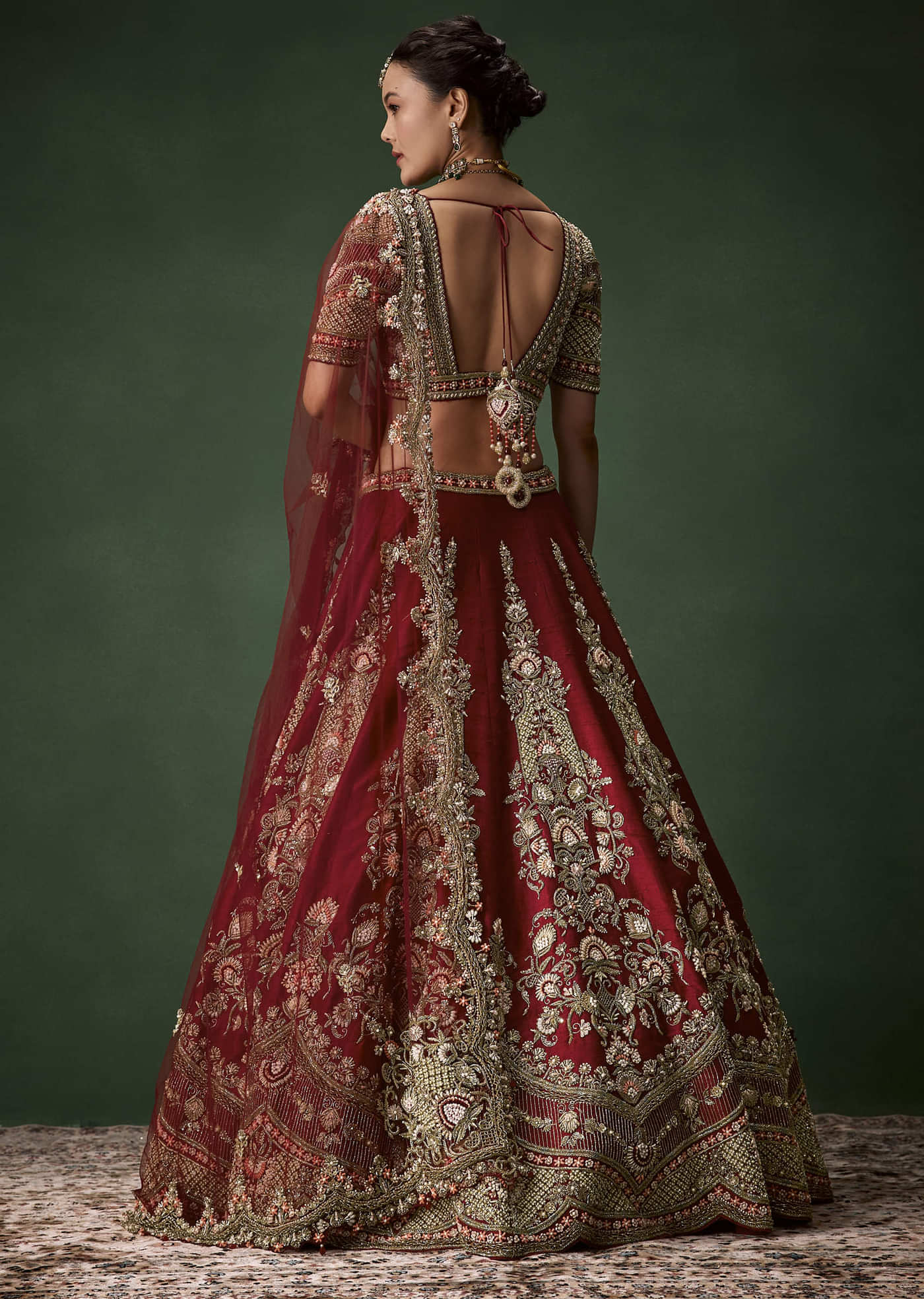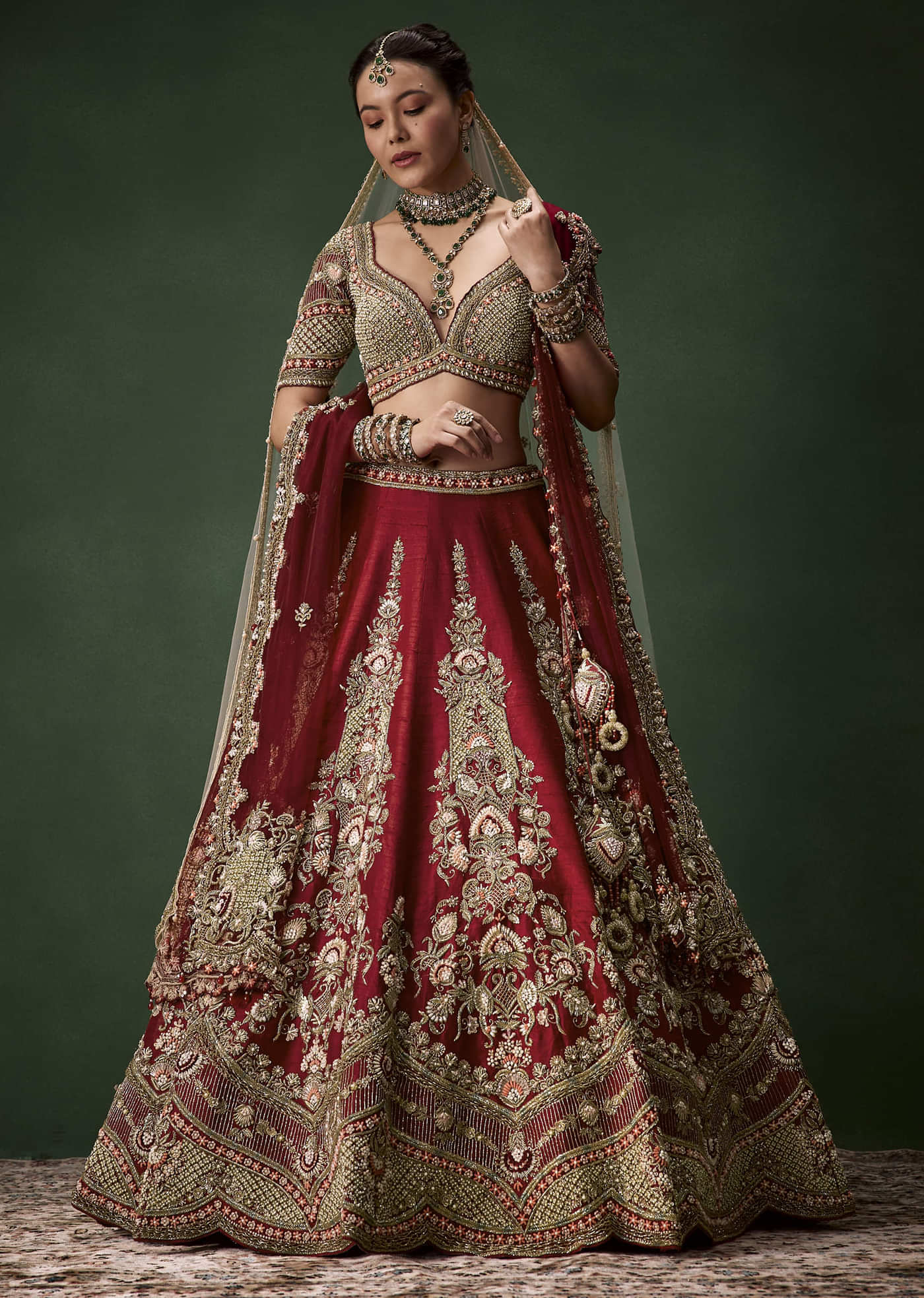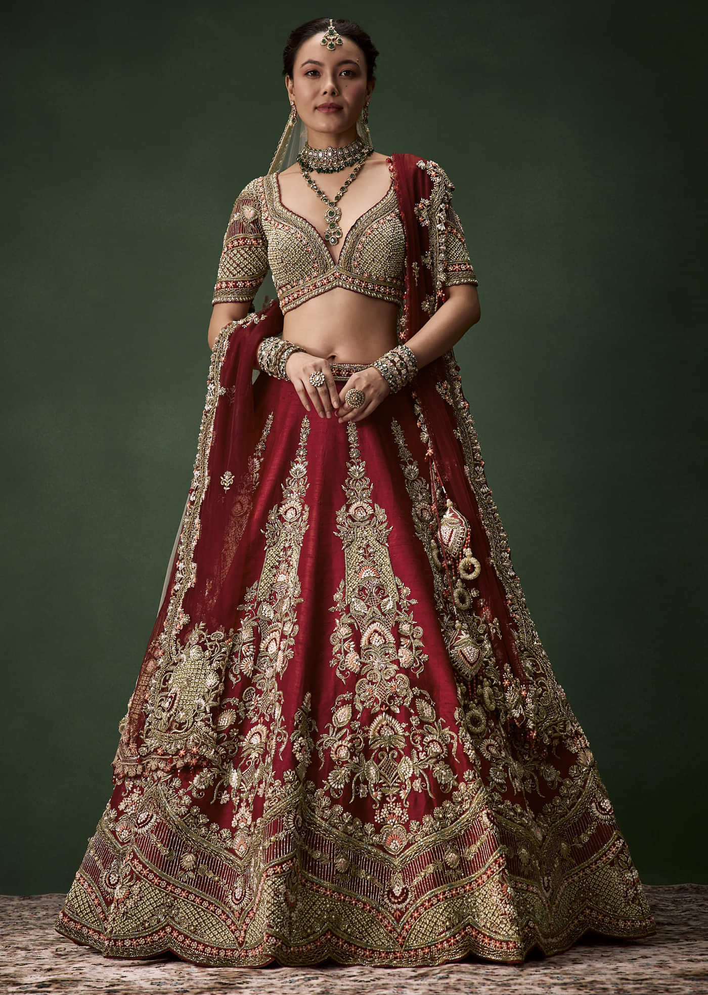 Maroon Bridal Lehenga Set In Raw Silk with Two Dupattas