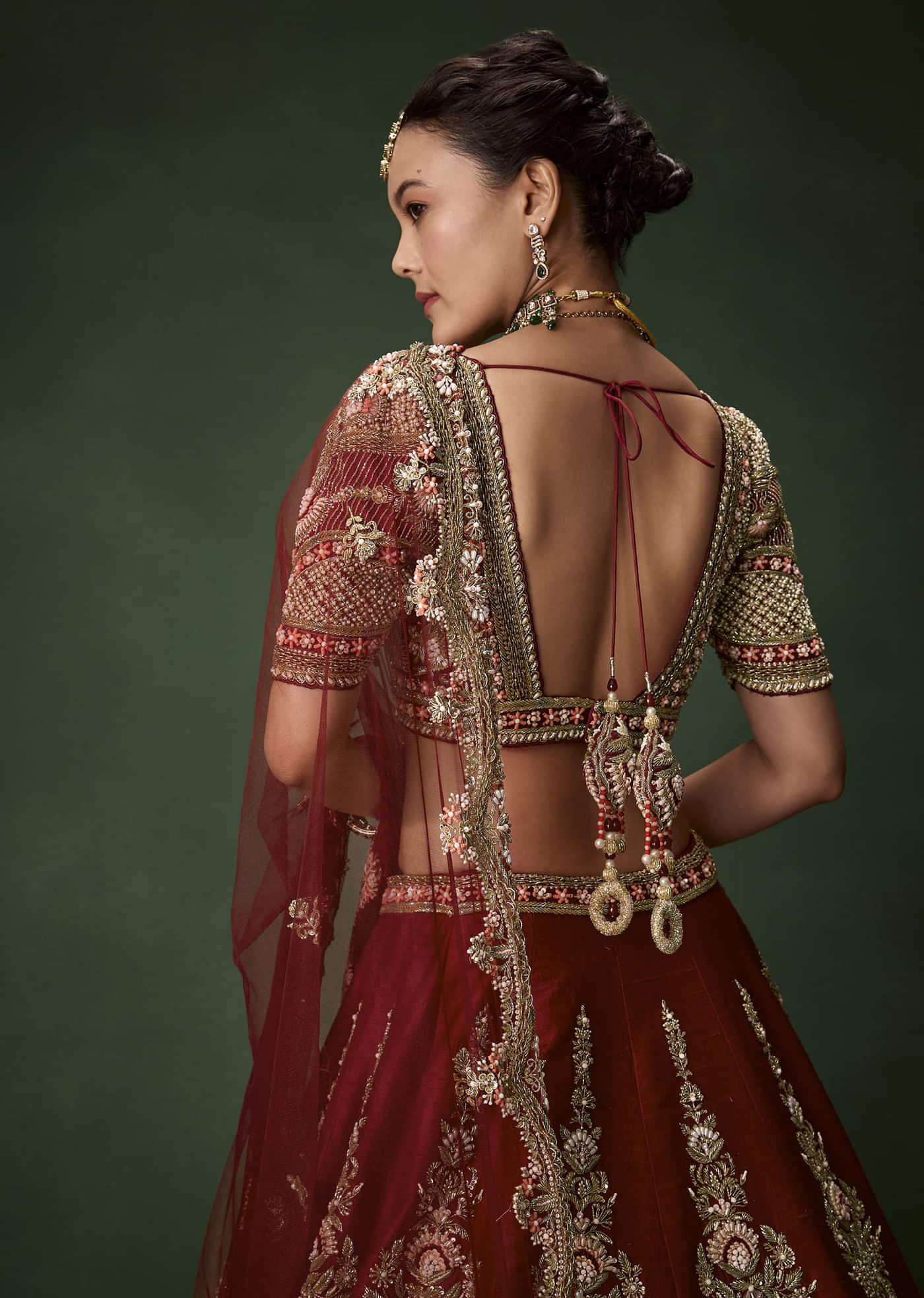 A refined ode to heritage artistry, this maroon lehenga set is designed to illuminate your bridal moments. The rich silk surface is adorned with delicate zardozi and patchwork detailing, creating... More Product Details
