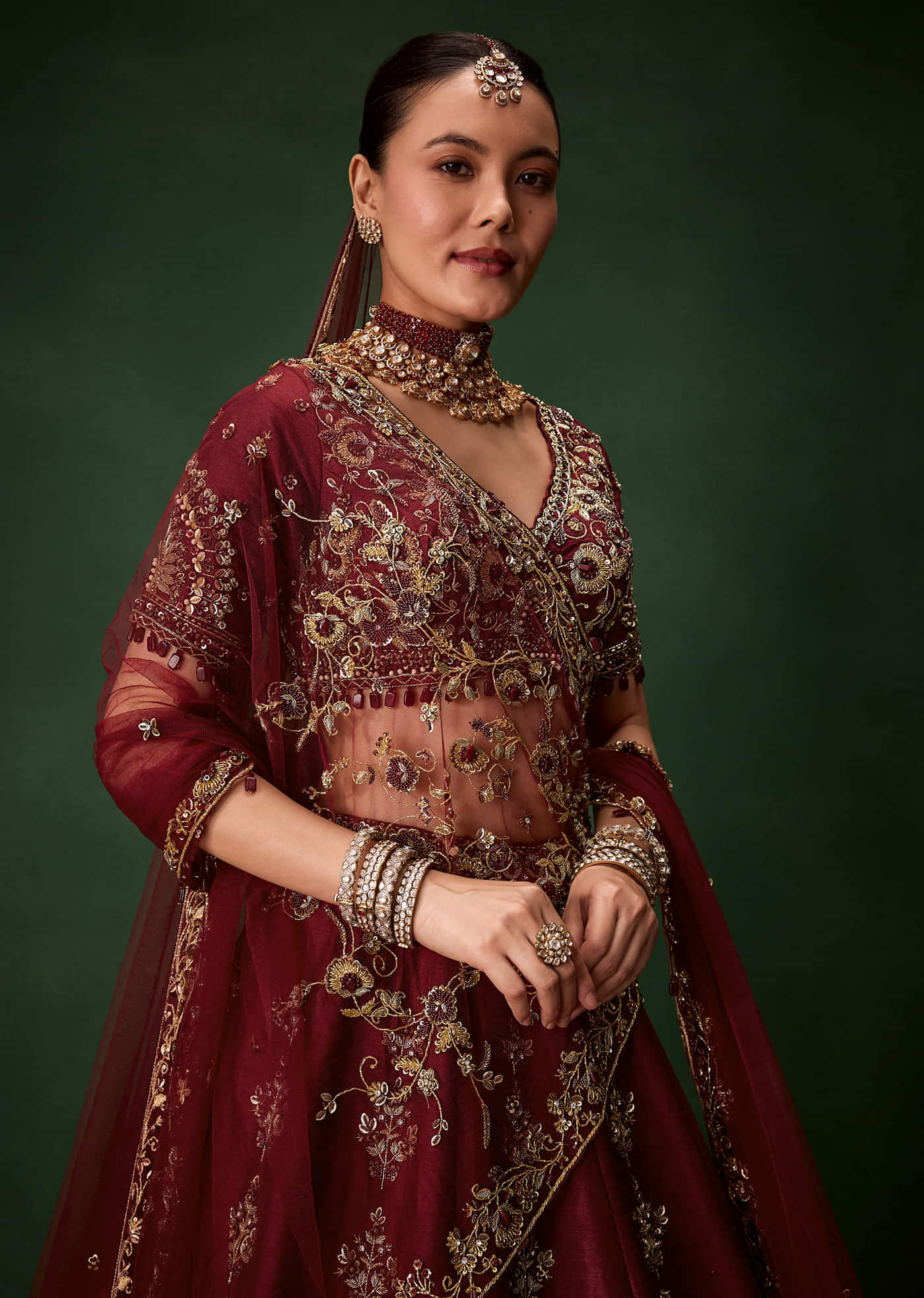 Maroon Bridal Moti Silk Lehenga Set with Two Dupattas
