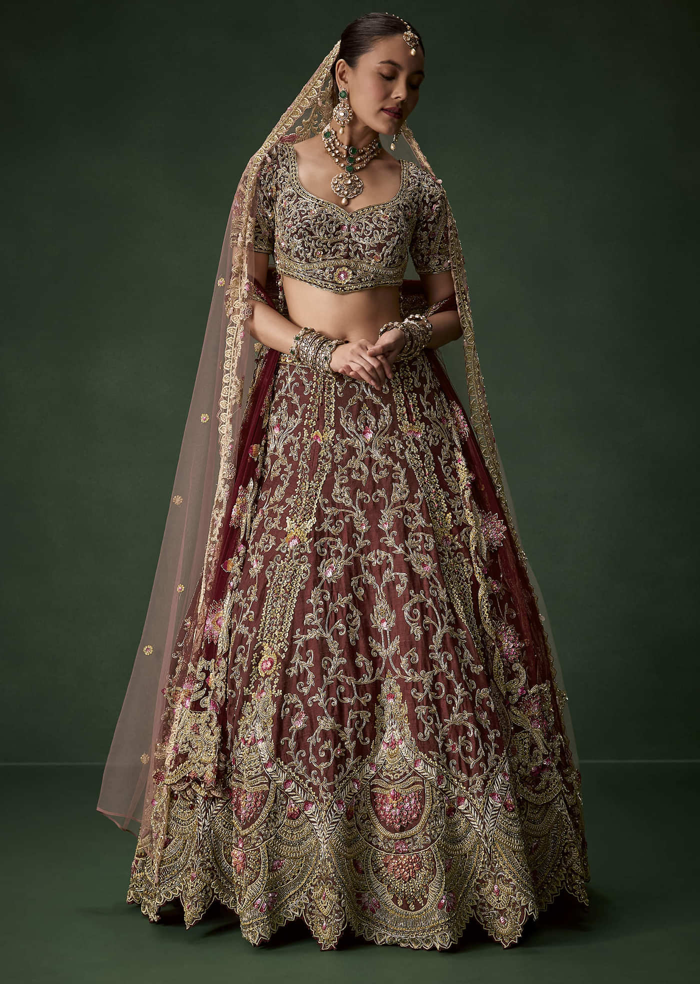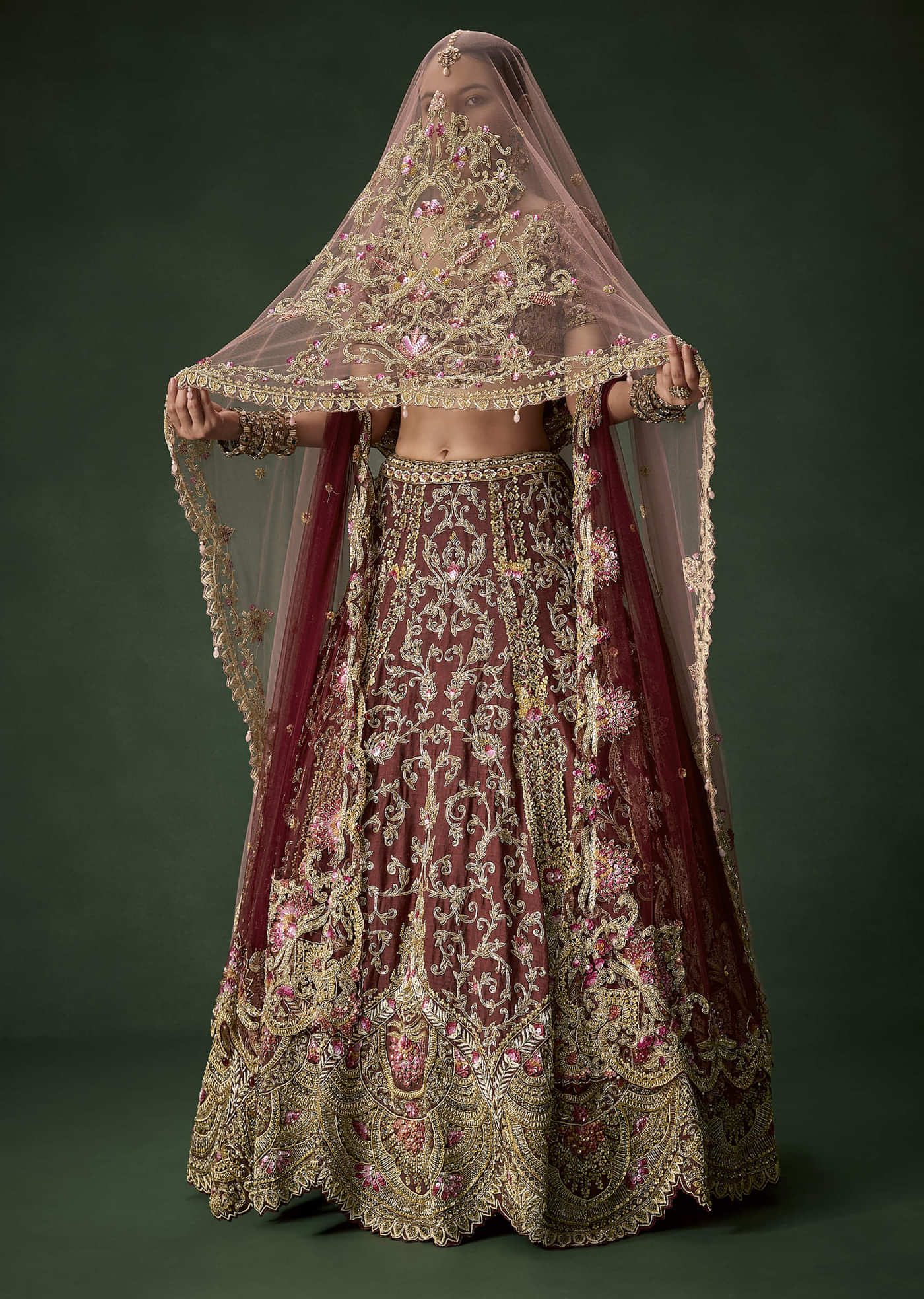 Maroon Bridal Silk Embellished Lehenga Set with Two Dupattas
