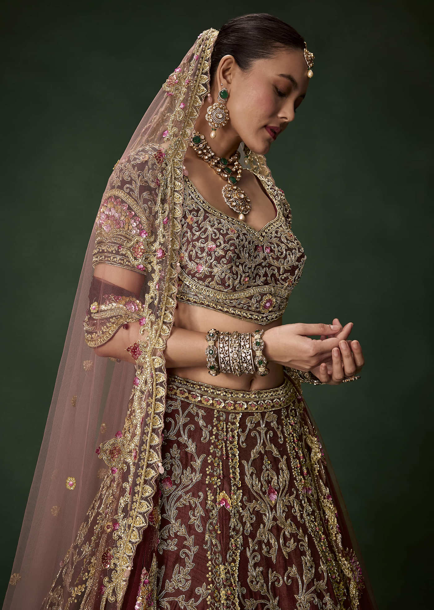 Steeped in royal charm, this maroon silk lehenga set embodies classic bridal splendor with a contemporary touch. The rich maroon tone captures heritage elegance, while exquisite sequin and cutdana detailing... More Product Details