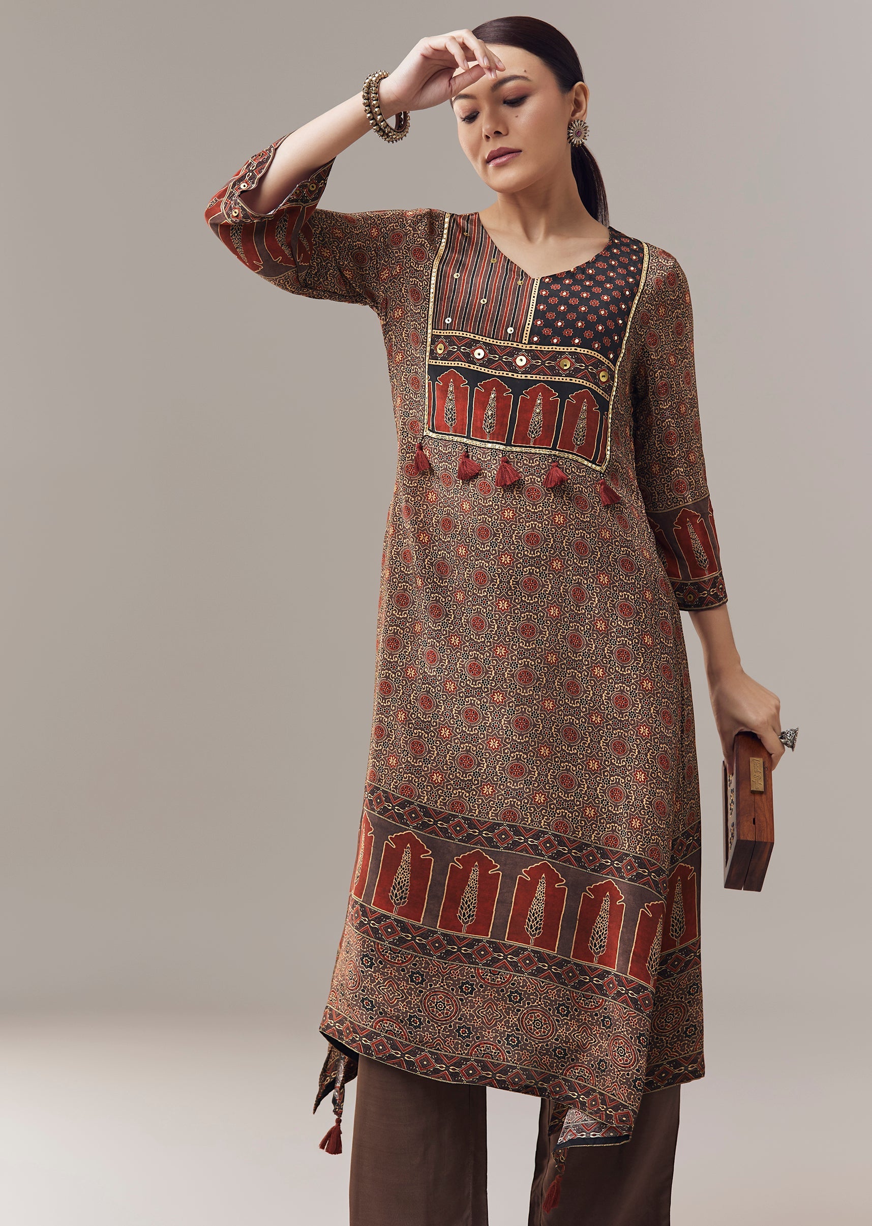 Pair it with neutral juttis and minimal jewellery to let the sequins detailing and Ajrakh print stand out.