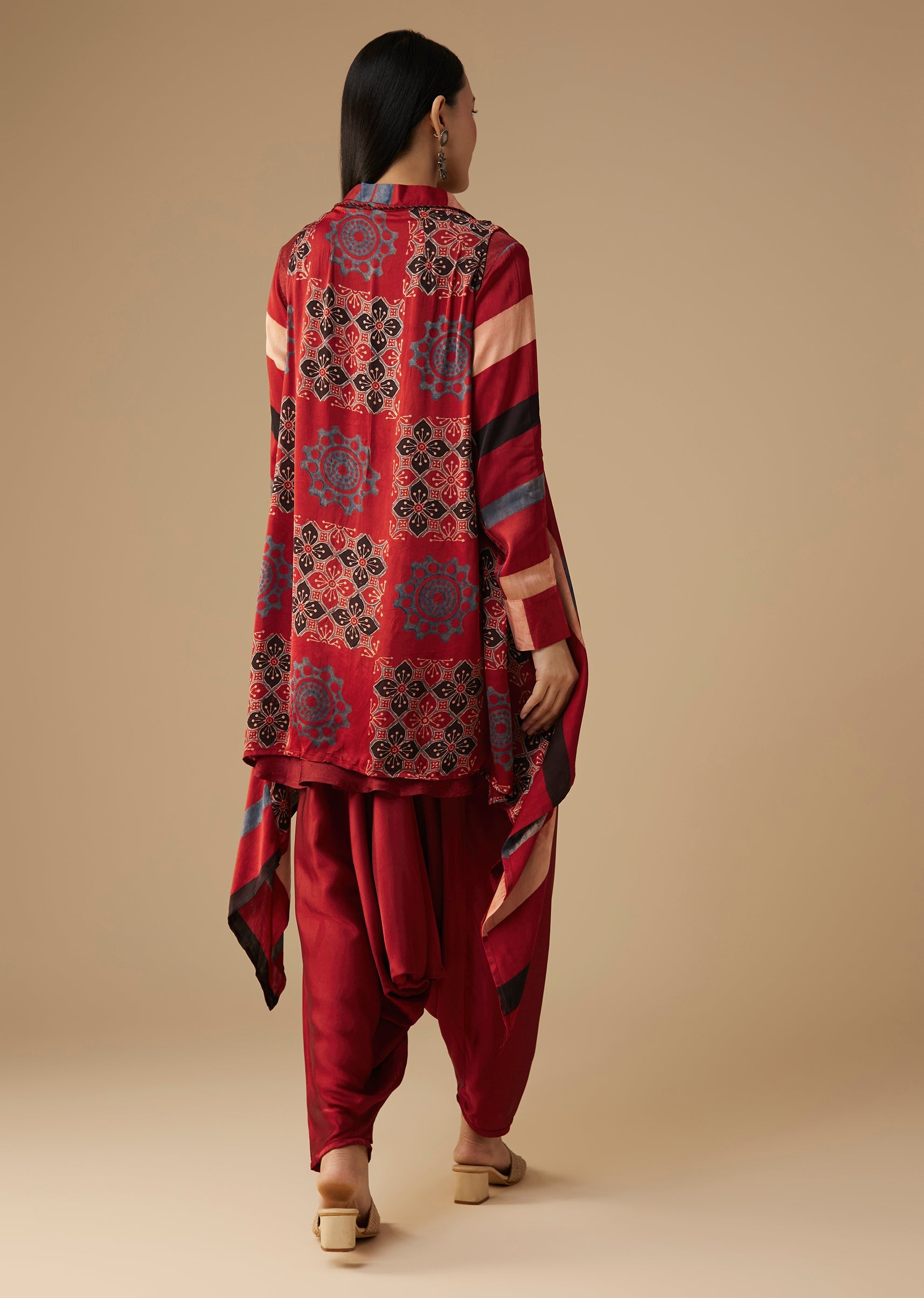 Maroon Hand Dyed Ajrakh Jacket, Shirt and Dhoti Set