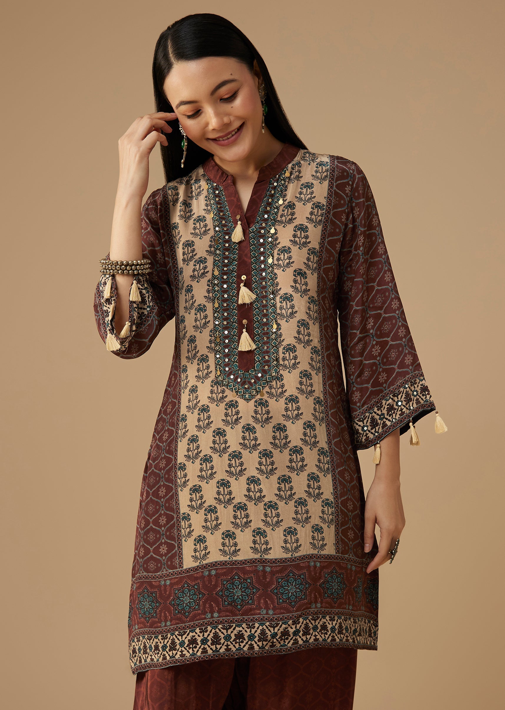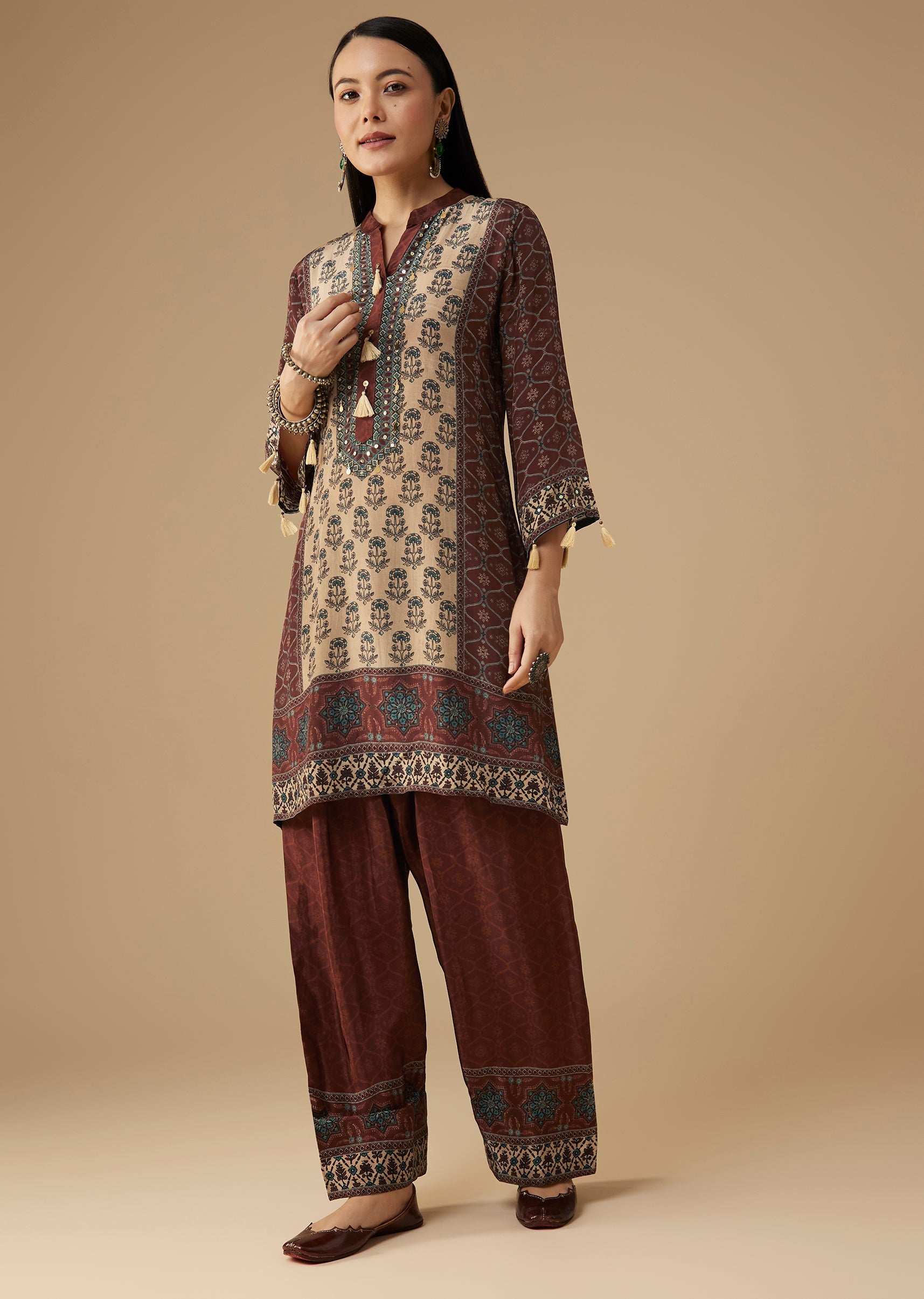 Infuse your everyday ethnic style with this maroon crepe kurta set, showcasing indie-inspired prints highlighted by subtle sequin work for a touch of sparkle. The soft crepe fabric drapes beautifully, offering both comfort and refined appeal, while the coordinated pants complete the look with effortless ease. Perfect for festive lunches, casual gatherings, or semi-formal events, this set brings together artistry and modern simplicity. Awarded as the Most Trusted Brand, we're delivering styles you love, just as promised.