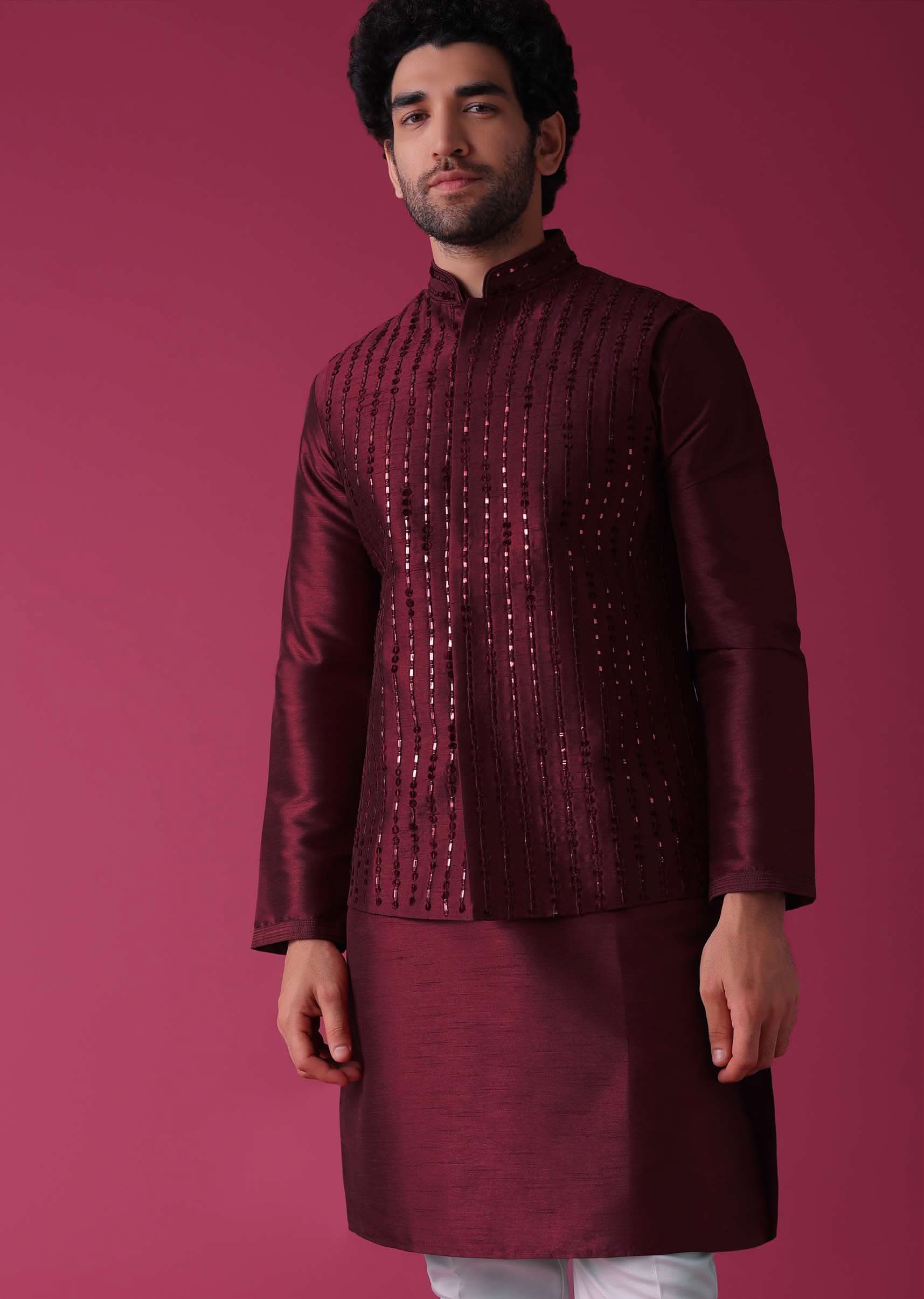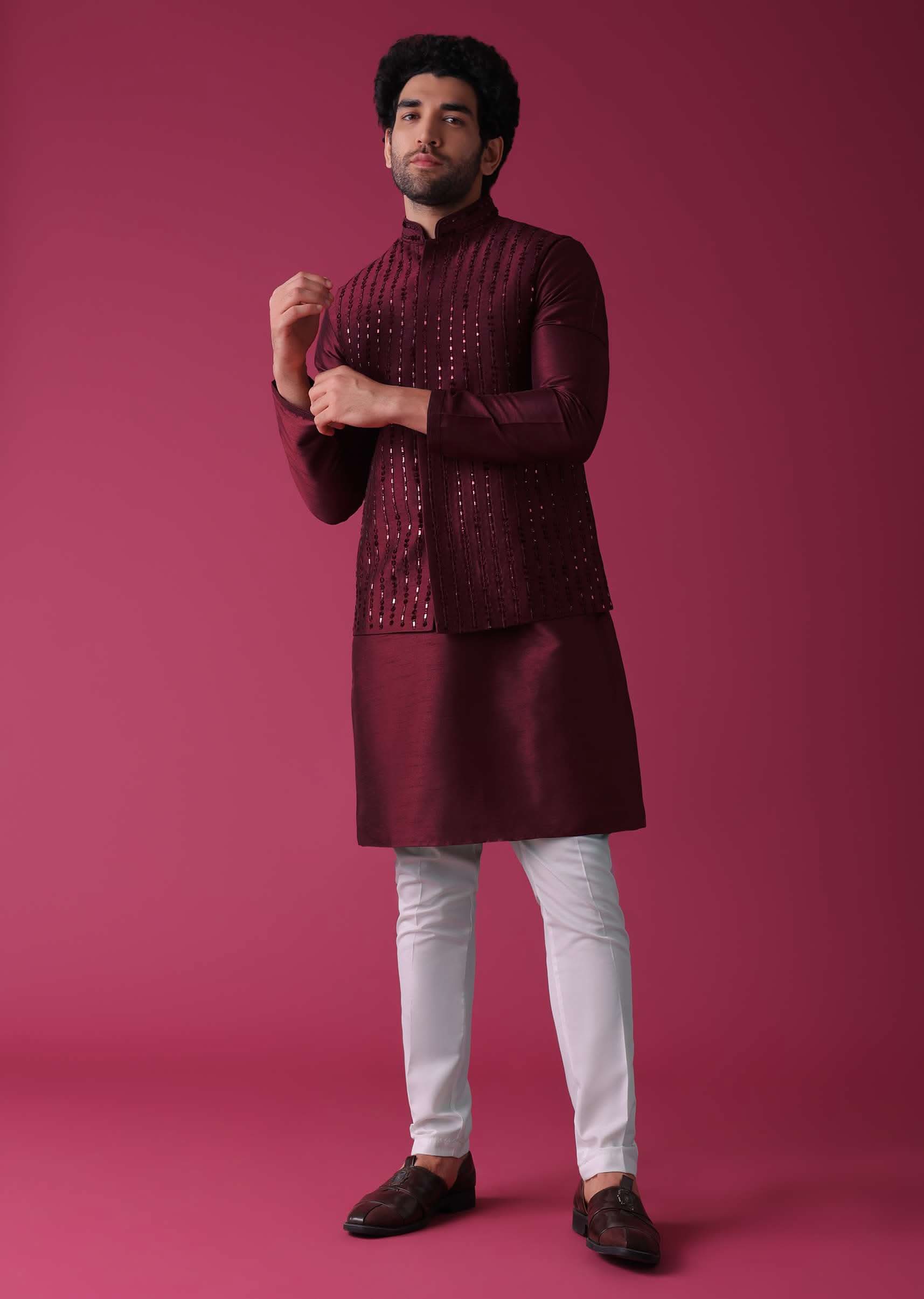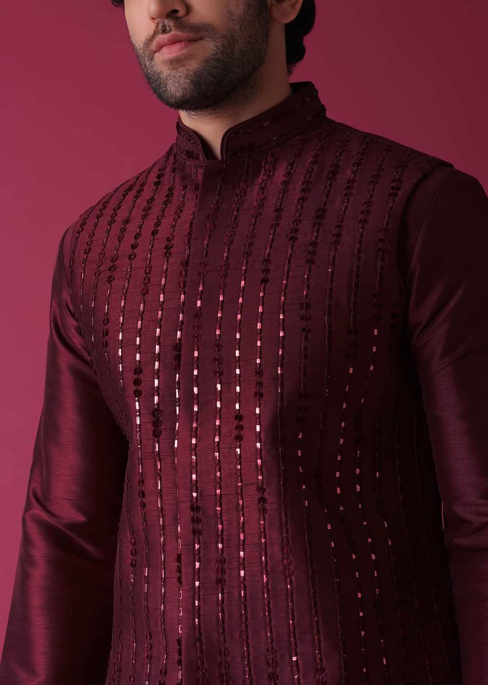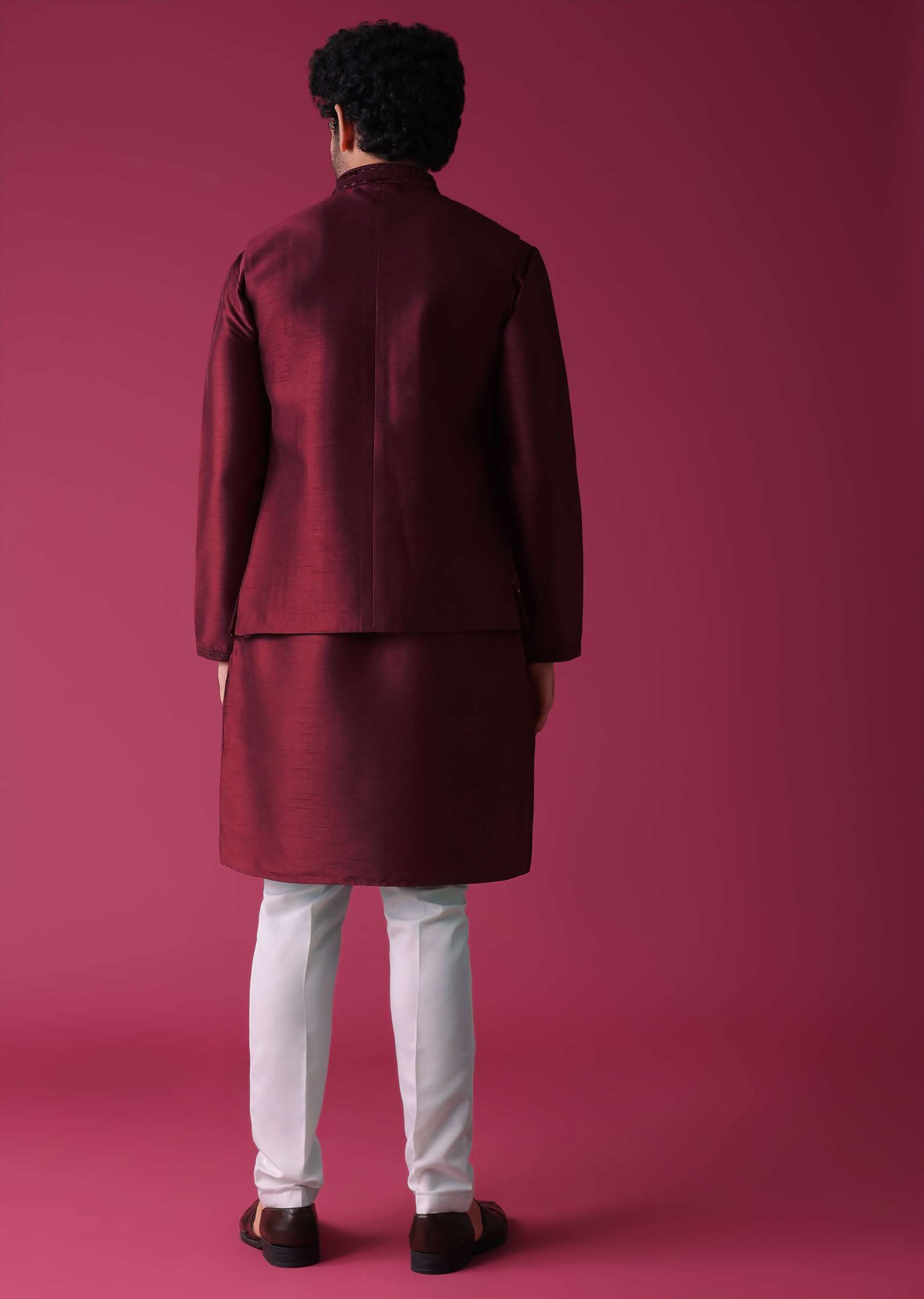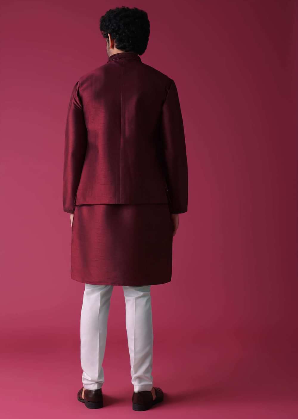 Maroon Red Jacket Kurta Set In Silk With Threadwork
