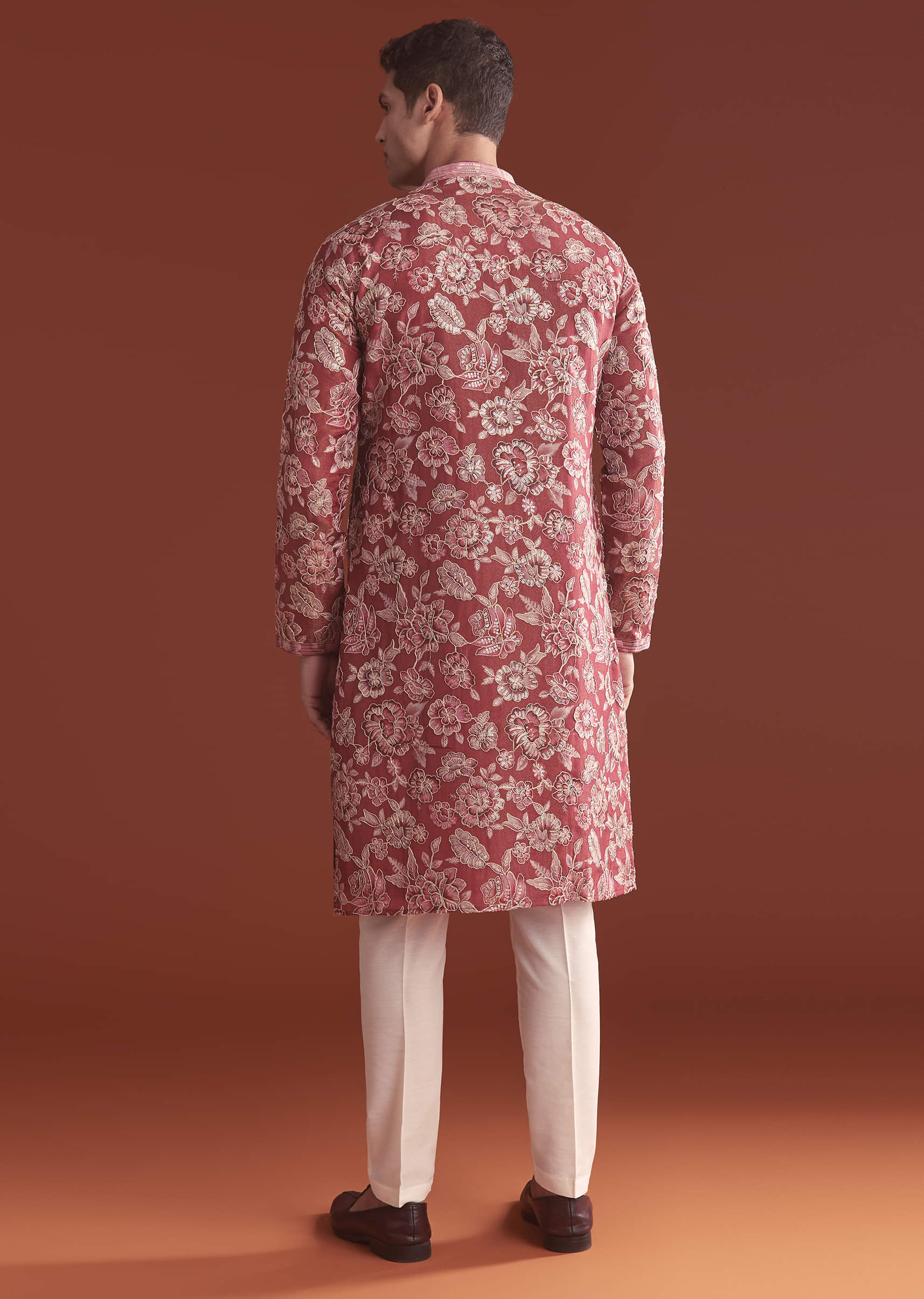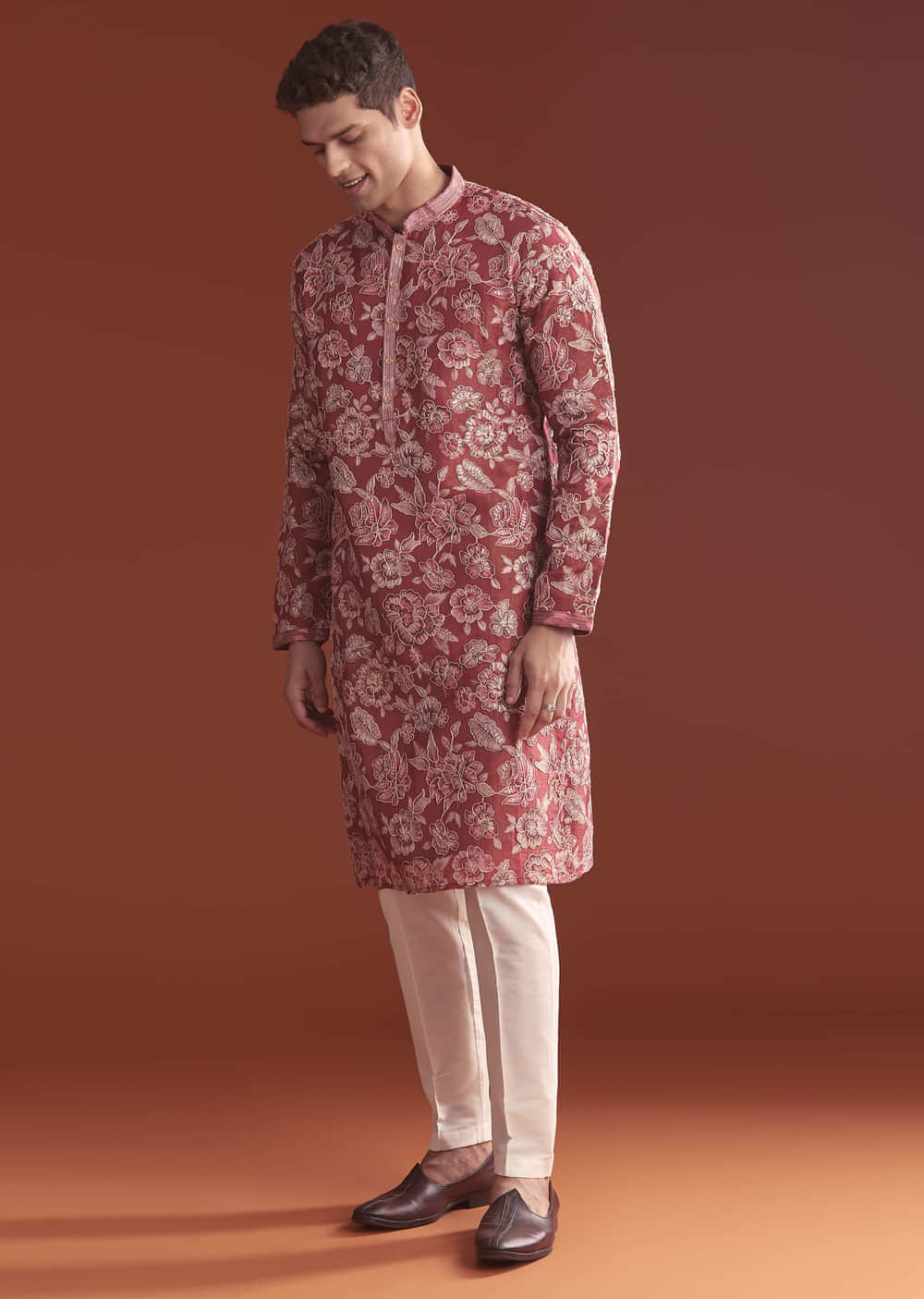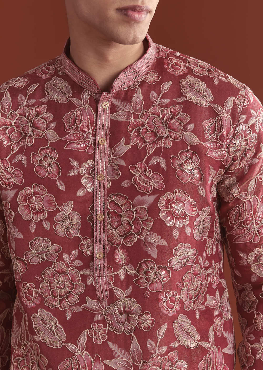 Maroon Silk Kurta Set For Men With Floral Thread Work