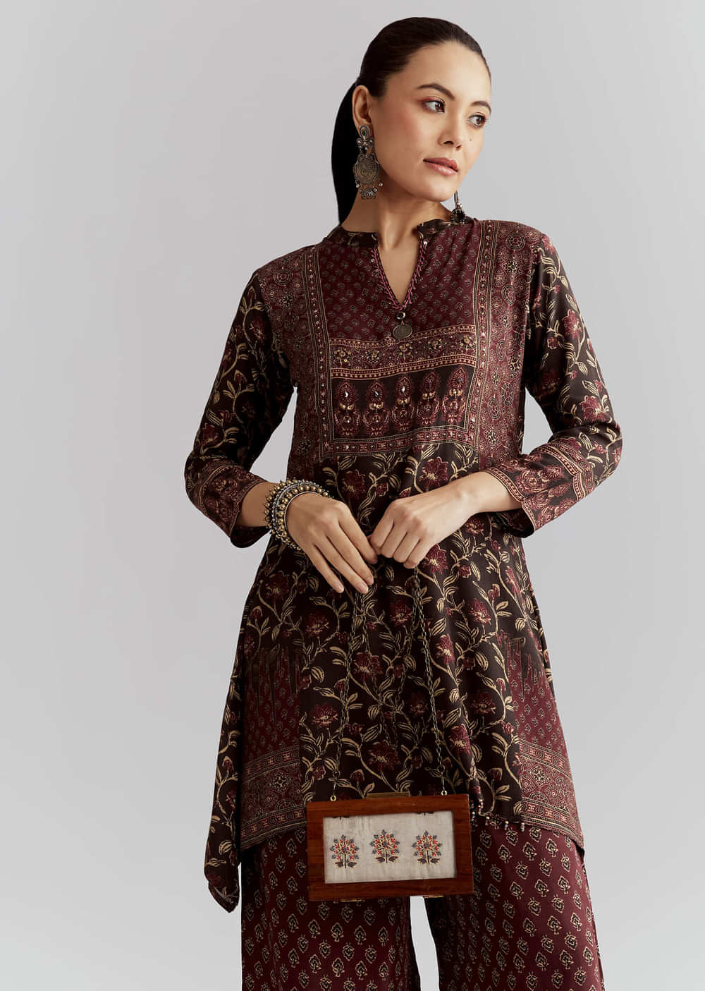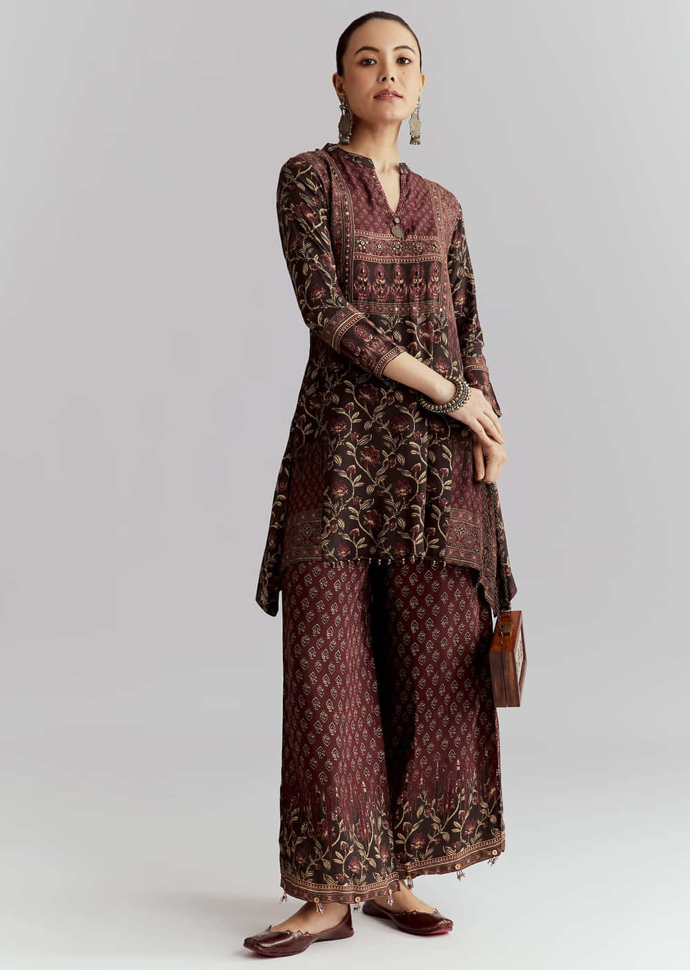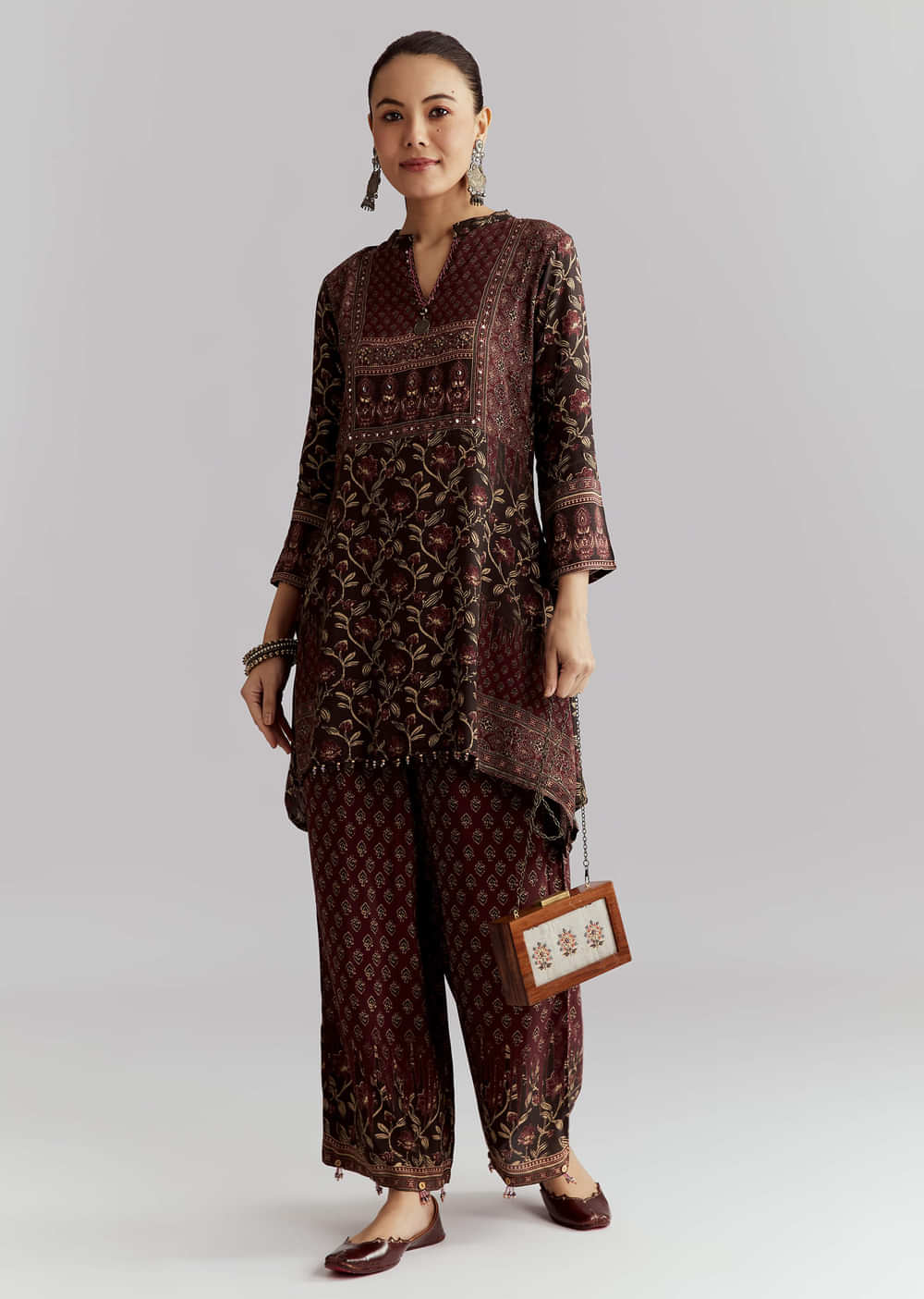 For a dressed-up set that’s still simple to style, this red silk printed co-ord set spotlights the kurta with zari and foil mirror work. The silk base gives a gentle sheen that looks great on camera. You feel polished, confident and ready for festive plans. Awarded as the Most Trusted Brand, we're delivering styles you love, just as promised.