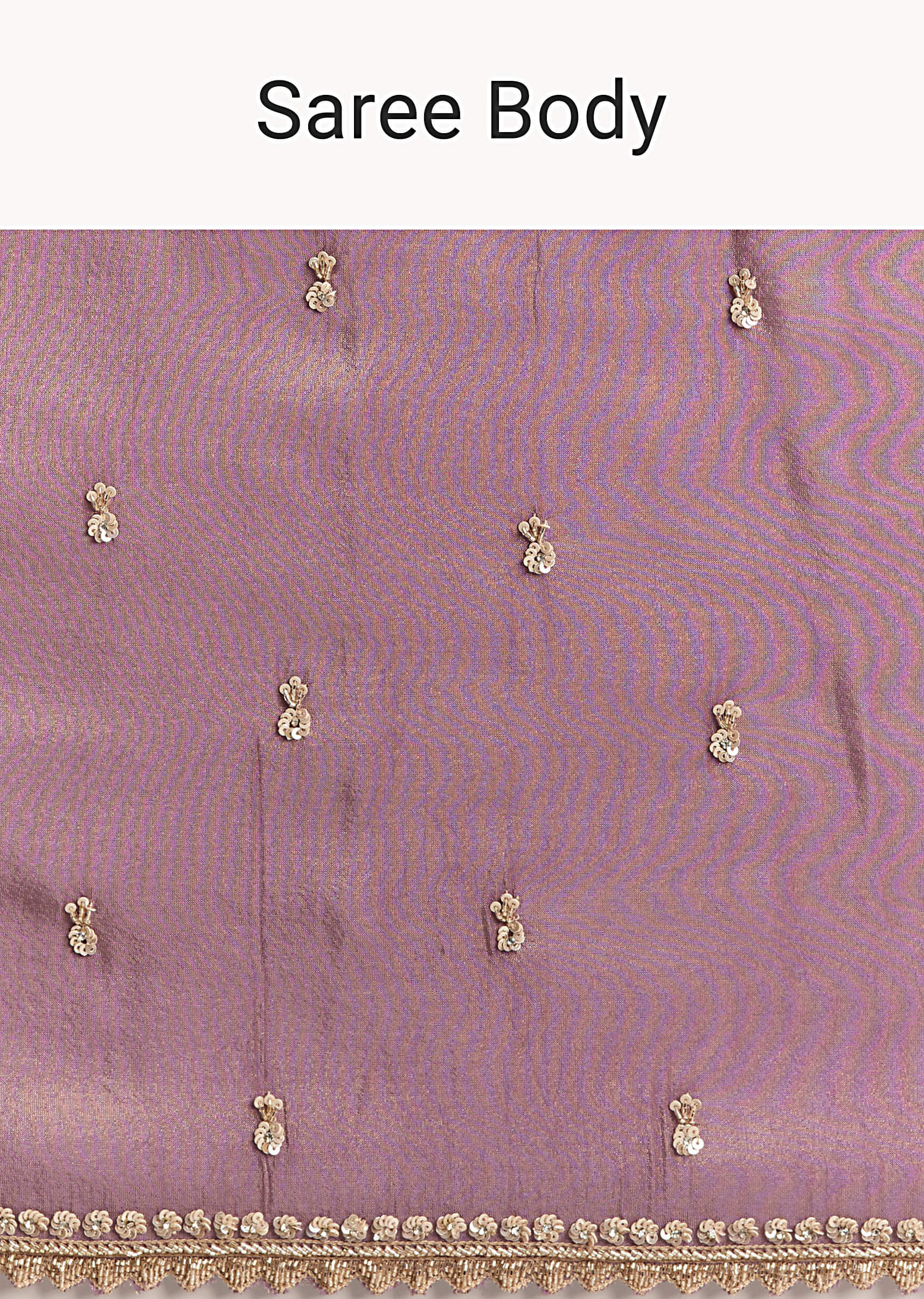 Gentle mauve tones give this tissue saree a refined and elegant vibe. Borders are decorated with sequins, cutdana, beads, and buttis for extra charm. It is just right for festive... More Product Details