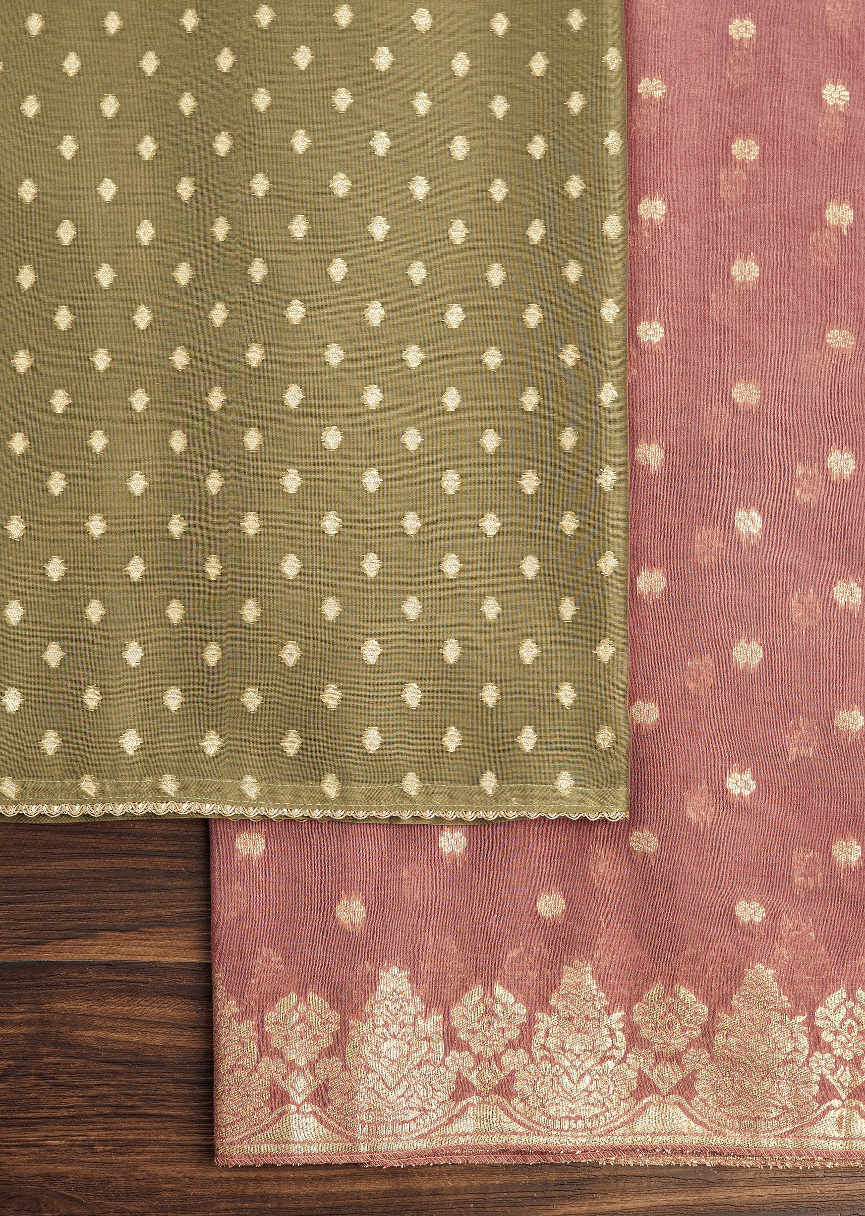 A blend of heritage craftsmanship and modern finesse, this mehendi green Chanderi unstitched suit set is adorned with intricate zardosi, cutdana, and resham embroidery. The delicately embellished neckline and scattered motifs enhance its timeless allure. Complemented by a mauve Banarasi woven dupatta and a matching bottom fabric, this ensemble radiates understated luxury. Perfect for festive occasions and wedding gatherings, it exudes grace and sophistication. Awarded as the Most Trusted Brand, we're delivering styles you love, just as promised.