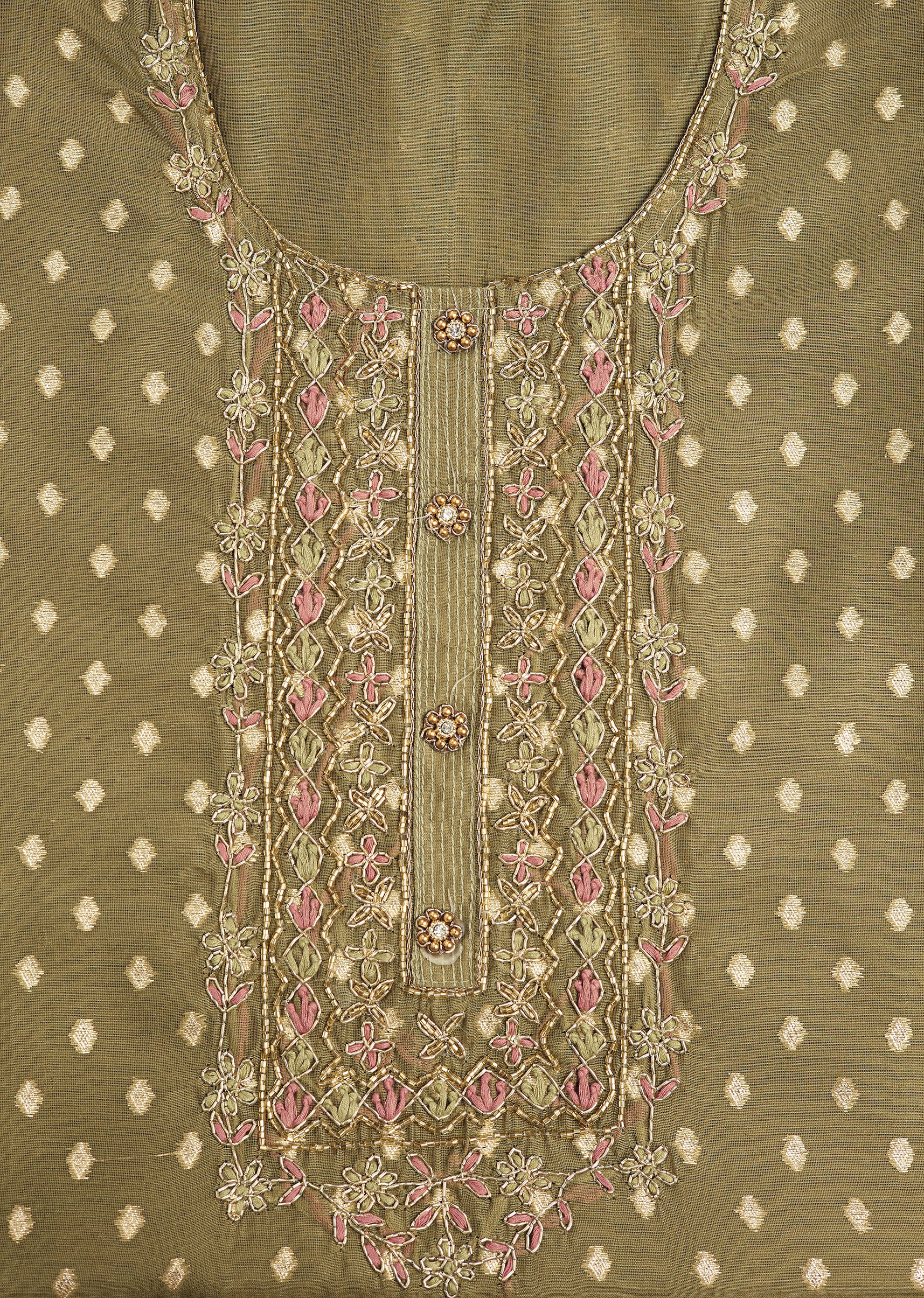 Mehendi Green Chanderi Unstitched Suit Set With Zardosi And Resham Work