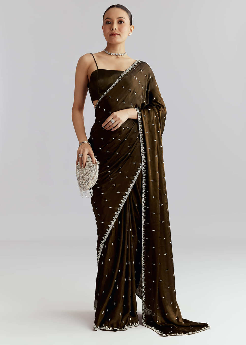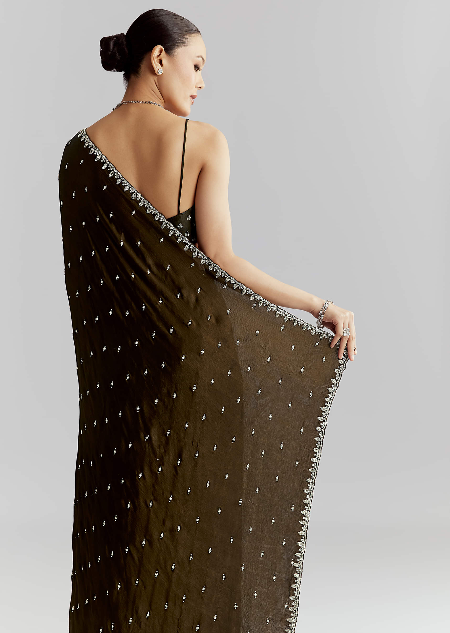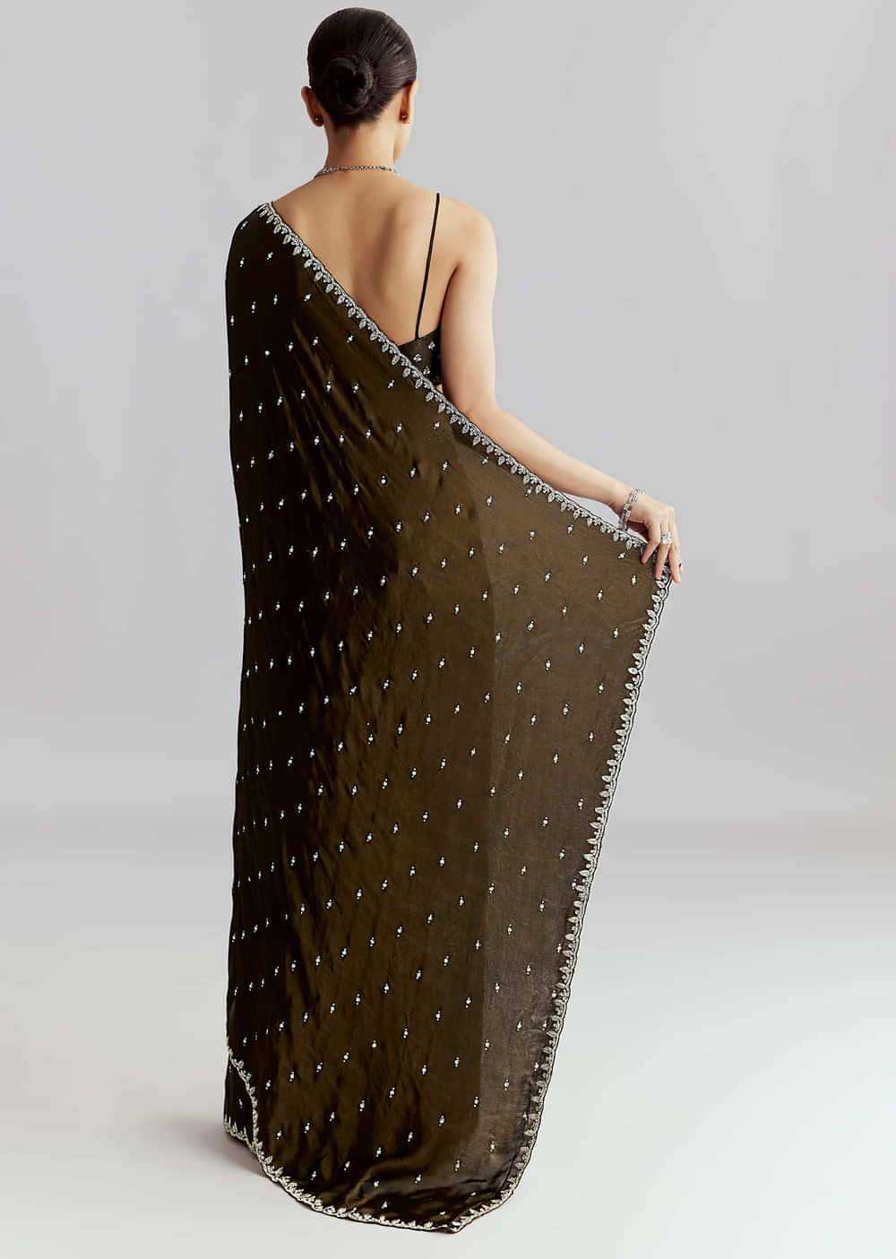 Designed for after-dark shimmer, this mehendi green chinon saree carries all-over butti with an embroidered border that catches every bit of light. Cutdana and stones add precise sparkle while the... More Product Details