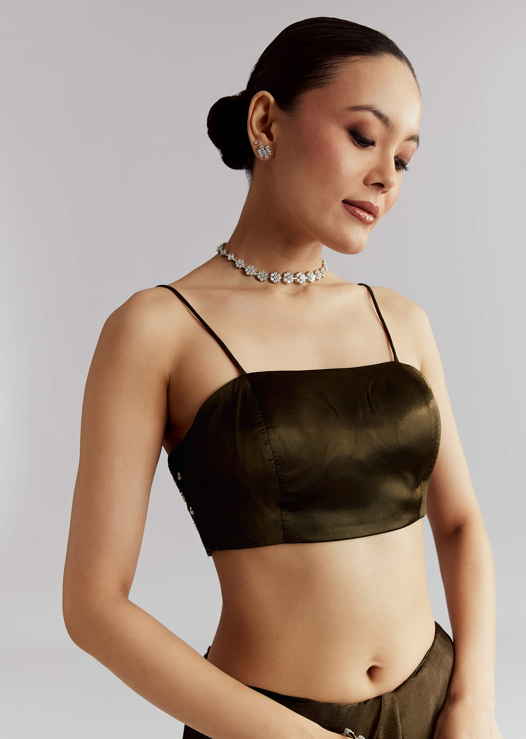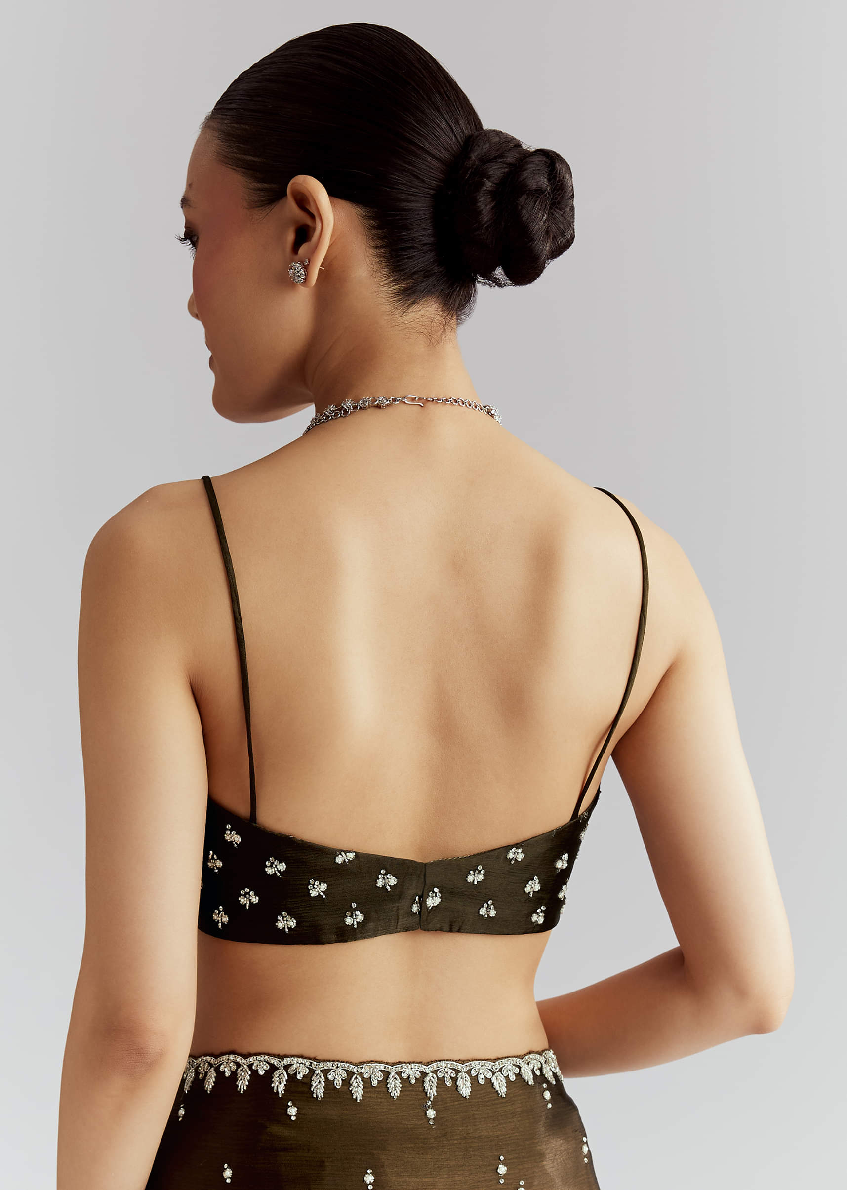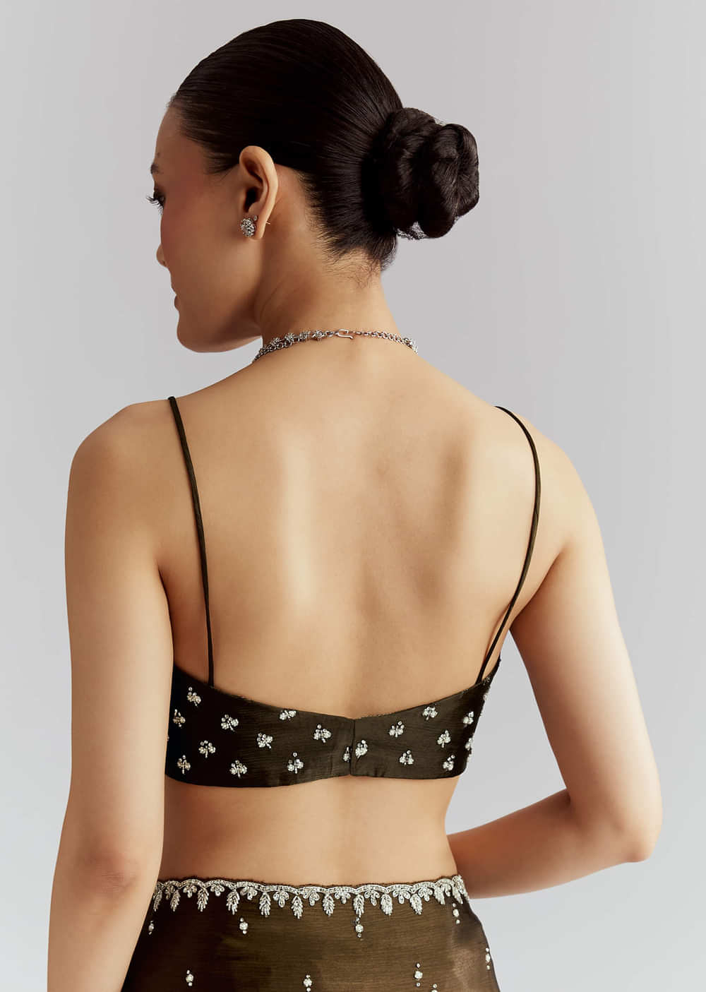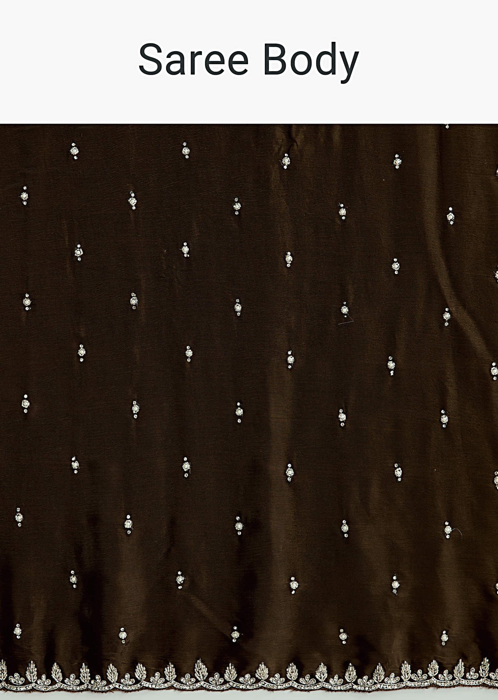 Designed for after-dark shimmer, this mehendi green chinon saree carries all-over butti with an embroidered border that catches every bit of light. Cutdana and stones add precise sparkle while the... More Product Details