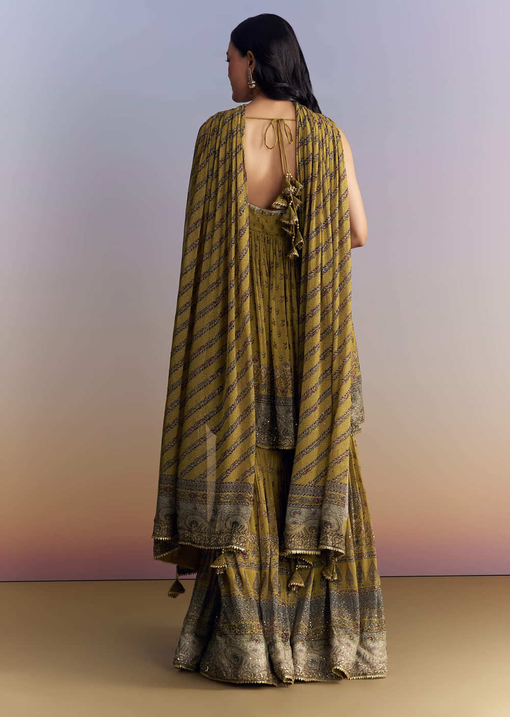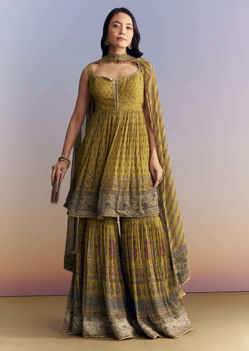 Mehendi Green Crepe Sharara Suit With Indie Print And Stone Work