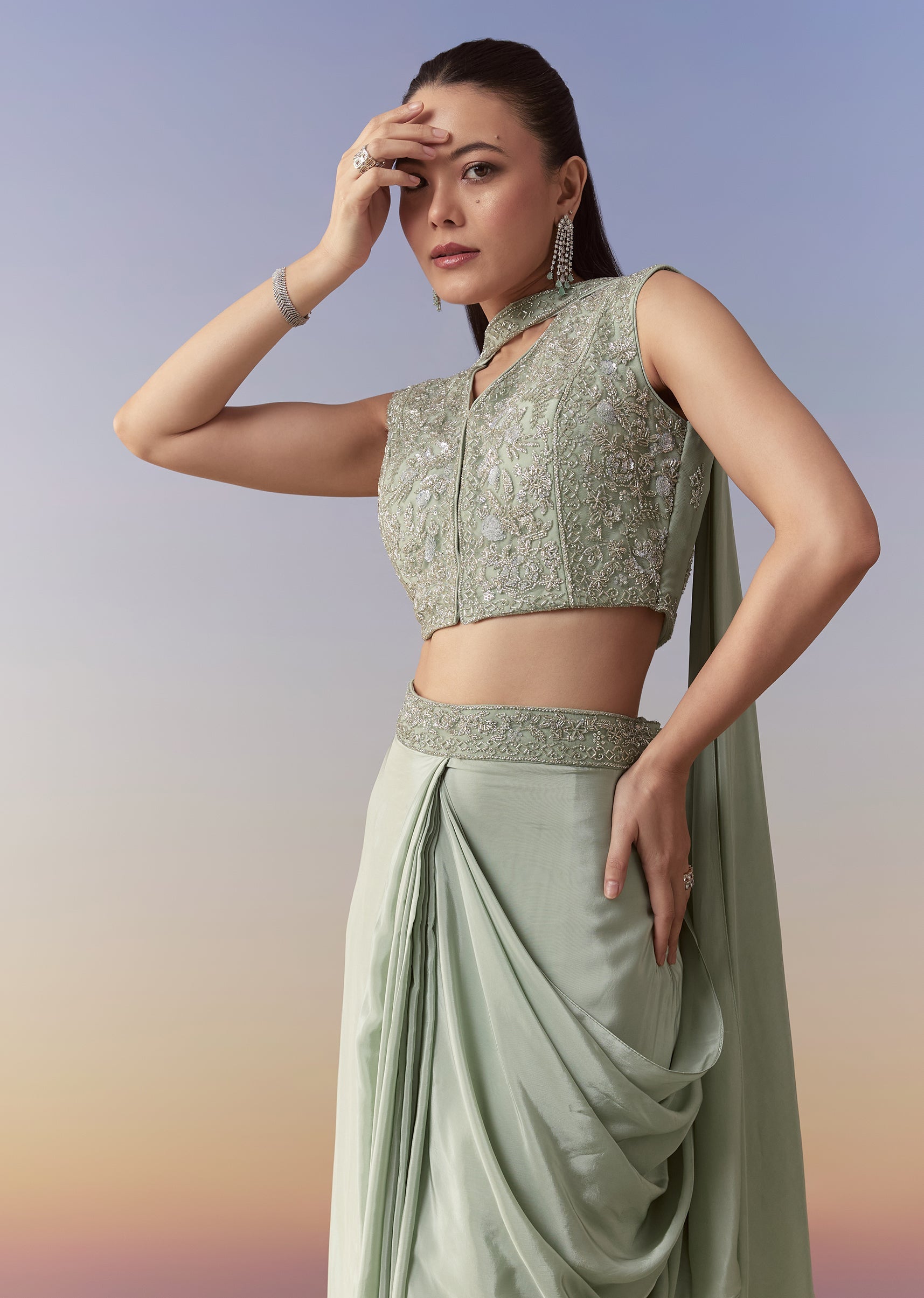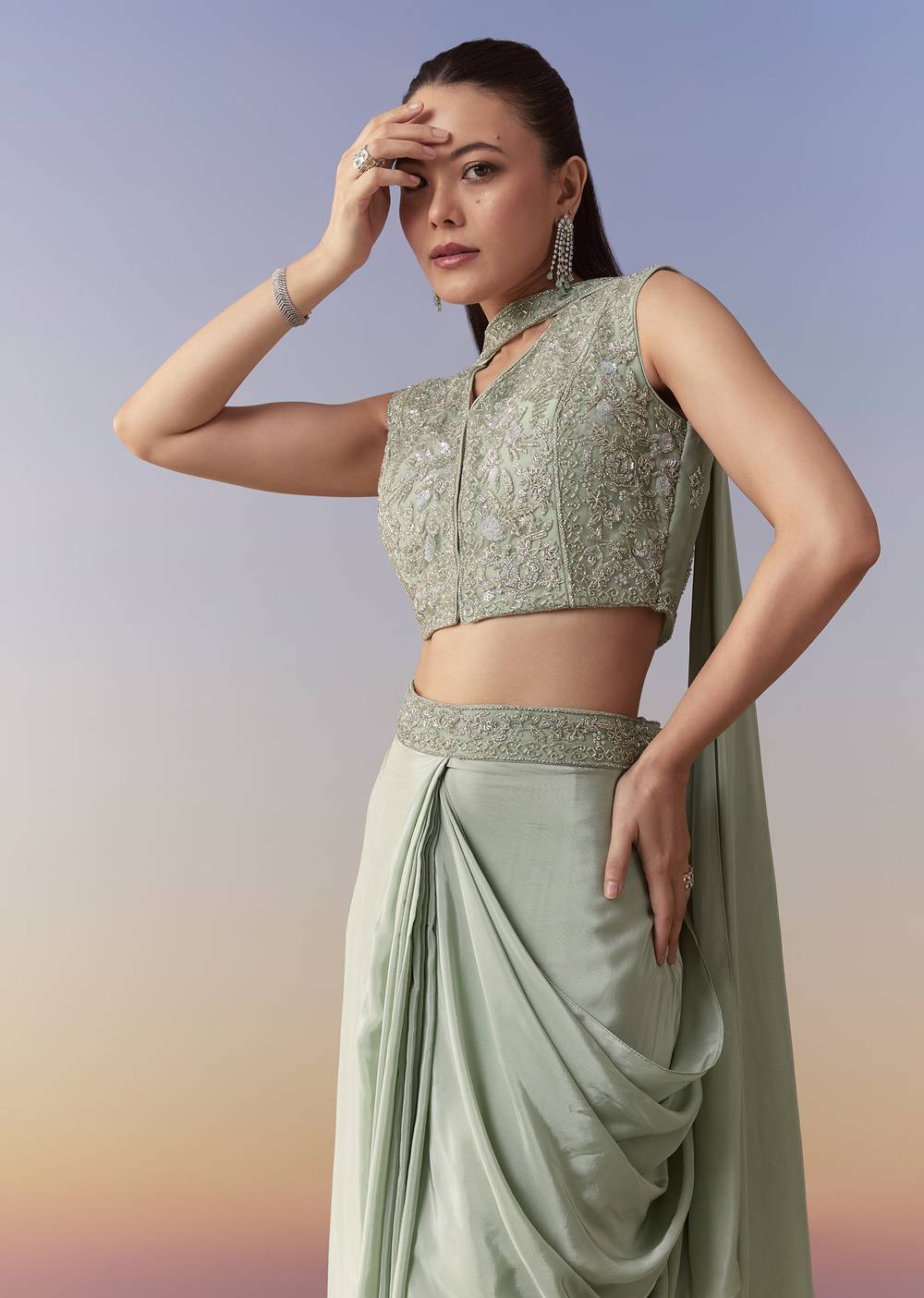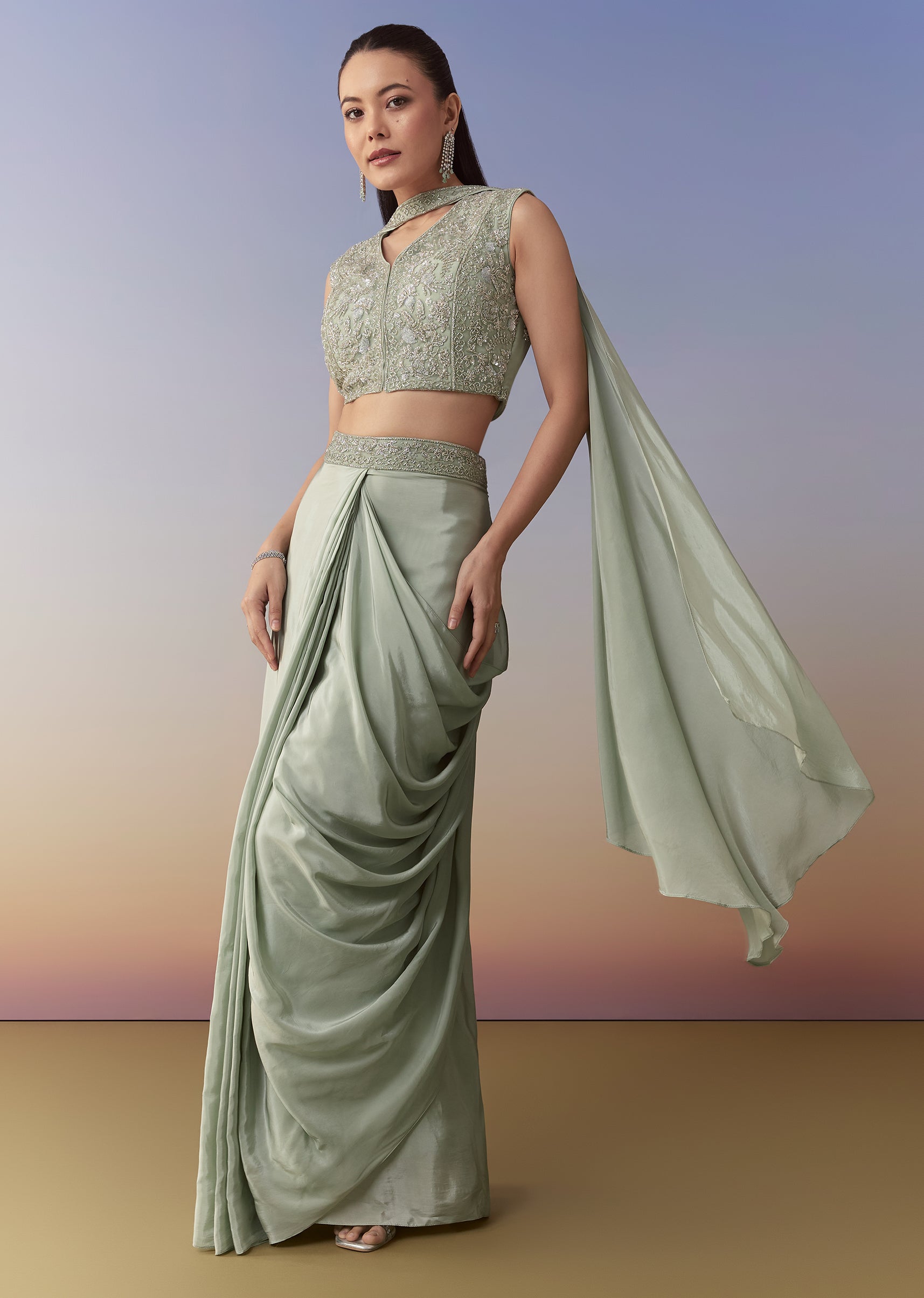 Step into contemporary elegance with this green drape-skirt set, featuring a beautifully embellished crop top adorned with cutdana and sequin work for a radiant festive sparkle. The stylish cowl-drape skirt... More Product Details