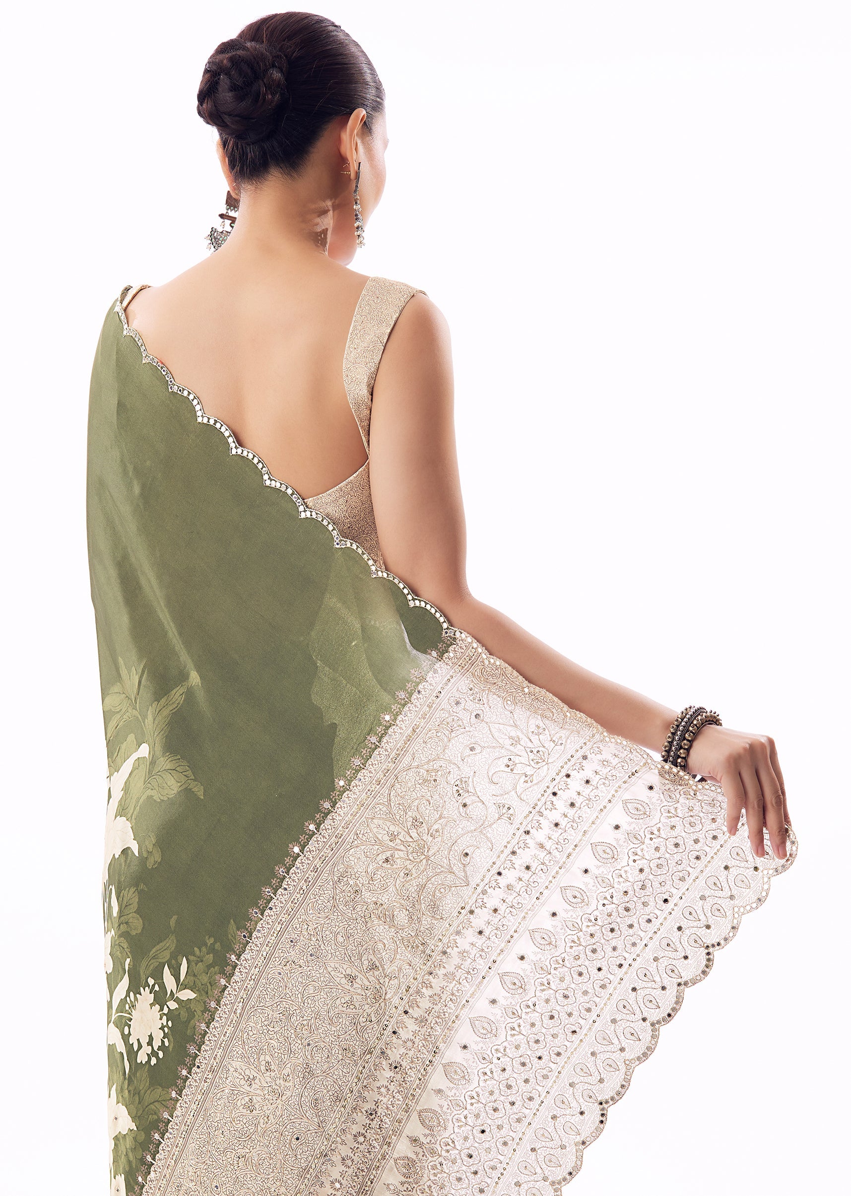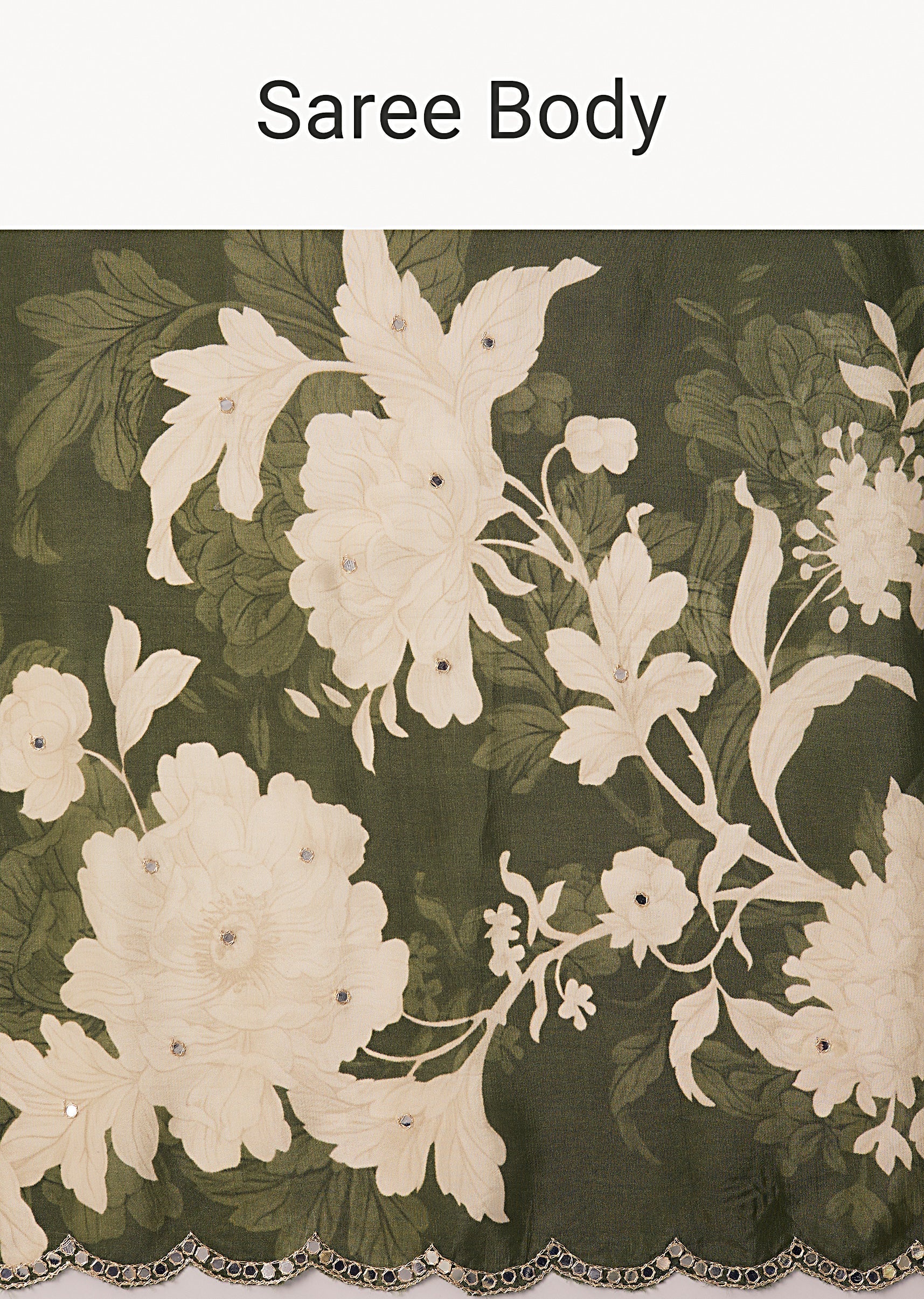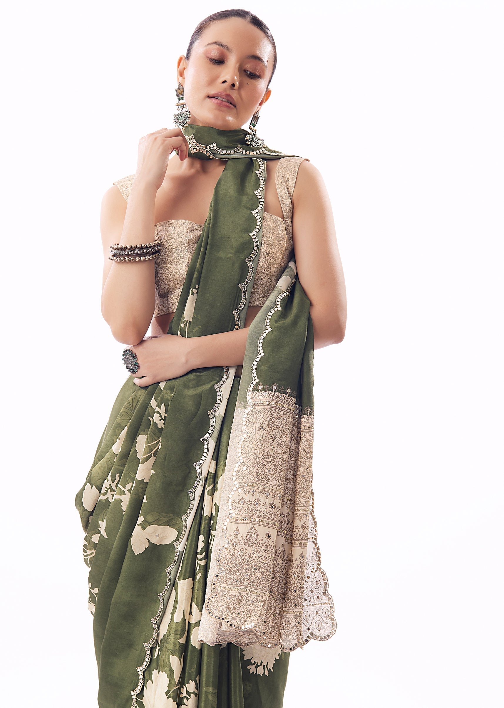 Mehendi Green Floral Printed Saree With Mirror Embroidered Pallu And Scallop Border