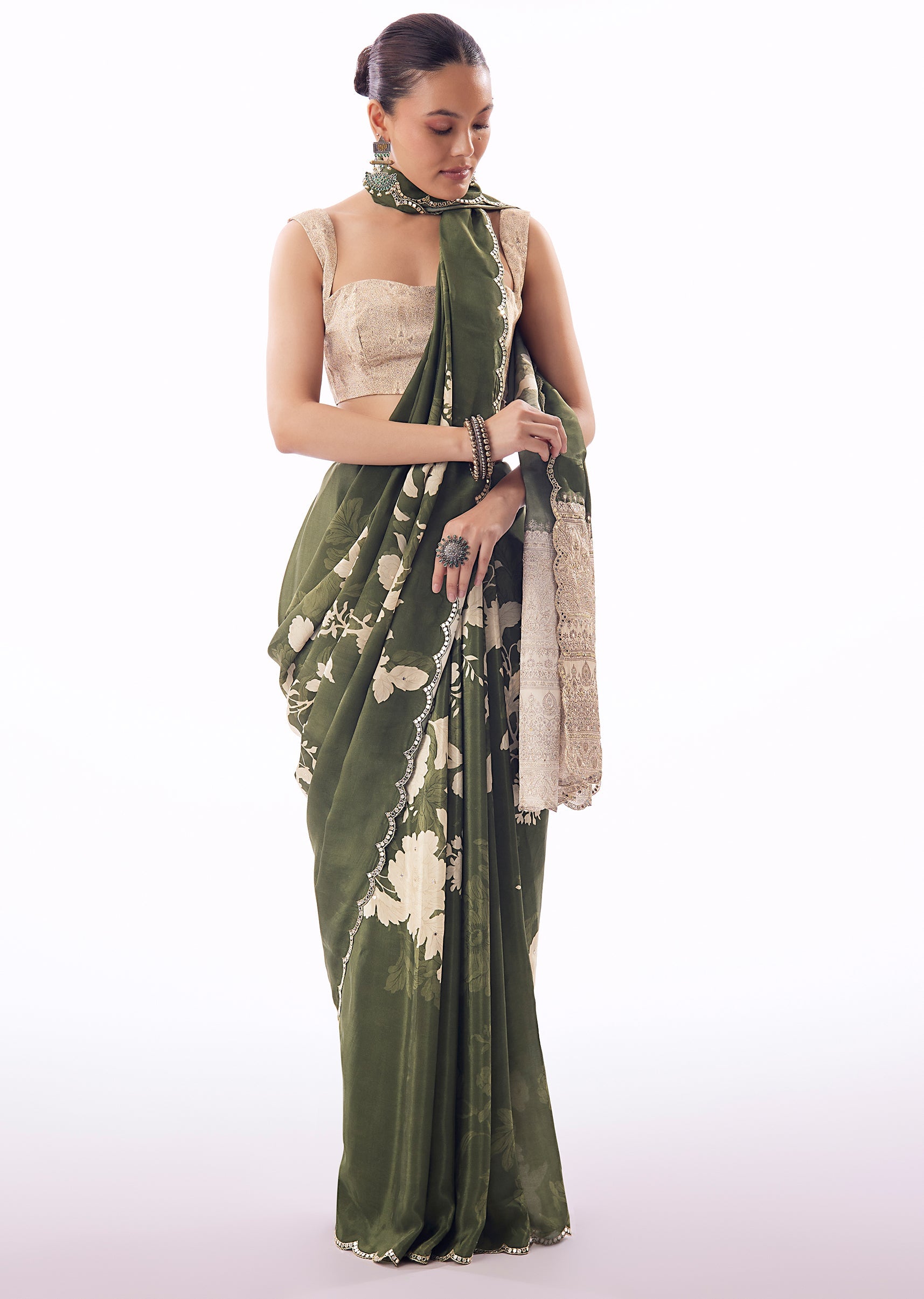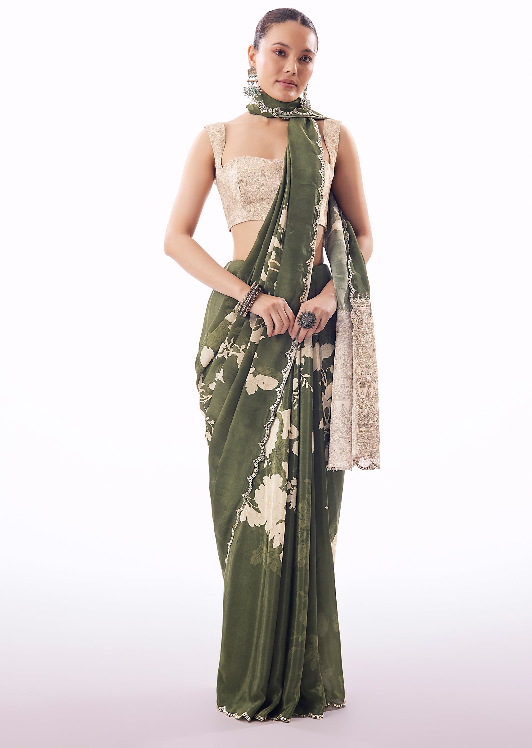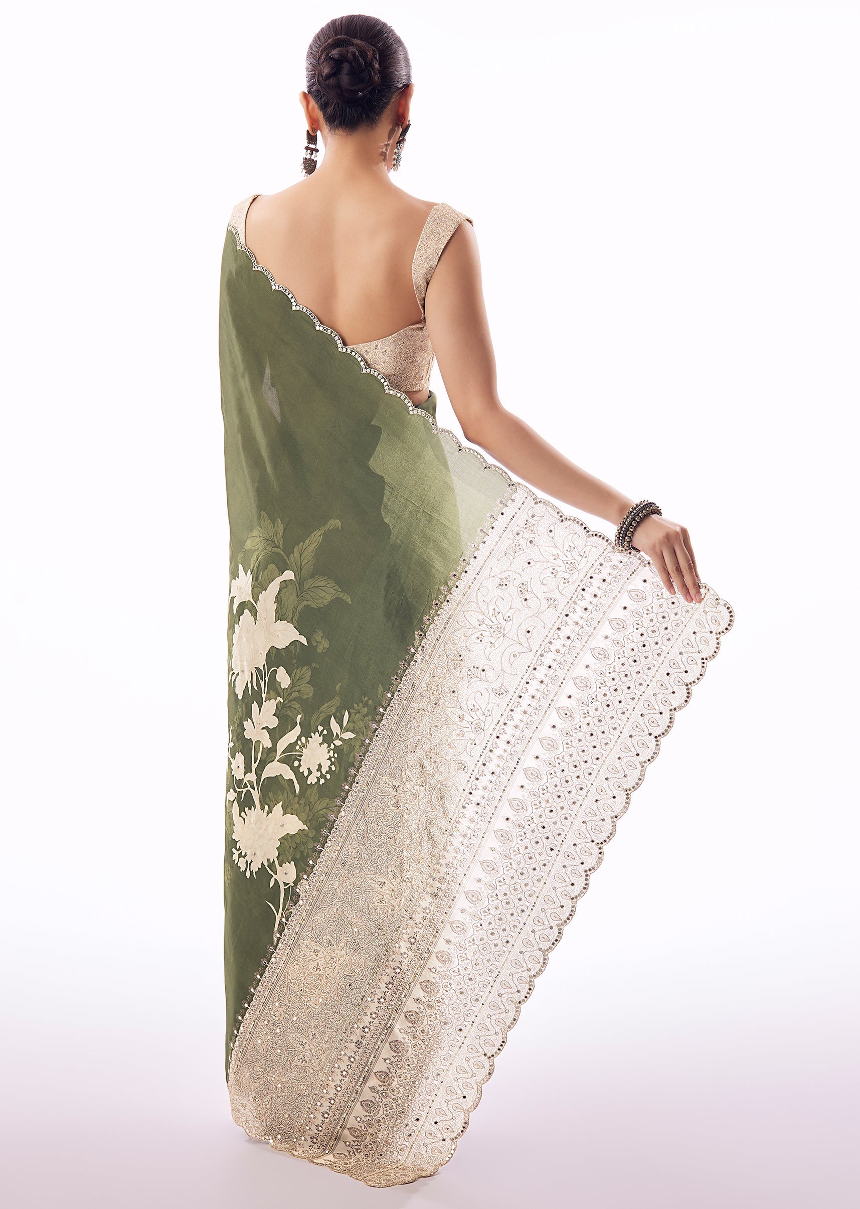 Mehendi Green Floral Printed Saree With Mirror Embroidered Pallu And Scallop Border