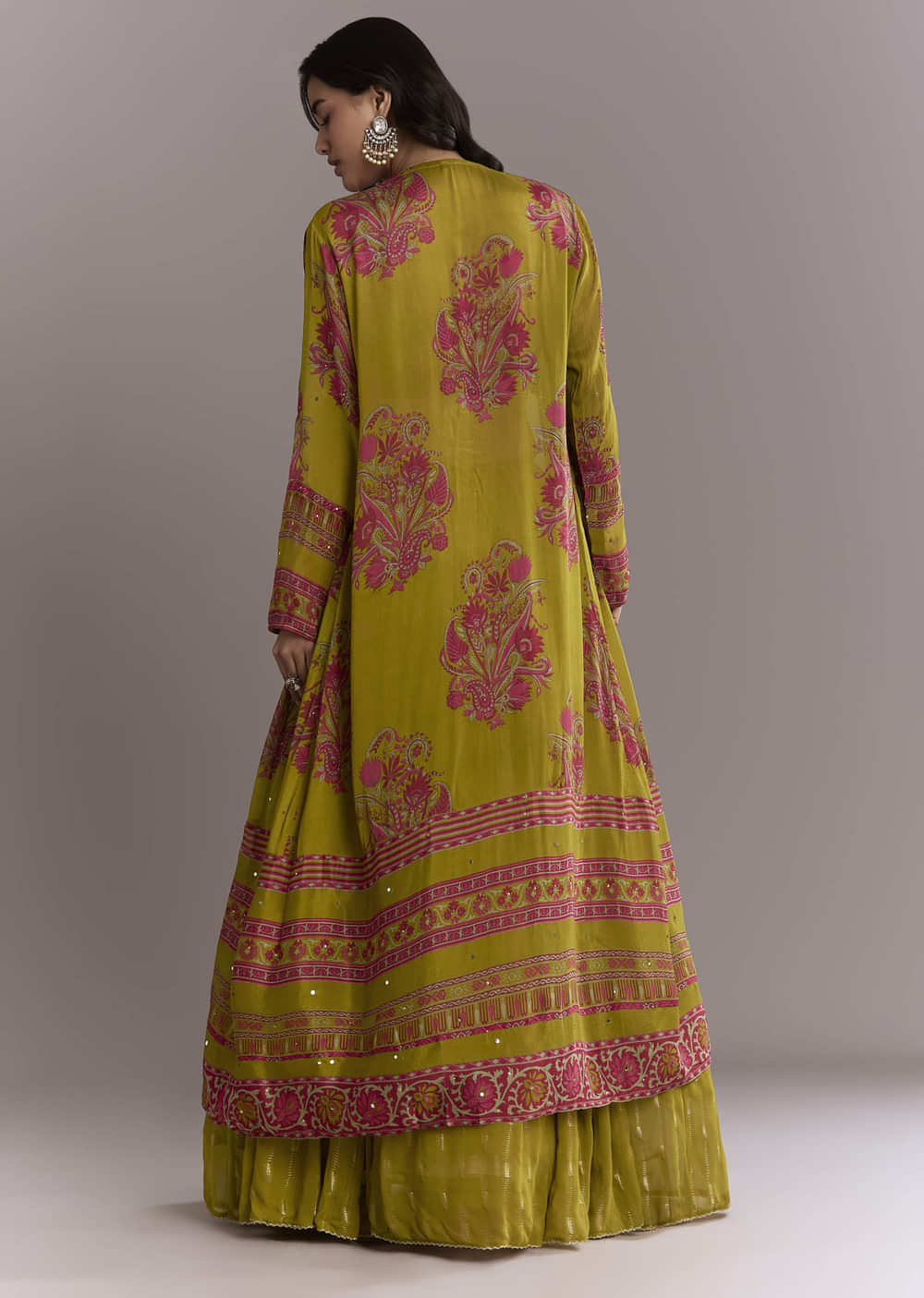Easy, breezy layers define this mehendi green georgette crop top and printed skirt set, topped with a light jacket for movement. The crop top sparkles with cutdana and sequins, while... More Product Details