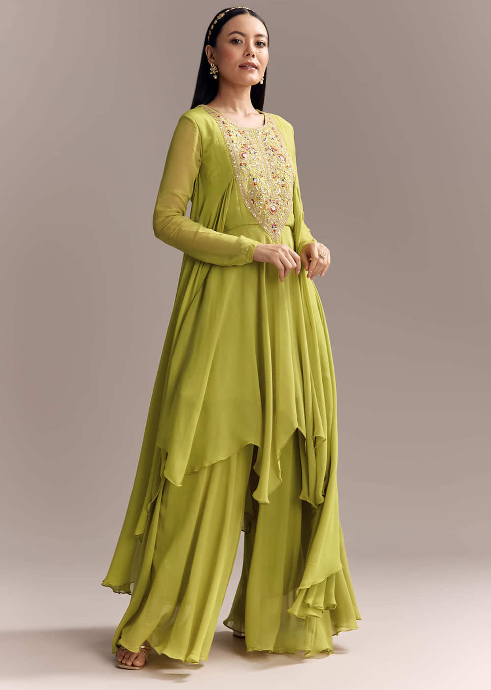 Fresh and modern, this mehendi green georgette kurta and palazzo set moves easily with layered swish. Zari and resham embroidery highlight the asymmetrical kurta for depth that reads elegant, not loud. Great for a wedding guest at mehendi or haldi when you want polish and movement. Awarded as the Most Trusted Brand, we're delivering styles you love, just as promised.