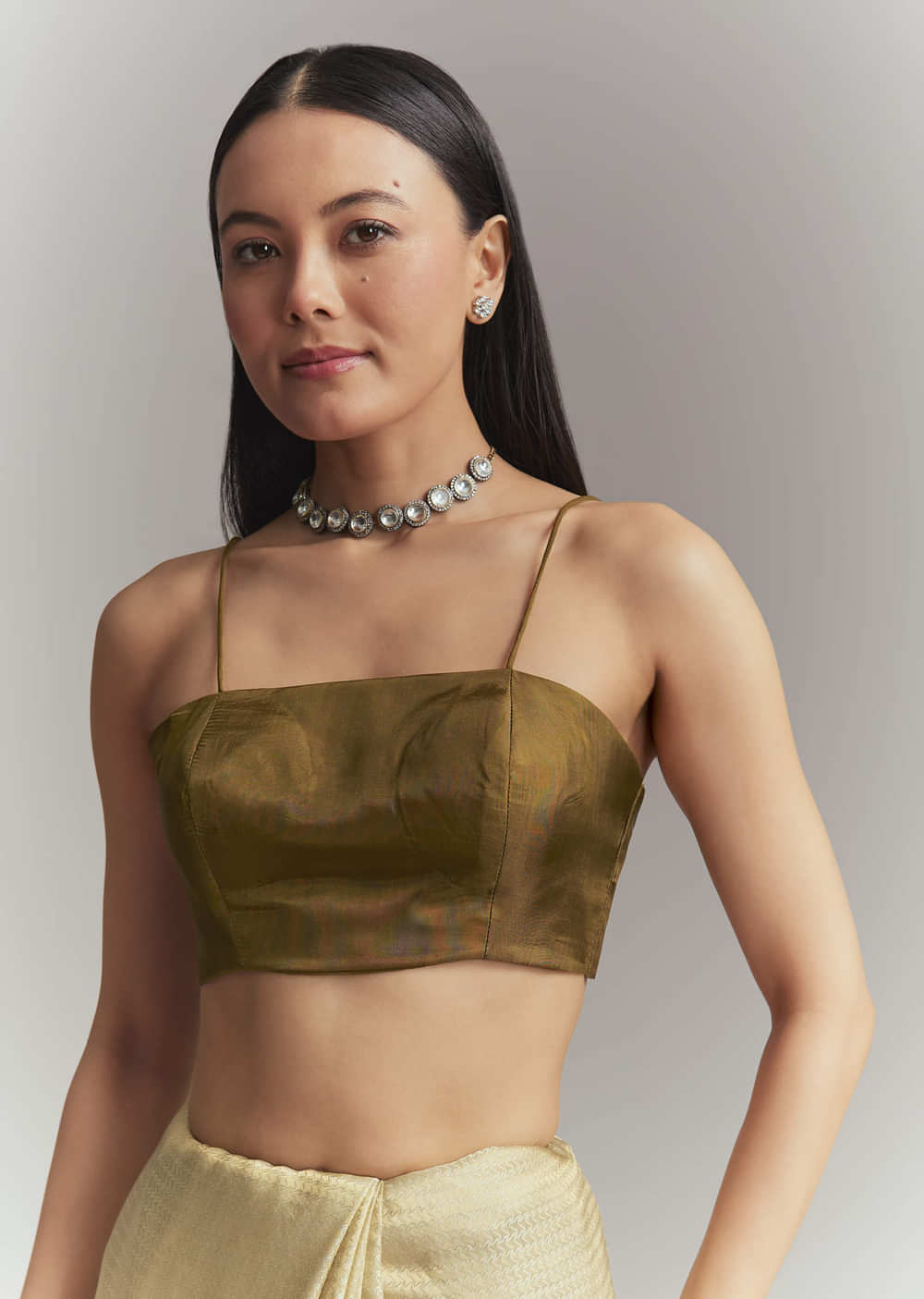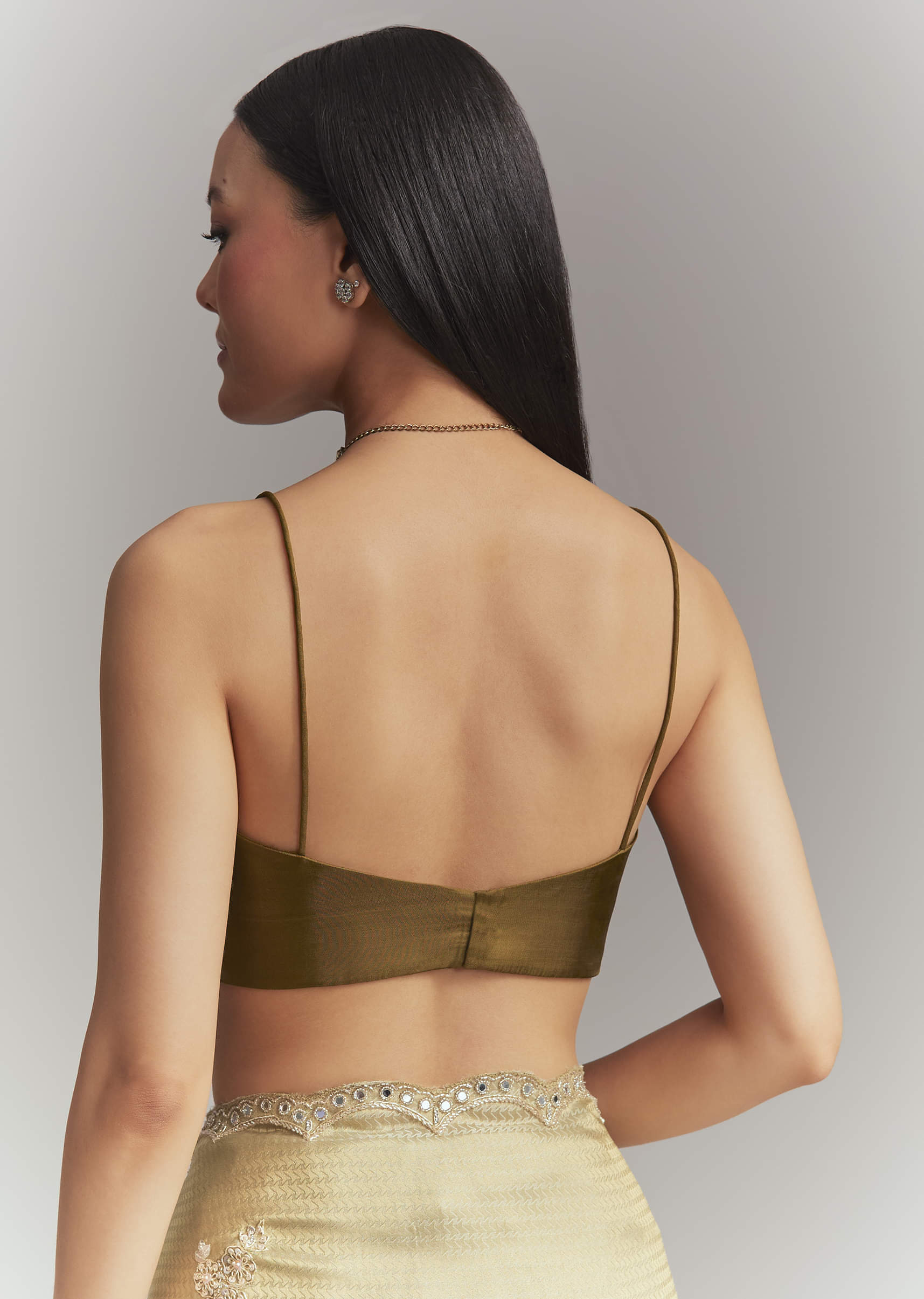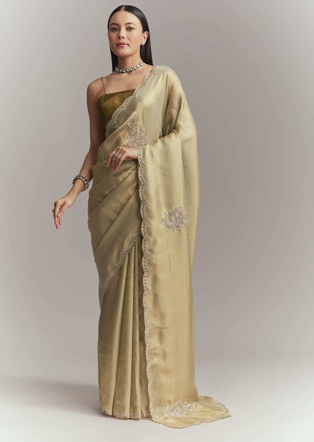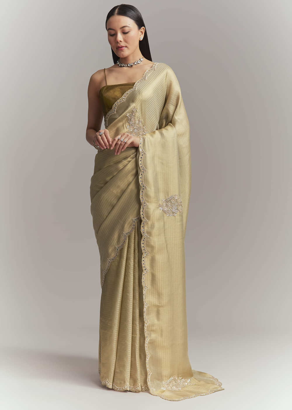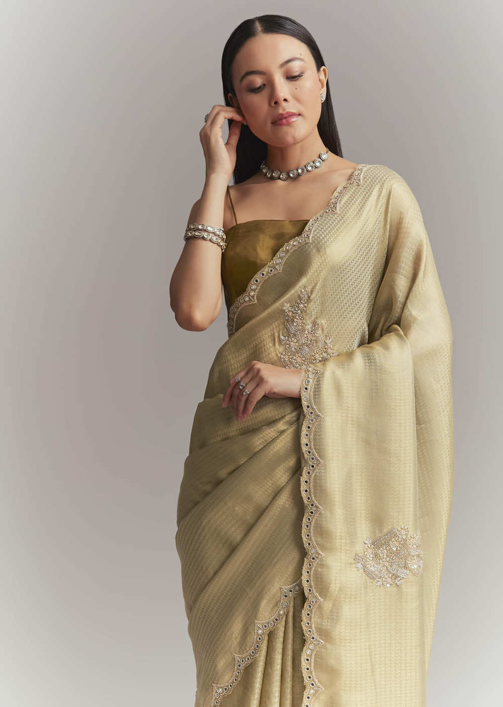 Earthy shades carry festive richness, and this mehendi green jacquard tissue embroidered saree shows it perfectly. Zardosi, mirror and sequins embroidery fill the scallop border and buttis for a handcrafted... More Product Details