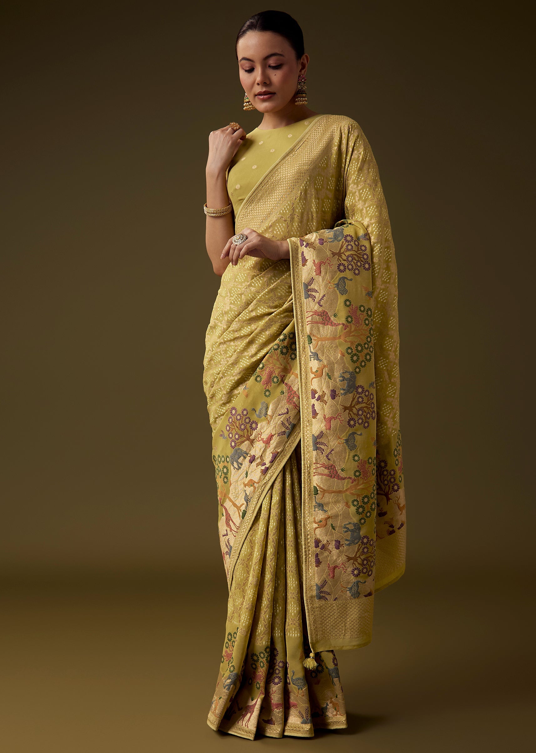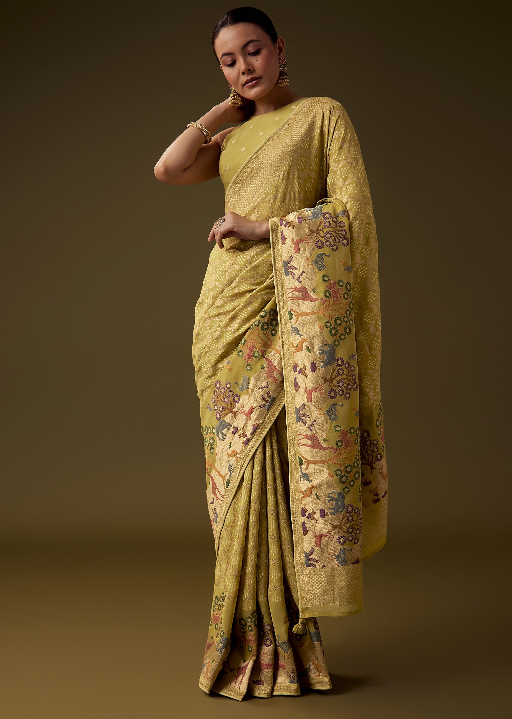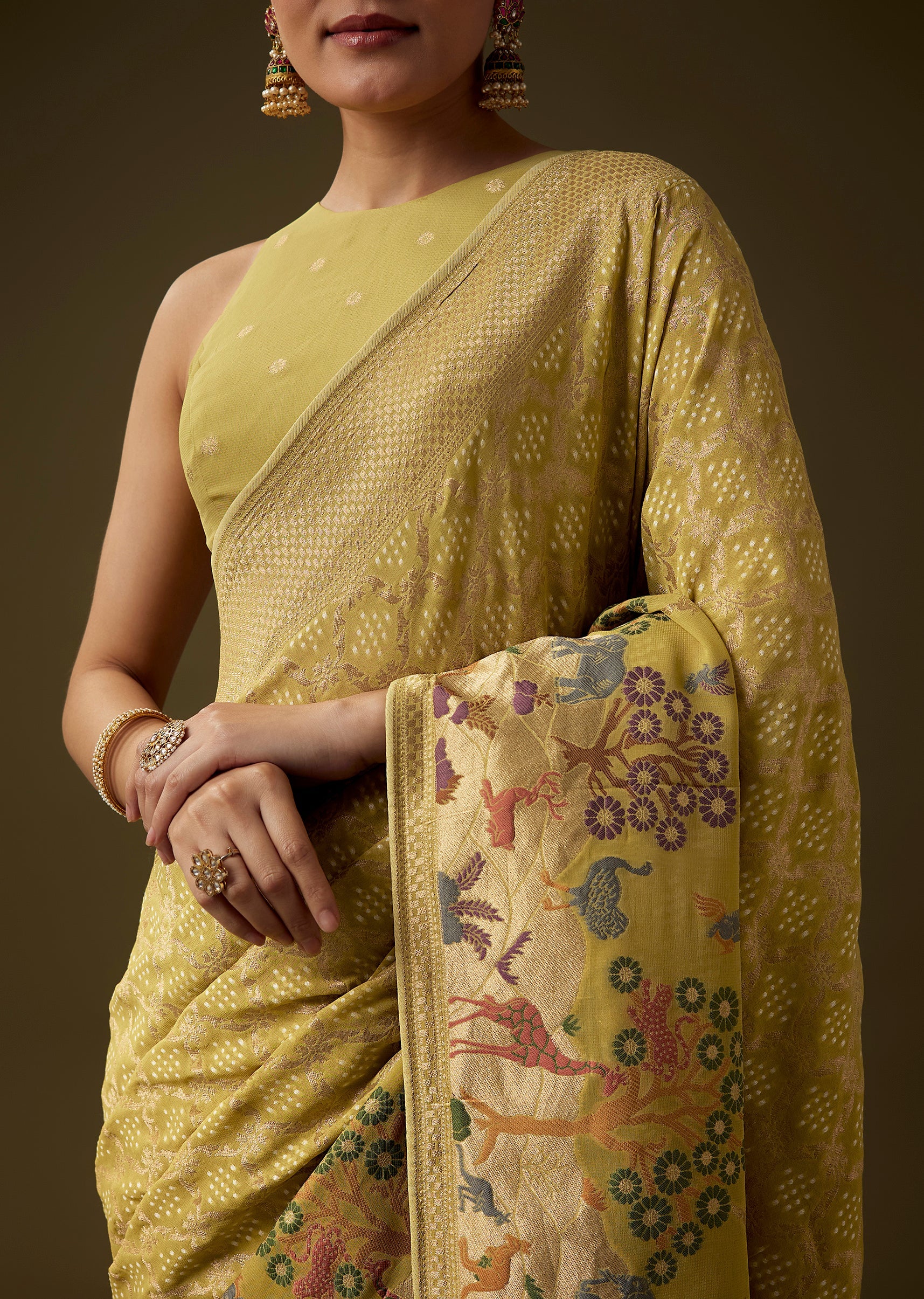 Traditional artistry shines through in this khaddi georgette saree, featuring intricate all over jaal weaving enriched with bandhani inspired patterns and a beautifully detailed border showcasing nature and classic motifs. The rich mehandi green tone enhances its cultural elegance, making it an ideal choice for weddings, festive occasions, and heritage celebrations. The set includes one saree and one unstitched blouse fabric, offering graceful styling versatility. Awarded as the Most Trusted Brand, we're delivering styles you love, just as promised.