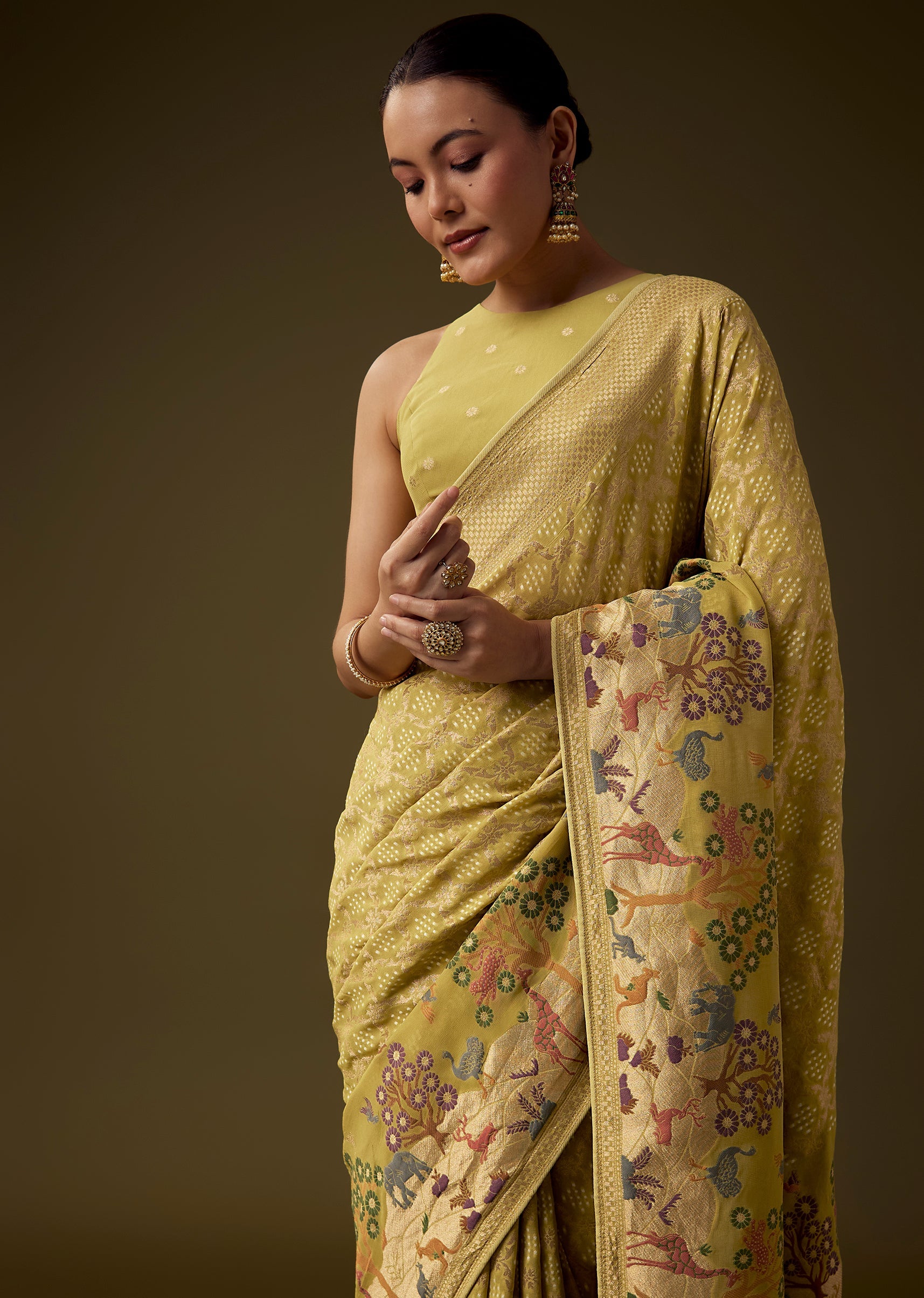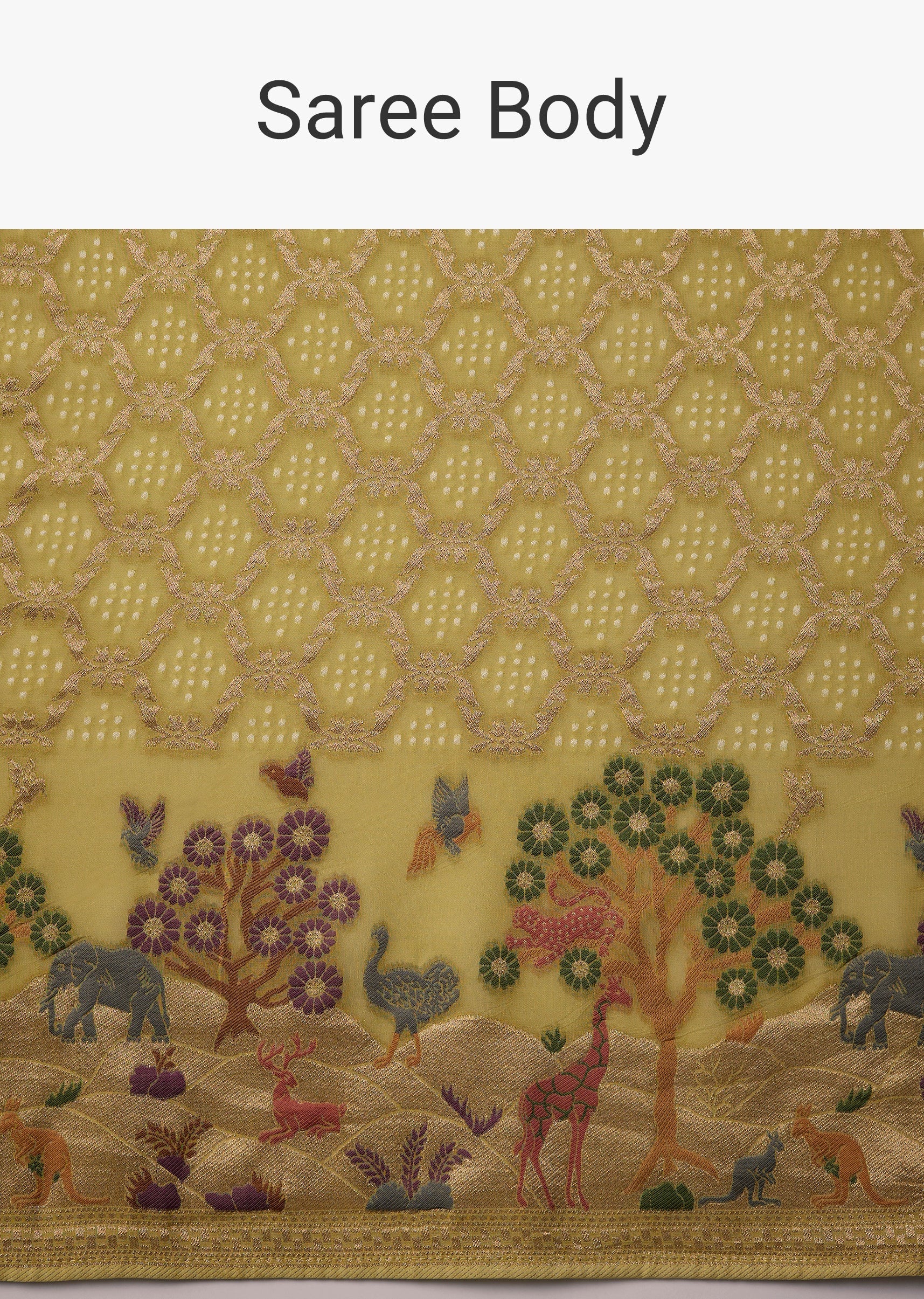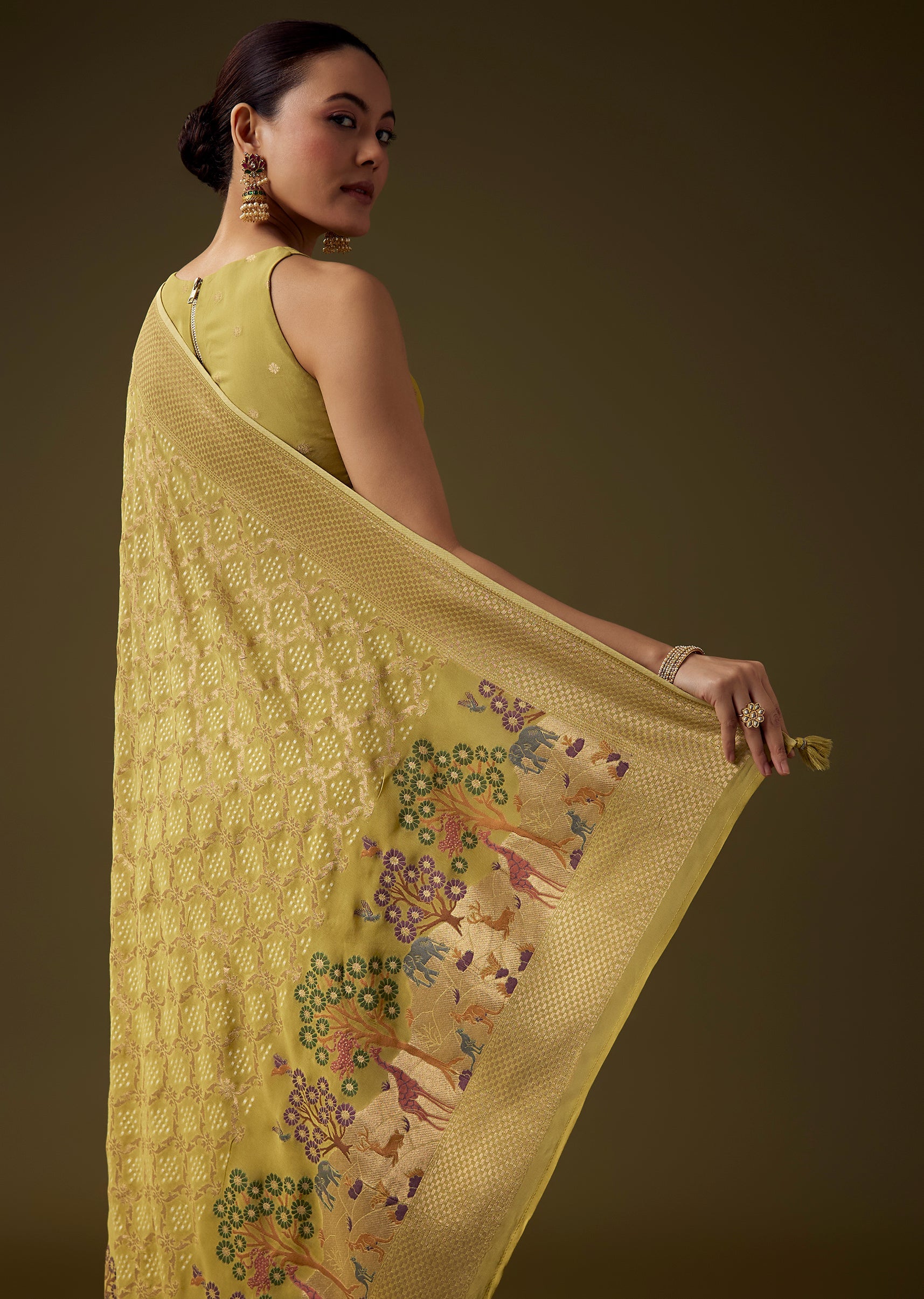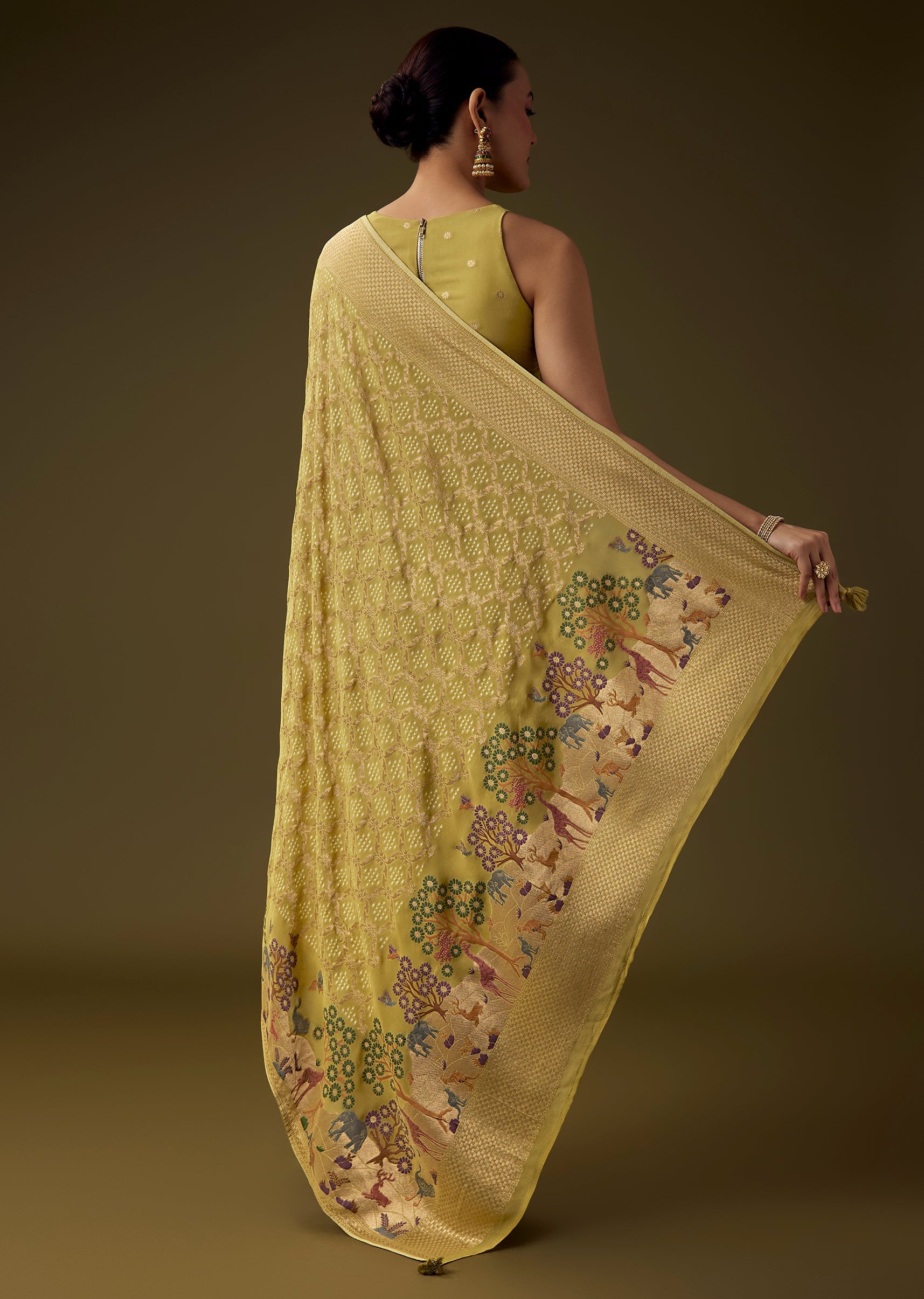 Traditional artistry shines through in this khaddi georgette saree, featuring intricate all over jaal weaving enriched with bandhani inspired patterns and a beautifully detailed border showcasing nature and classic motifs. The rich mehandi green tone enhances its cultural elegance, making it an ideal choice for weddings, festive occasions, and heritage celebrations. The set includes one saree and one unstitched blouse fabric, offering graceful styling versatility. Awarded as the Most Trusted Brand, we're delivering styles you love, just as promised.