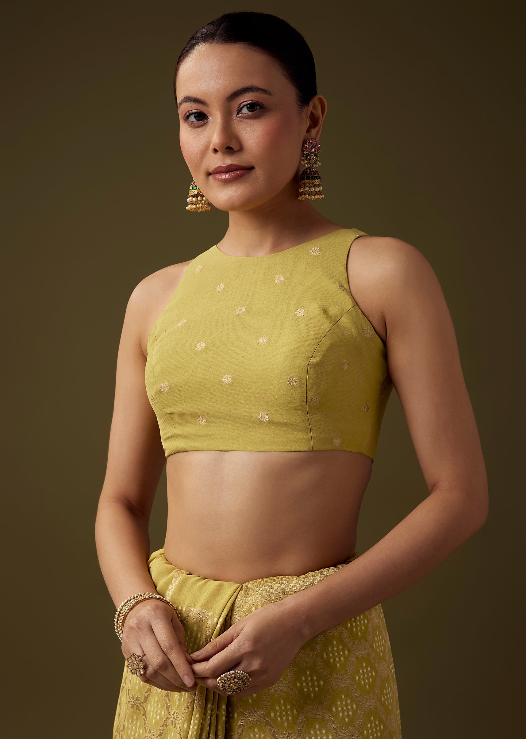 Fit Tips:Keep the pleats neatly defined for a refined drape and opt for a well tailored blouse to balance the saree’s rich woven patterns.