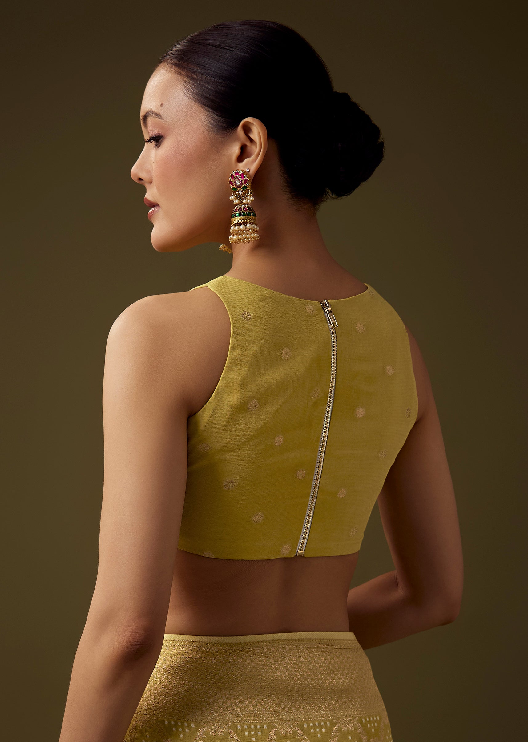 Pair it with antique gold or kundan jewelry, a sleek bun, and soft glowing makeup to highlight its traditional detailing.