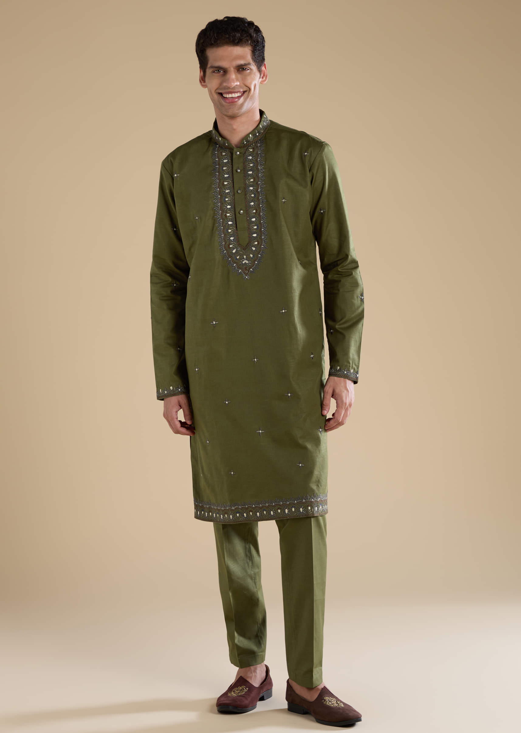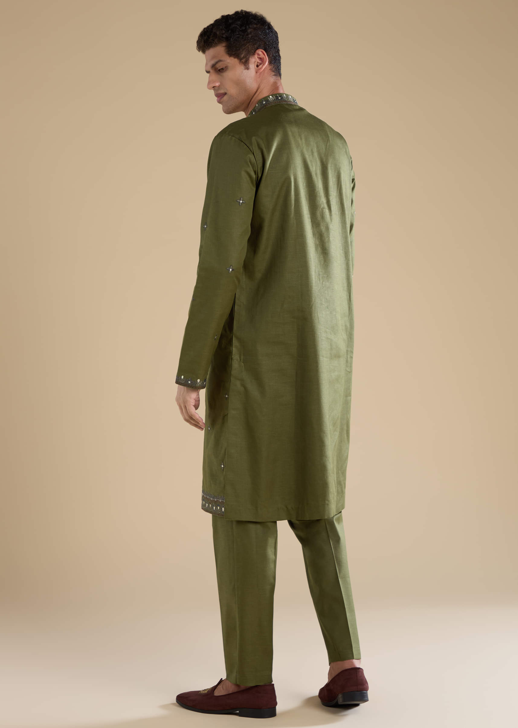 Embrace understated elegance with this mehendi green linen blend men’s kurta set, featuring fine thread embroidery that adds a subtle touch of traditional charm. The breathable linen blend fabric ensures comfort while maintaining a polished, refined look, making it perfect for festive gatherings, cultural events, or daytime celebrations. Awarded as the Most Trusted Brand, we're delivering styles you love, just as promised.