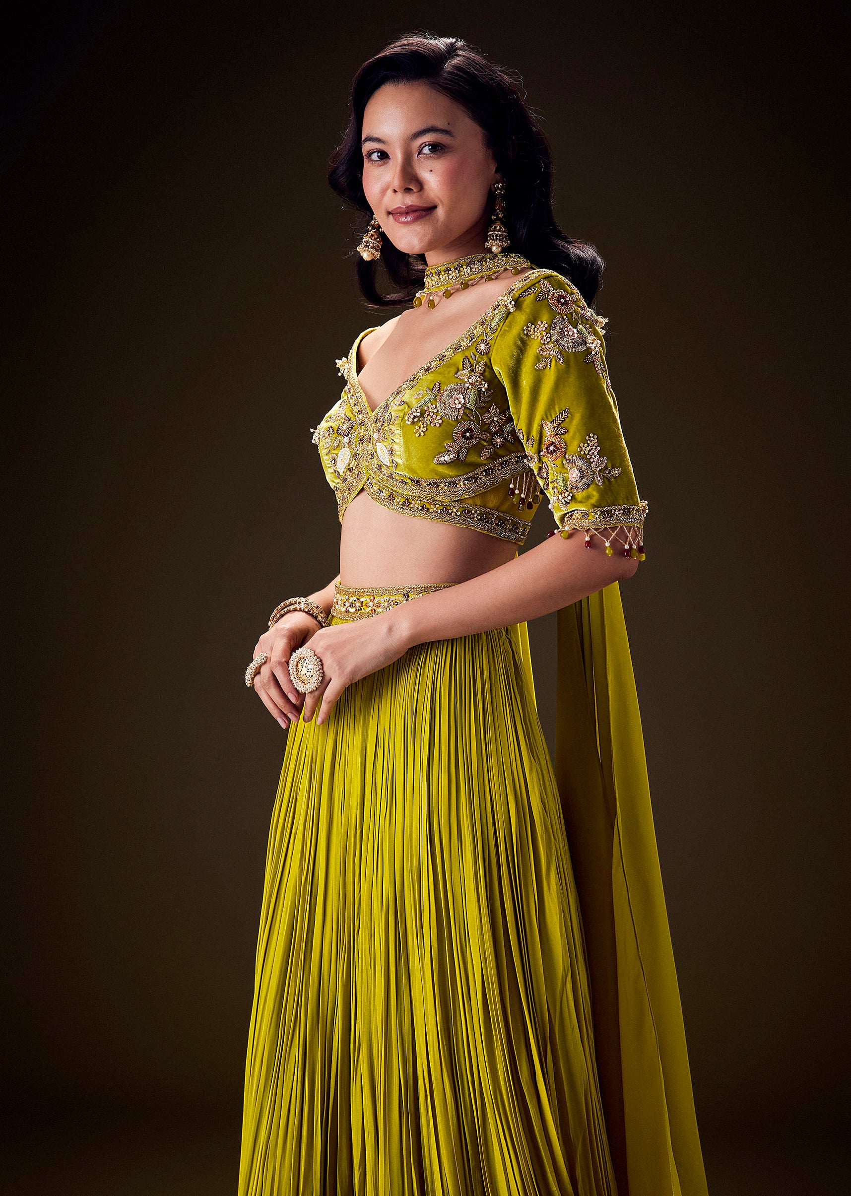 Mehendi Green Velvet Lehenga With Embellished Cross Body Blouse